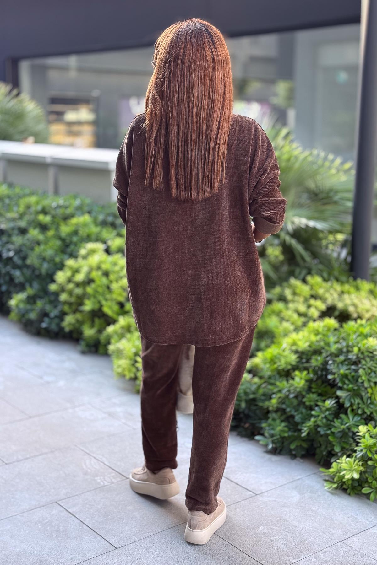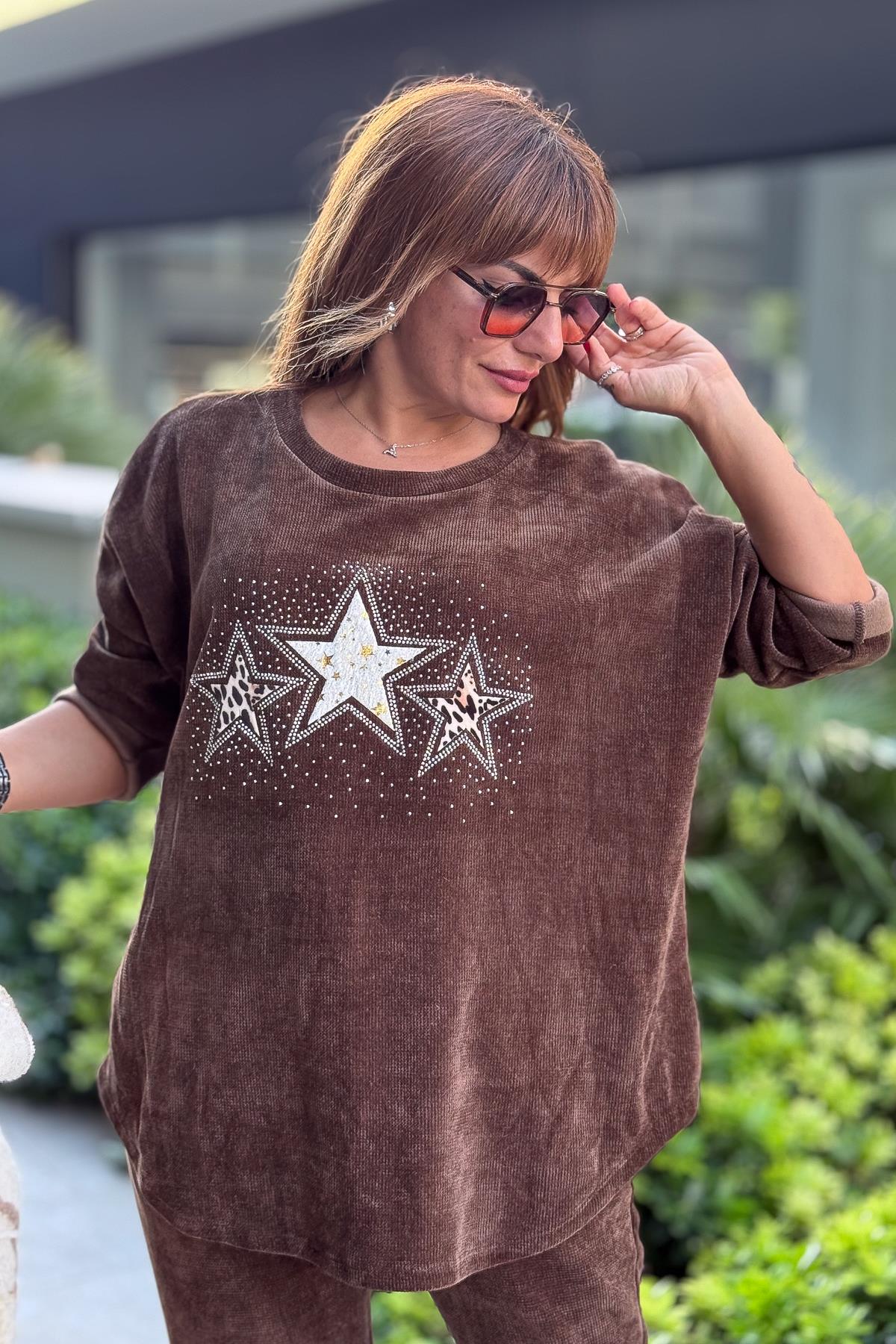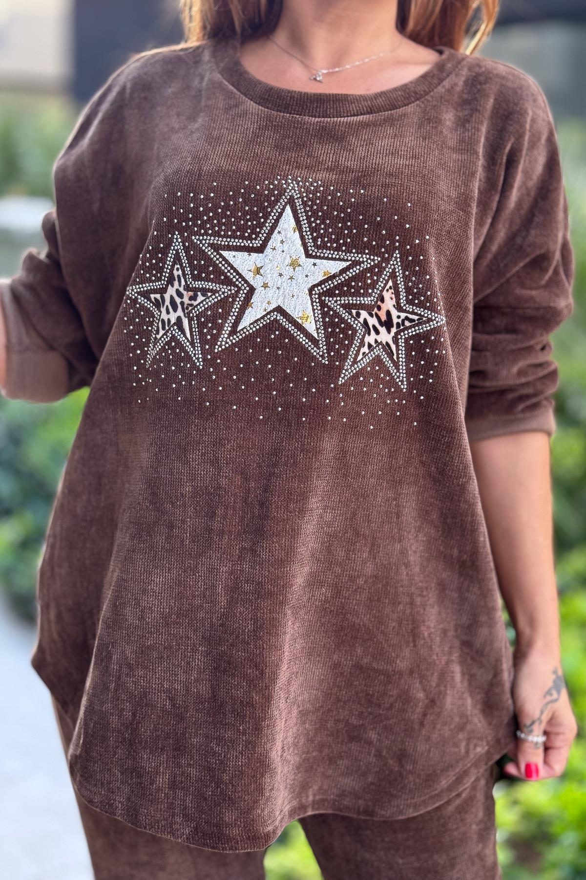 3 Yıldızlı Yuvarlak Yaka Kadife Sweet Kahverengi Renk