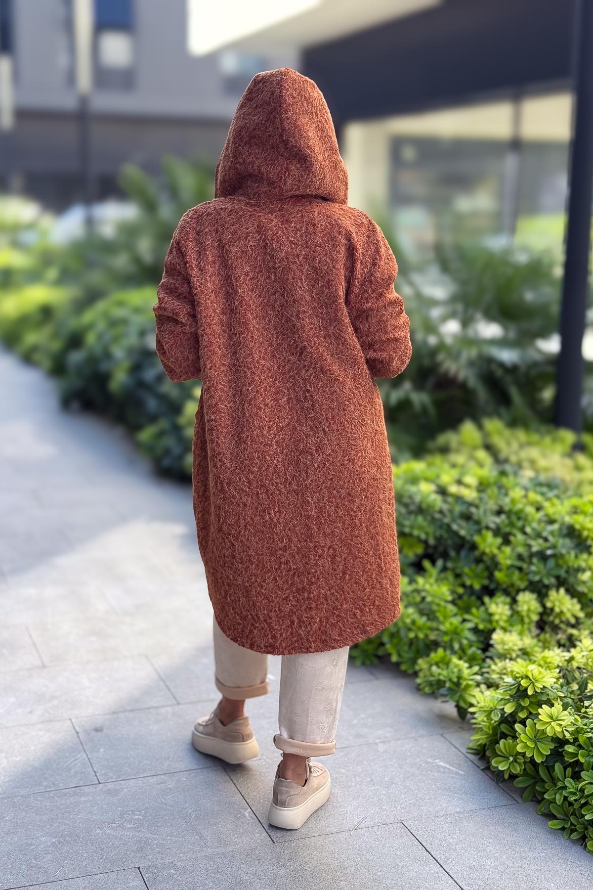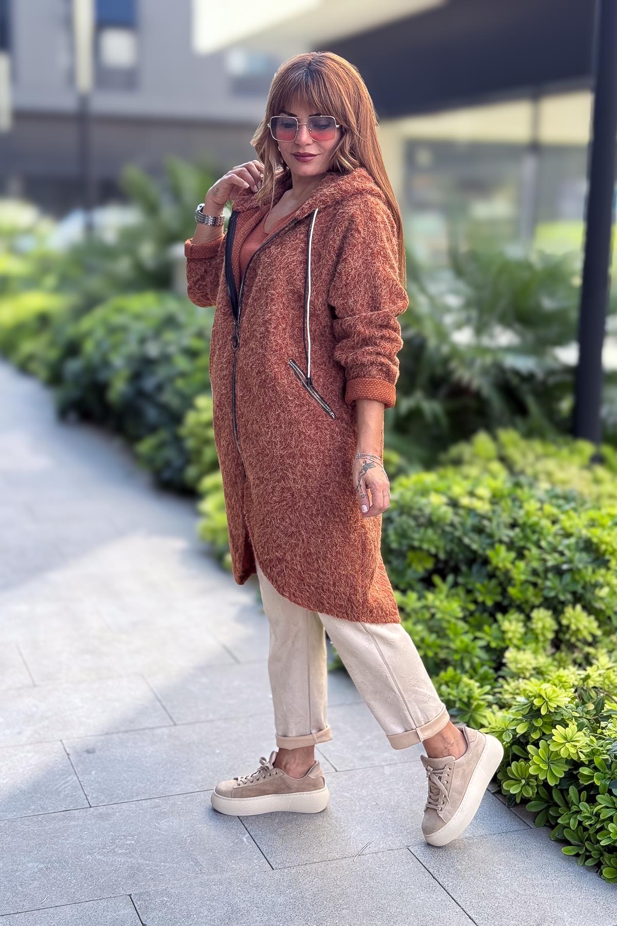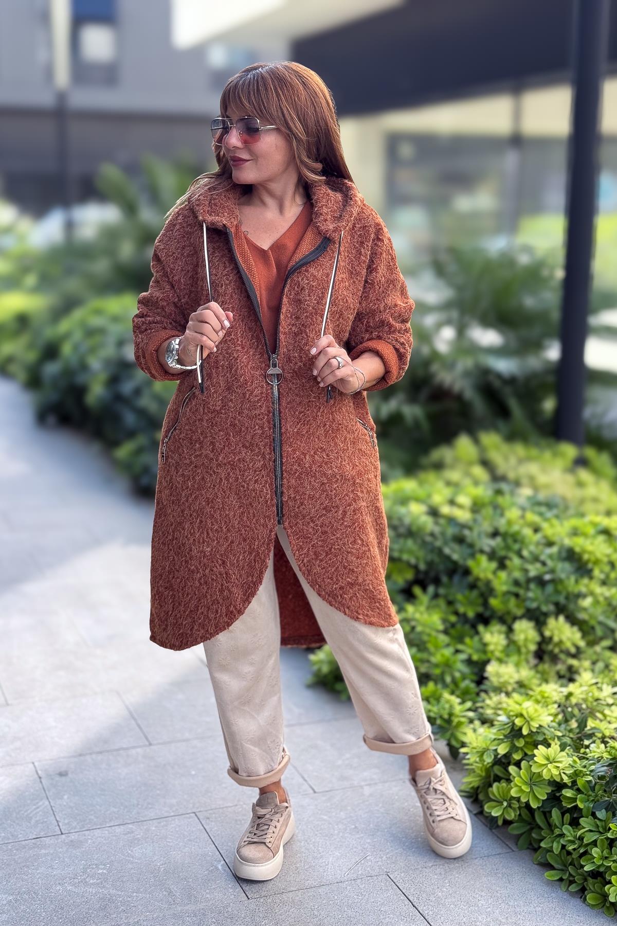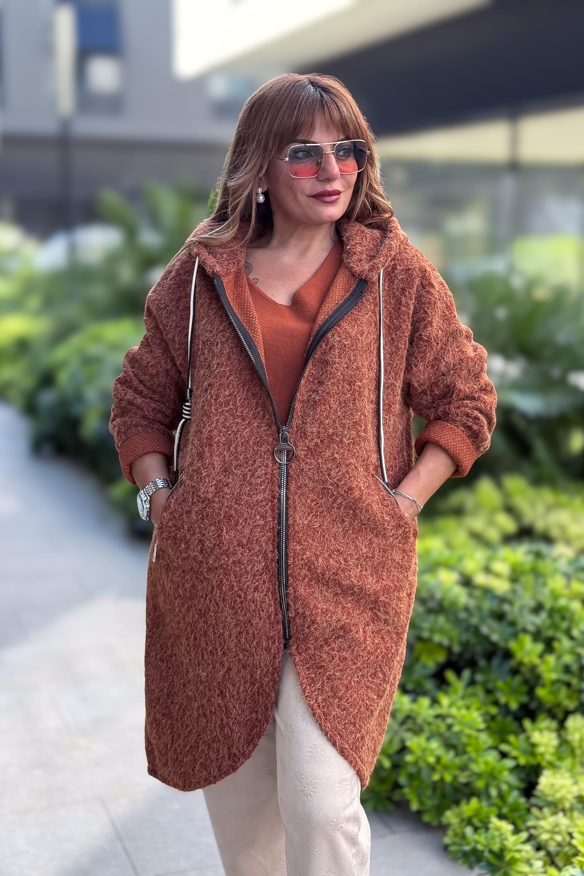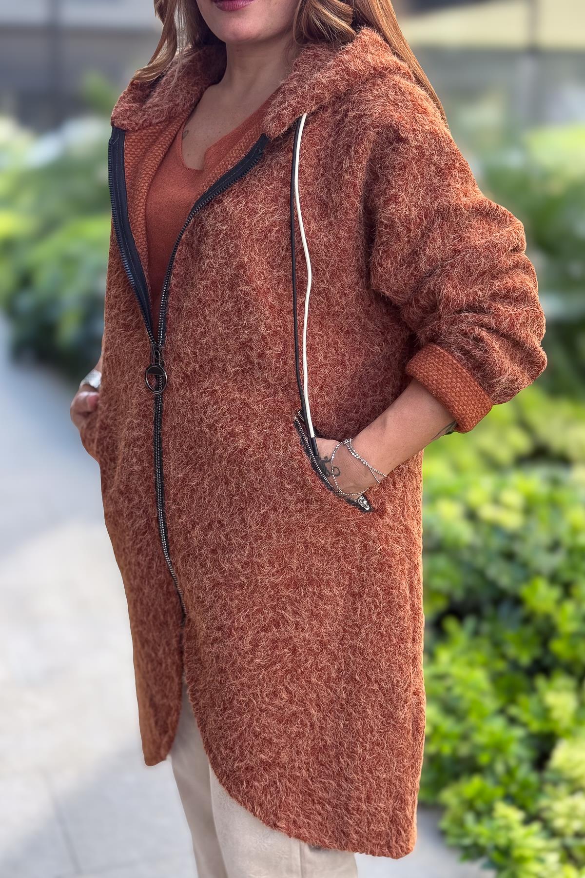 Asimetrik Kesim Fermuarlı Kapüşonlu Keçe Kaban Tarçın Renk