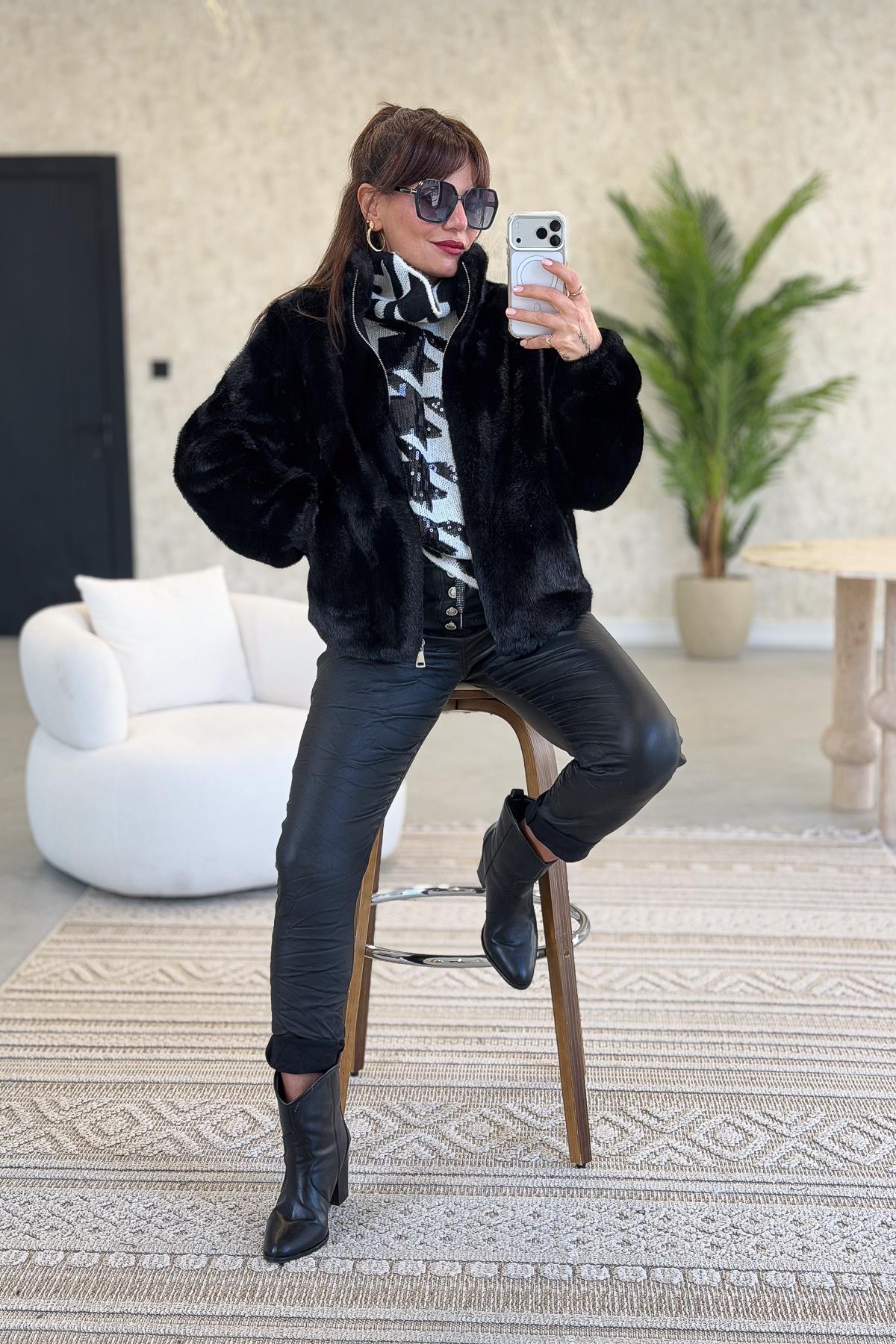 Beli Lastikli Düğme Detaylı Deri Görünümlü Pantolon Siyah Renk