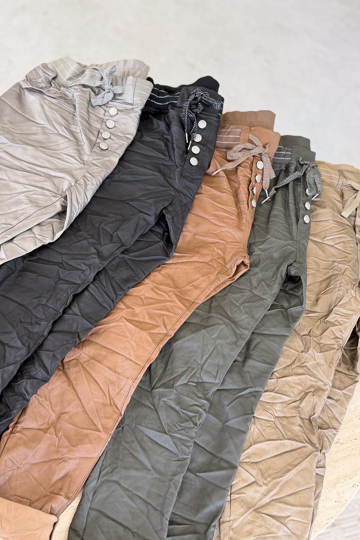 Beli Lastikli Düğme Detaylı Deri Görünümlü Pantolon Vizon Renk