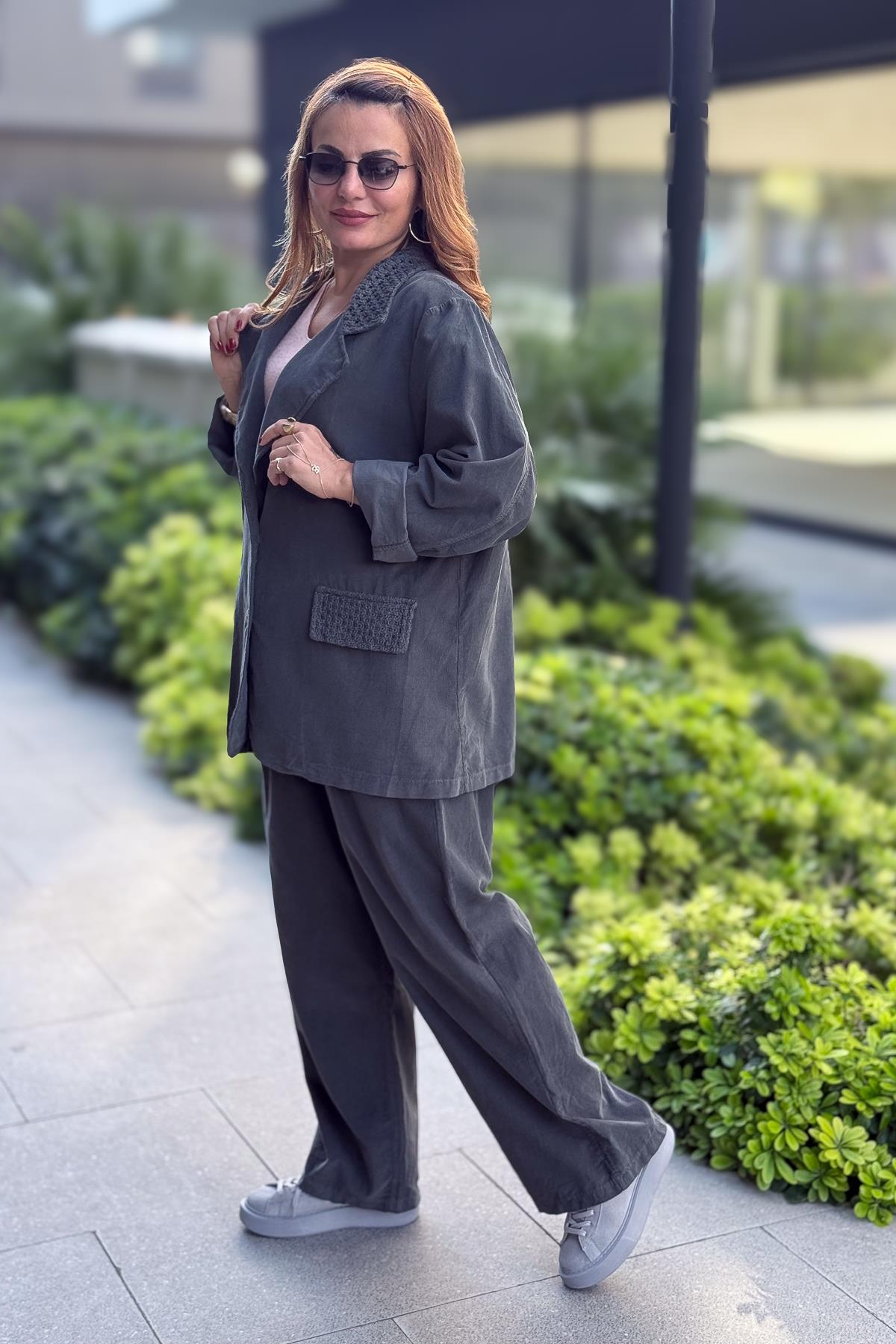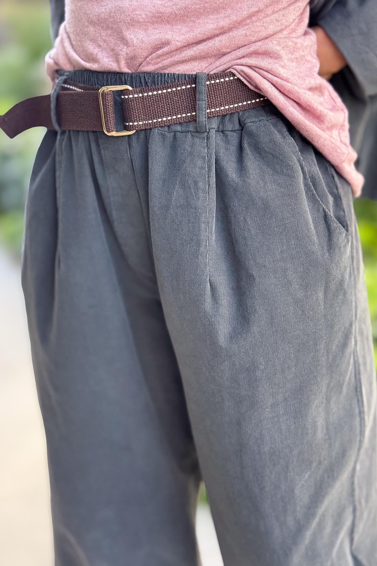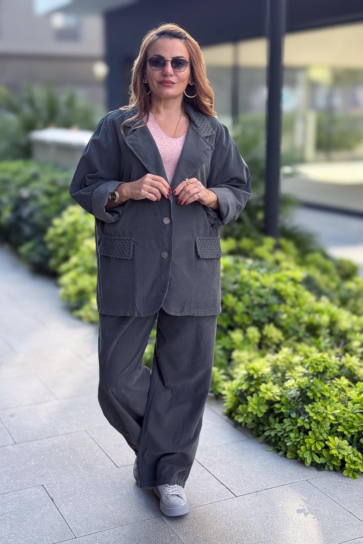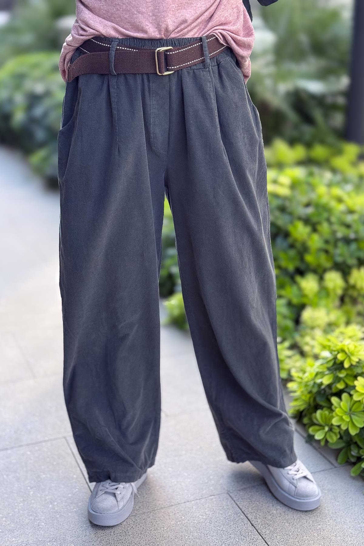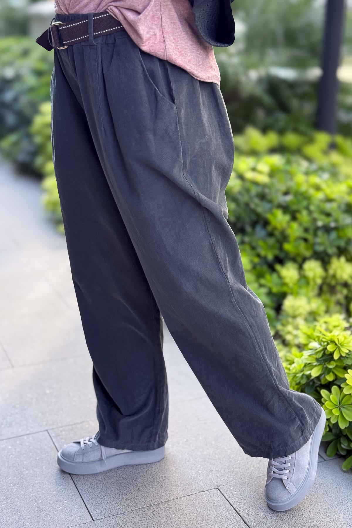 Bol Paça Geniş Kalıp İnce Fitilli Kadife Pantolon Antresit Renk