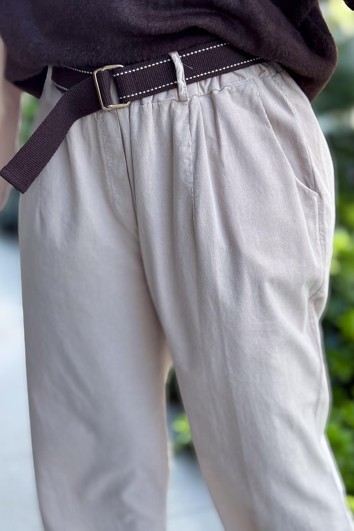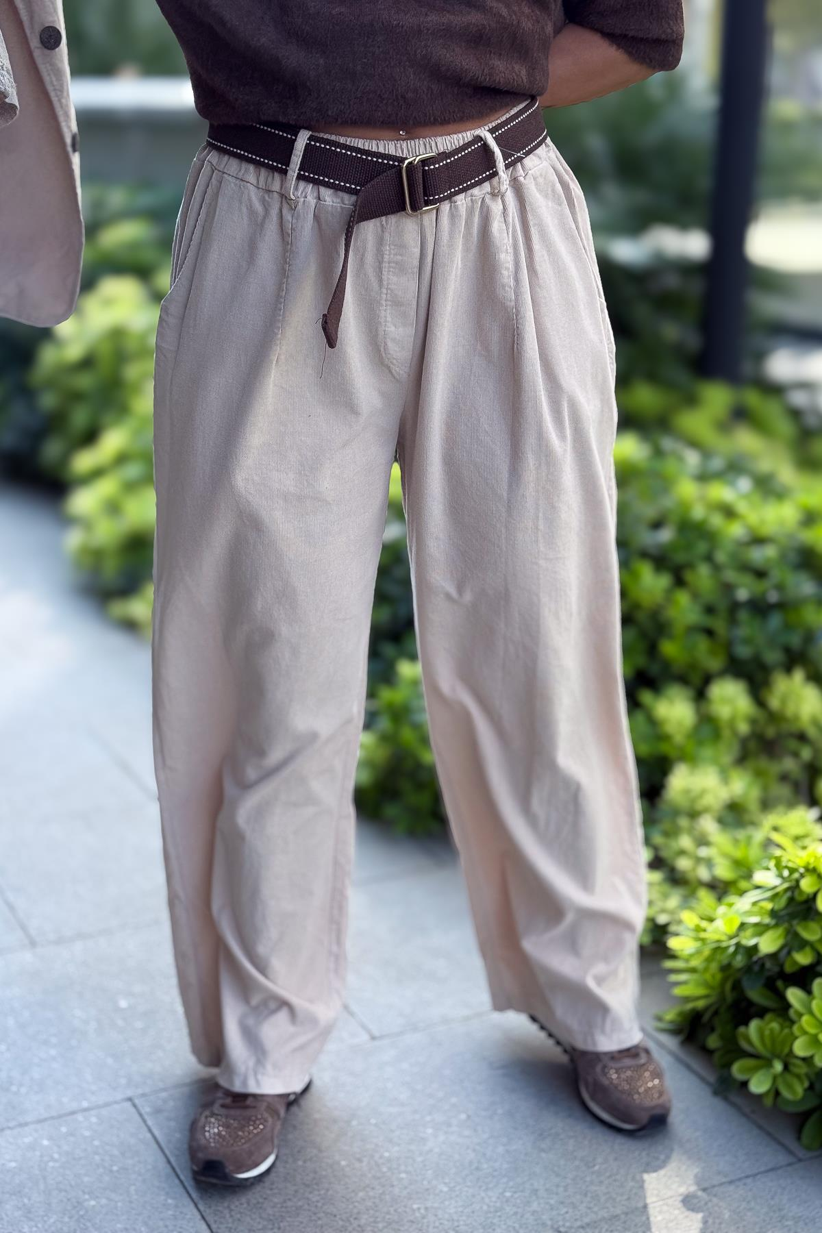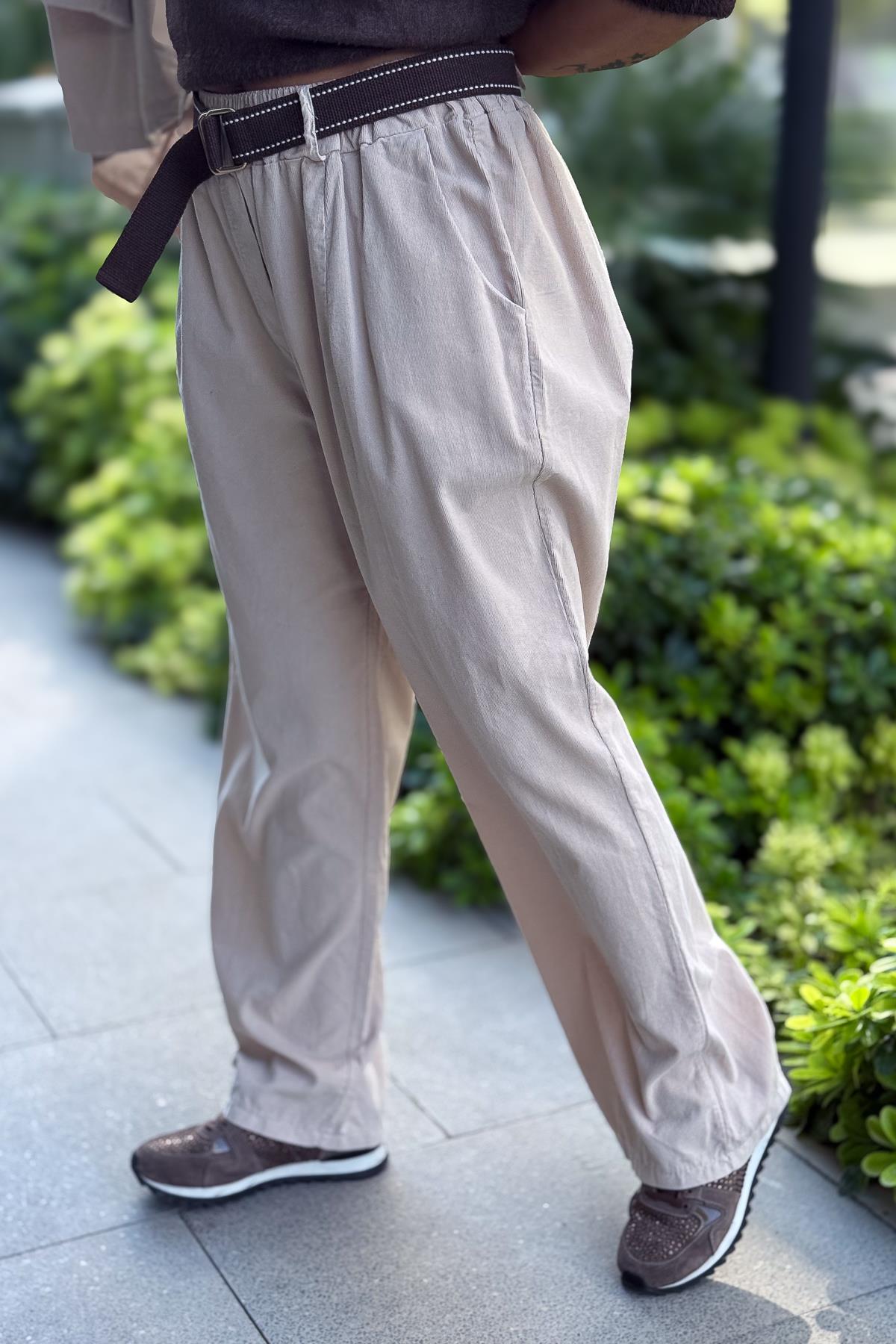 Bol Paça Geniş Kalıp İnce Fitilli Kadife Pantolon Krem Renk