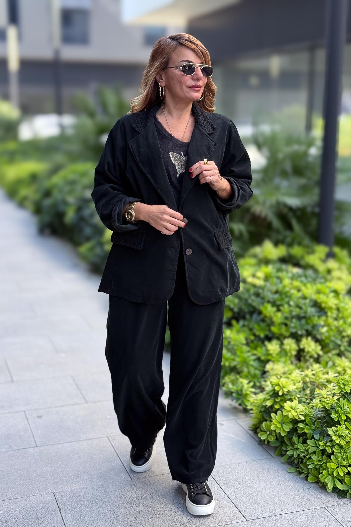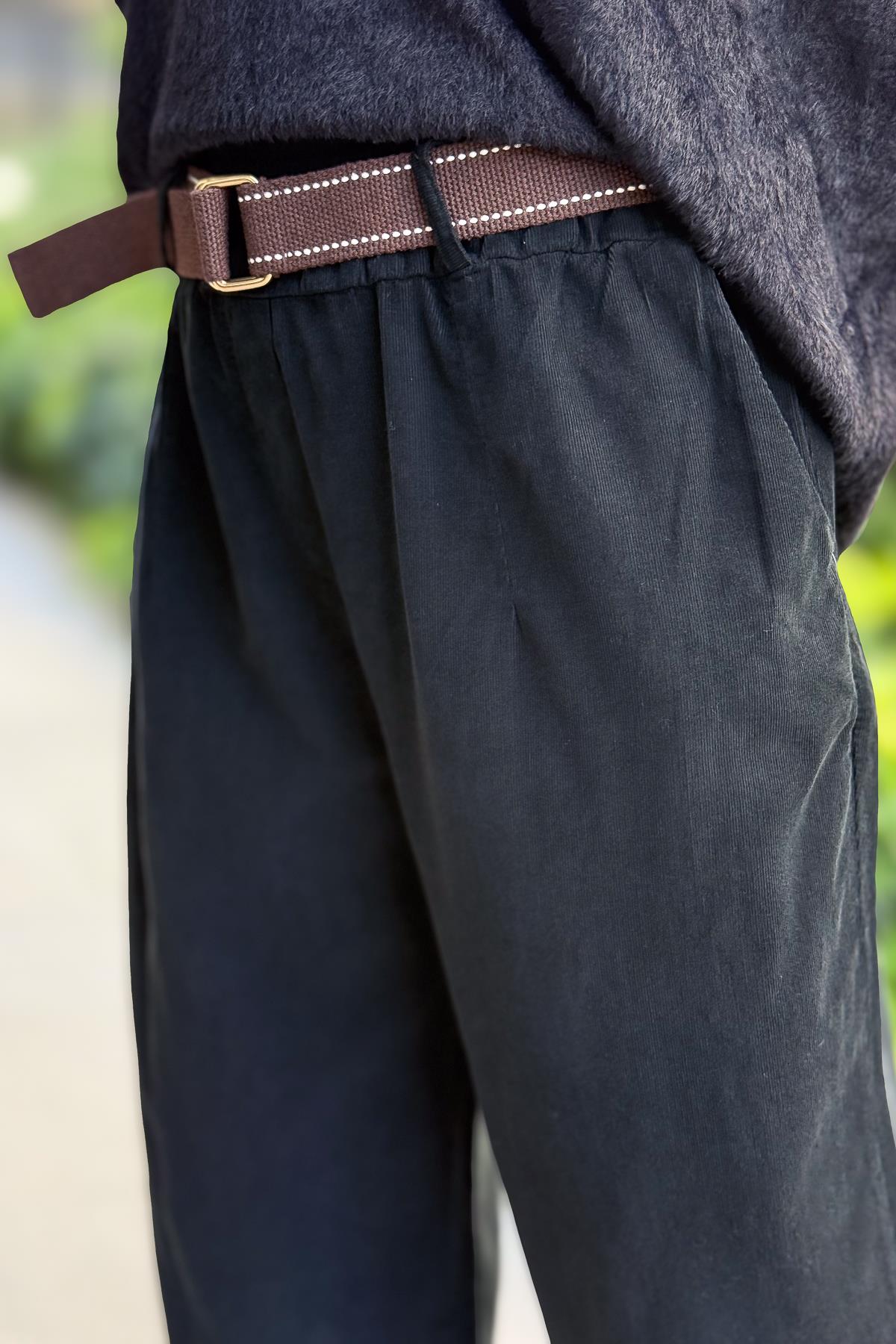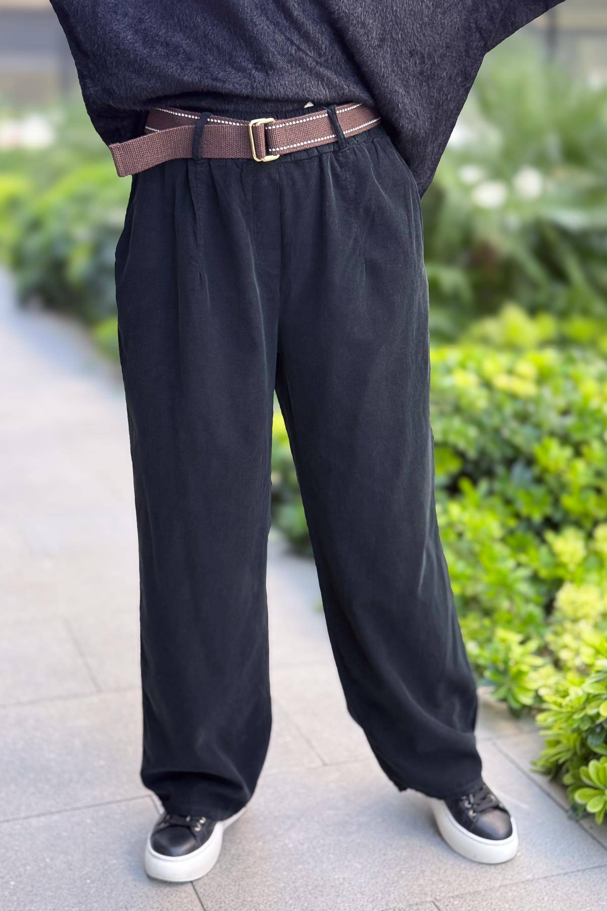 Bol Paça Geniş Kalıp İnce Fitilli Kadife Pantolon Siyah Renk