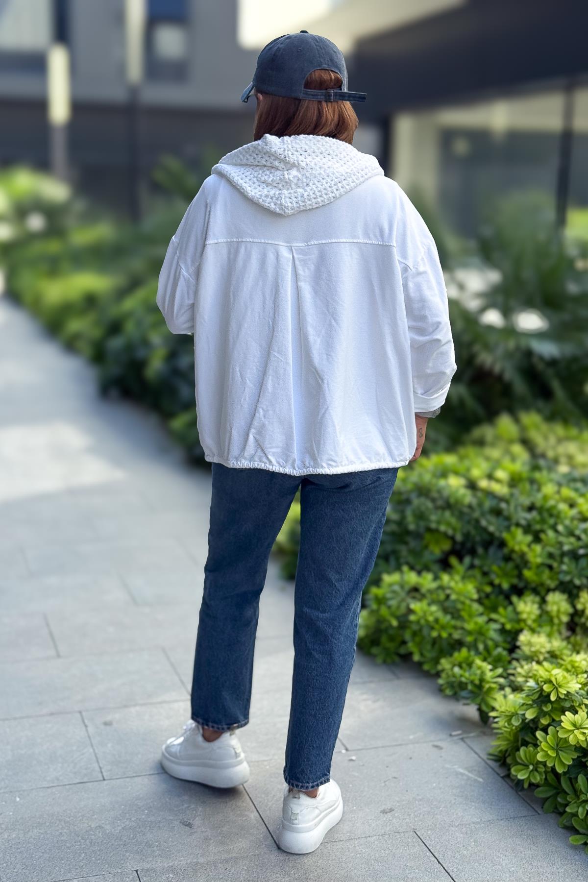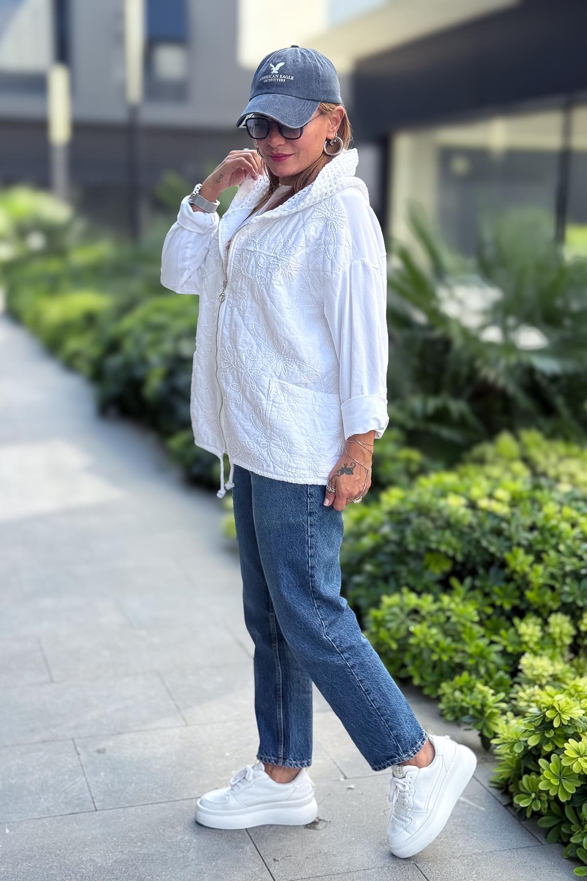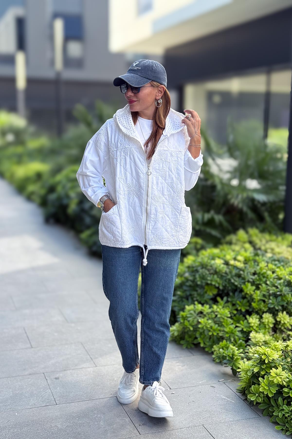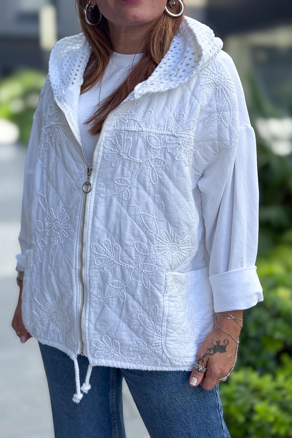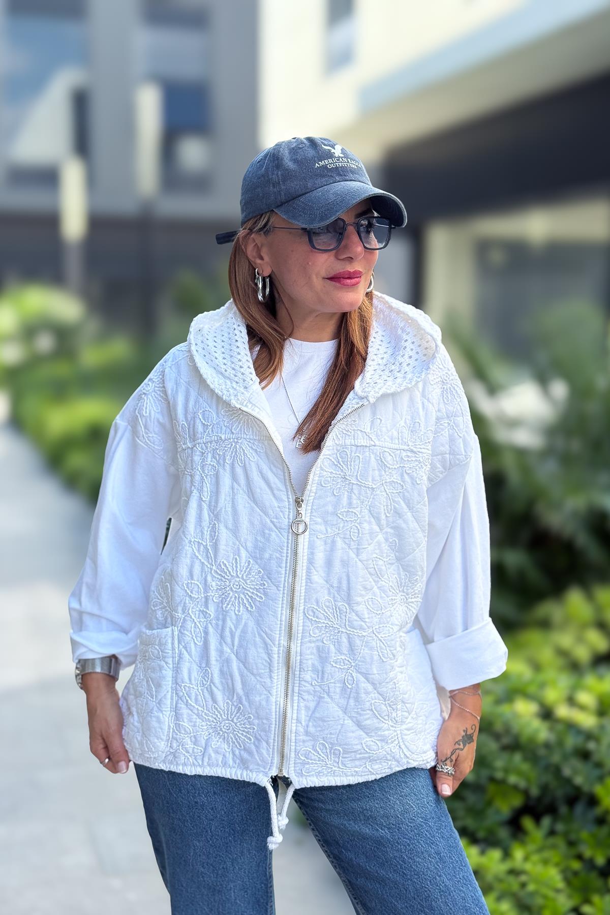 Çiçek Desenli Kapitone Ceket Beyaz Renk
