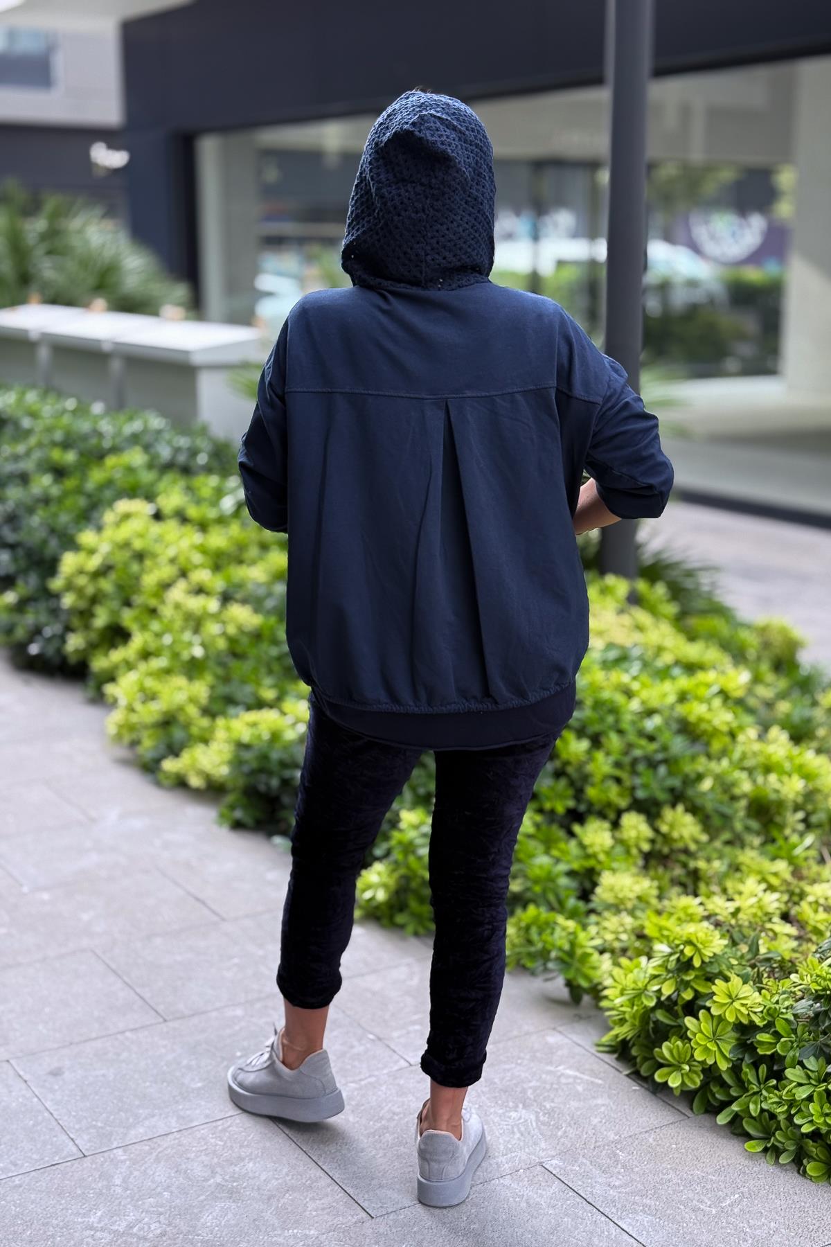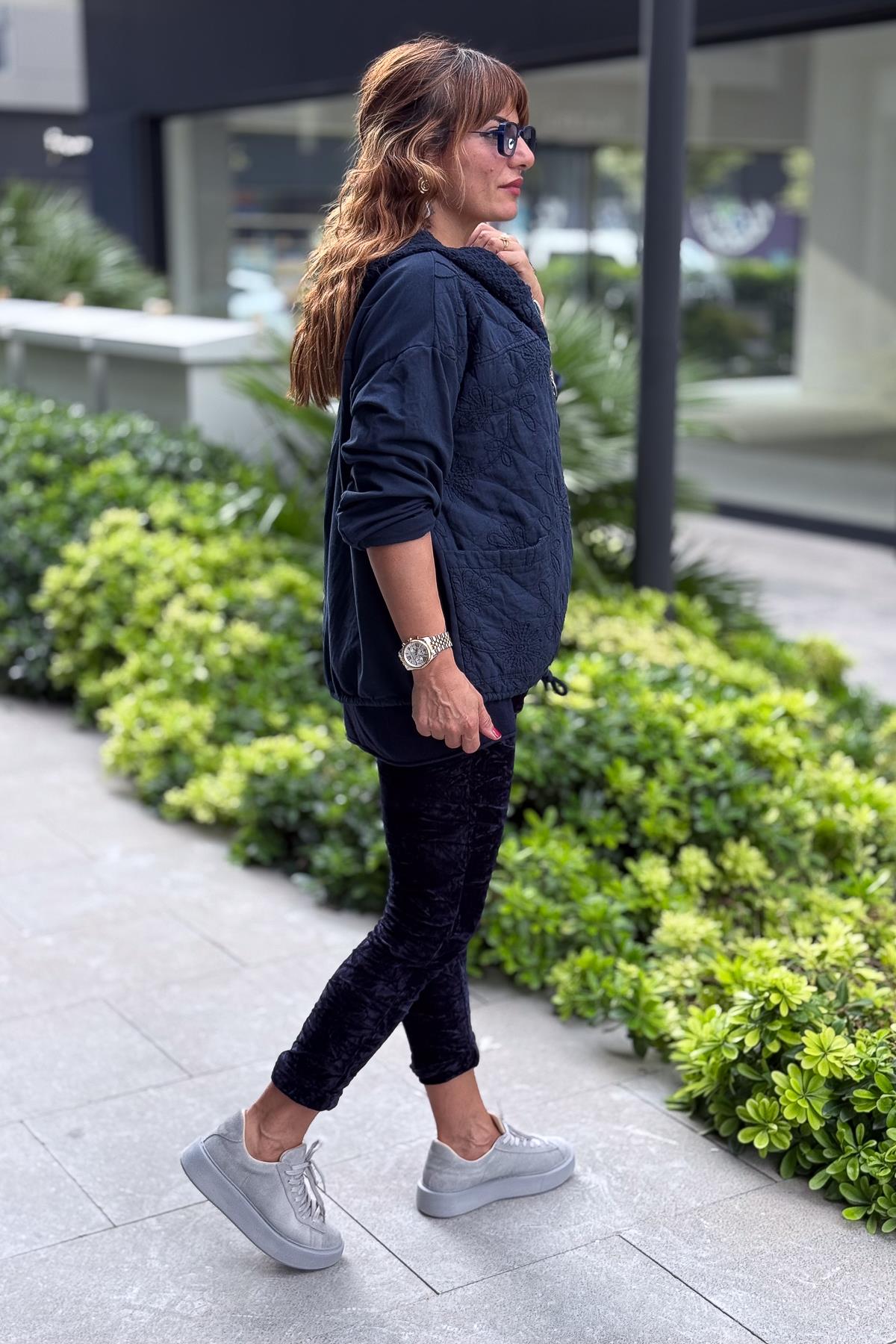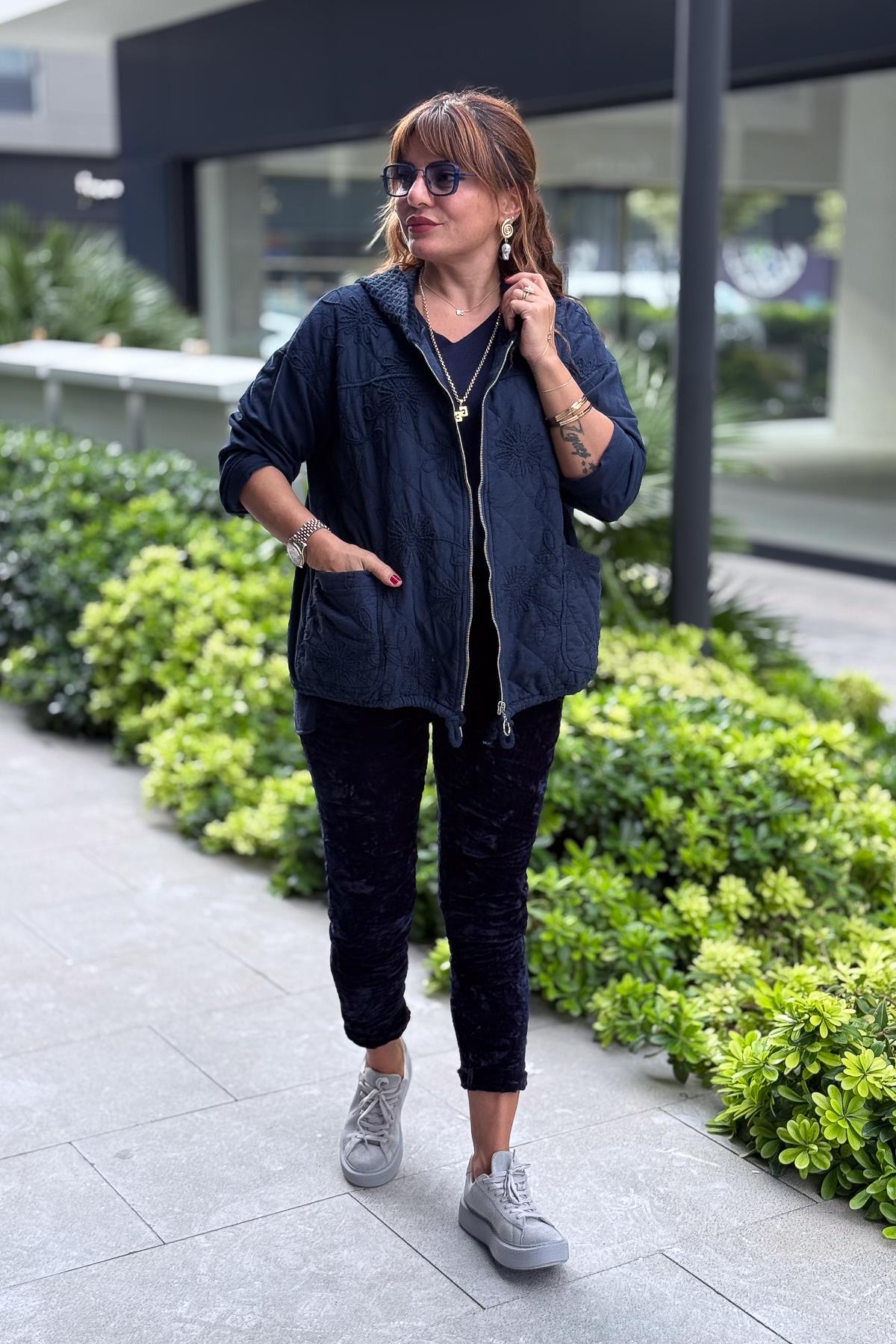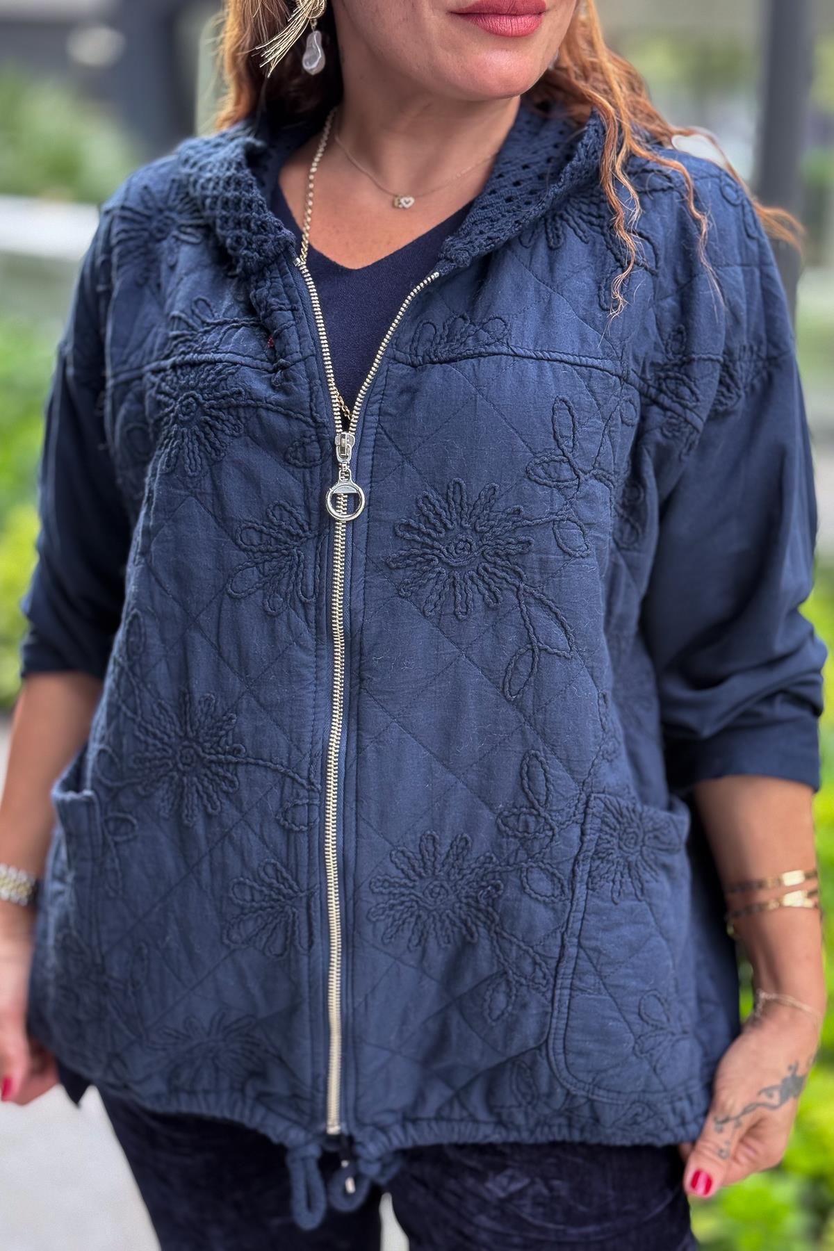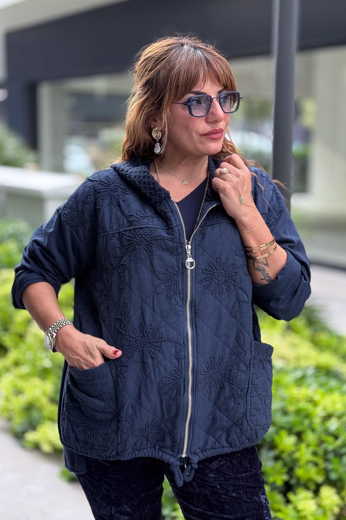 Çiçek Desenli Kapitone Ceket Lacivert Renk