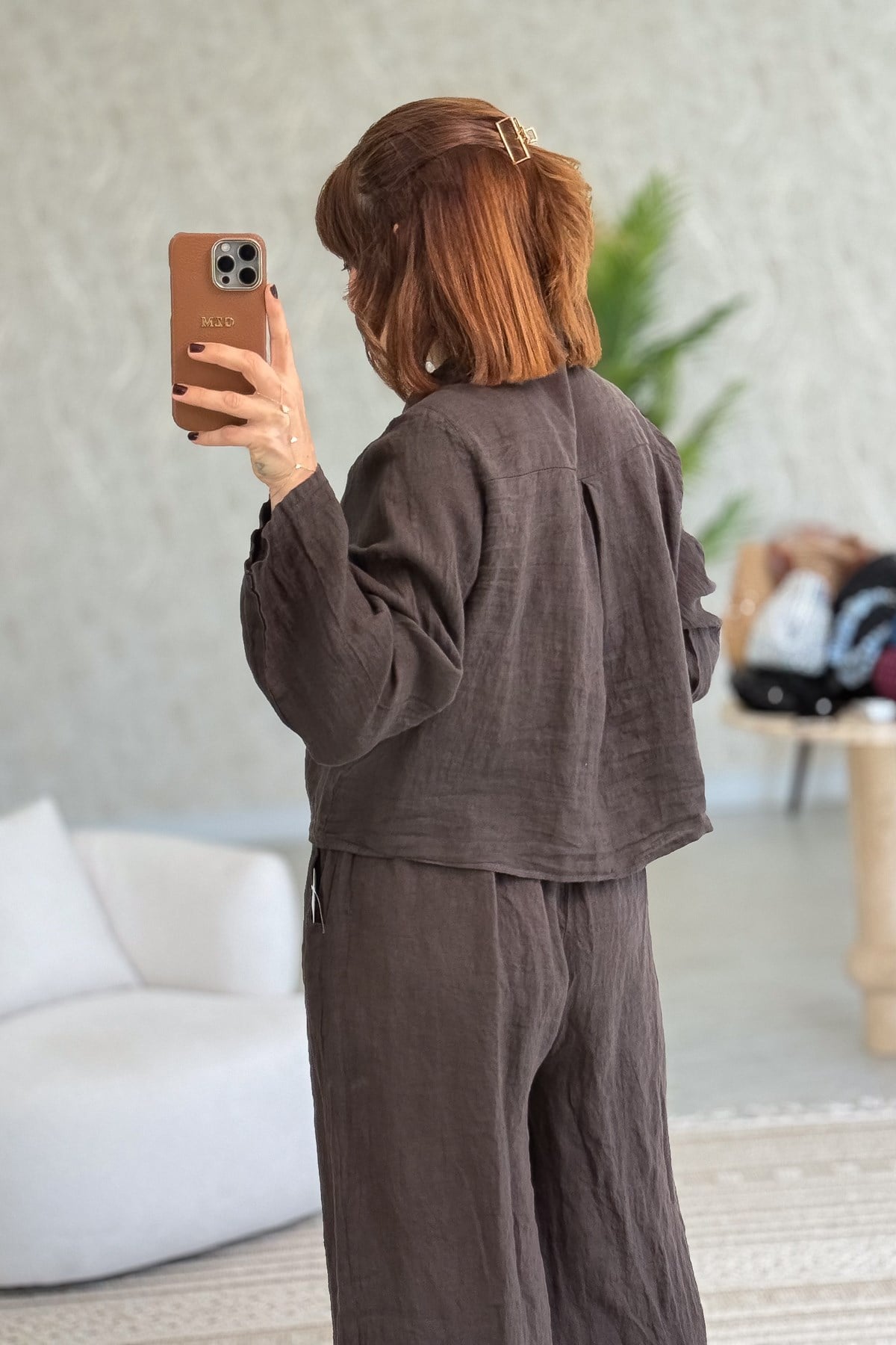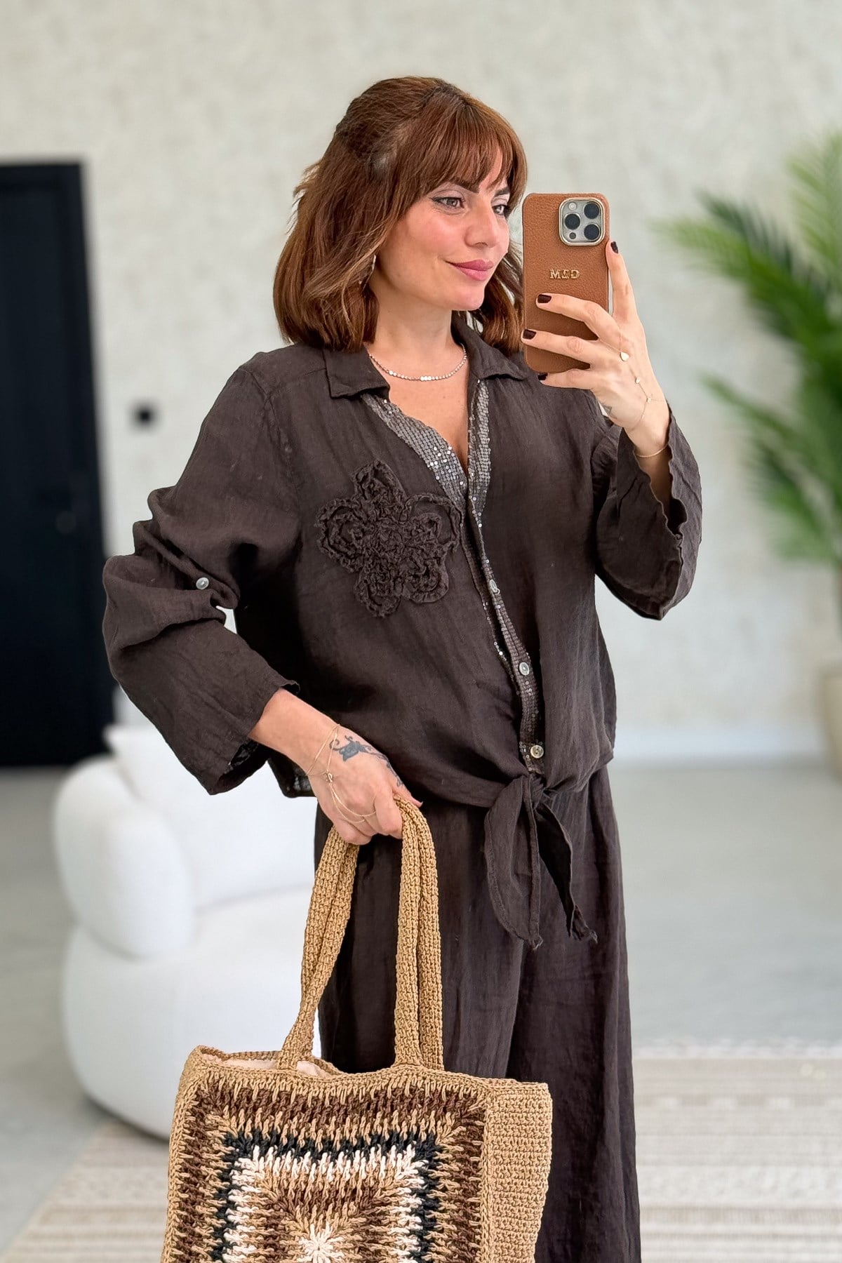 Çiçek Kabartmalı Düğme Yerleri Pullu Bağlamalı Keten Gömlek Acı Kahve Renk