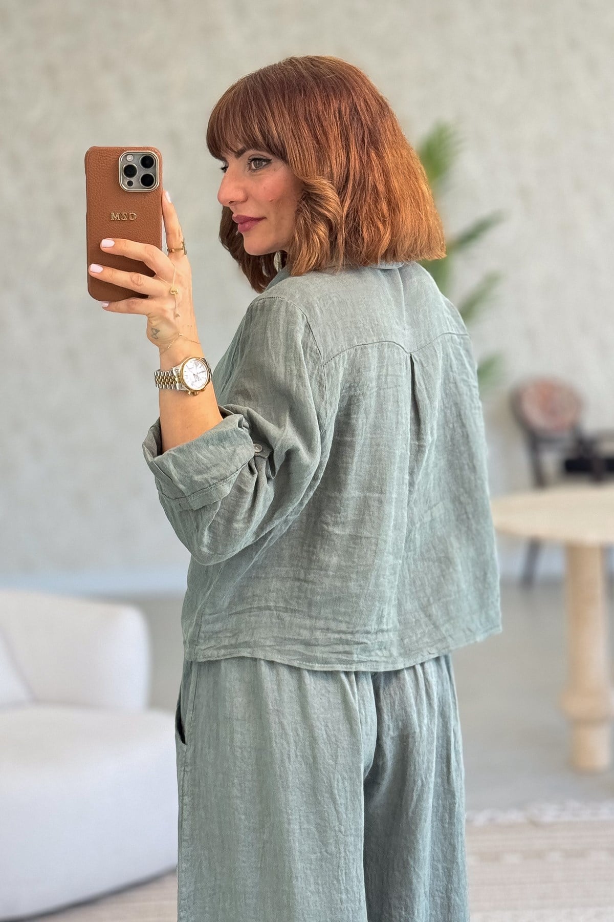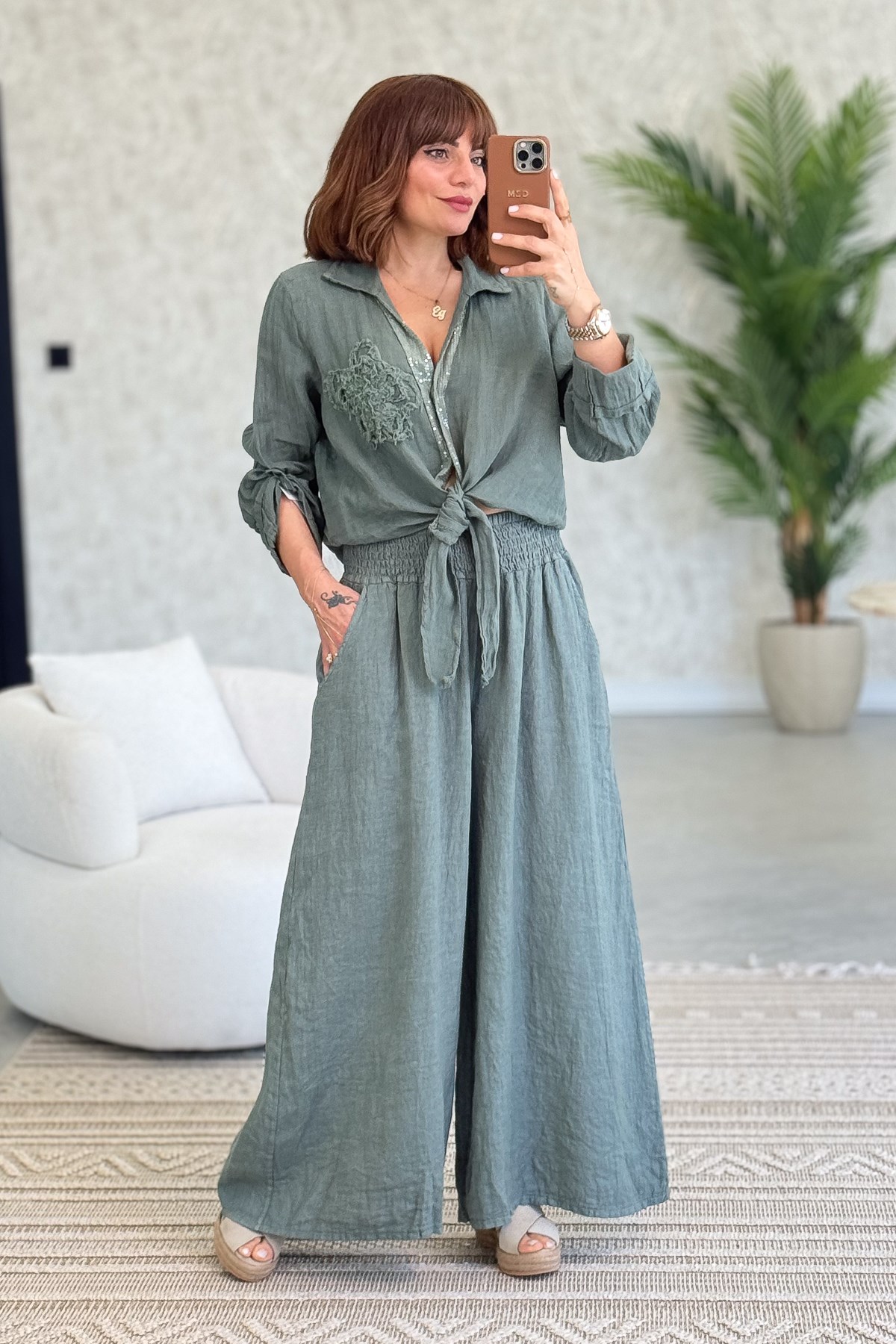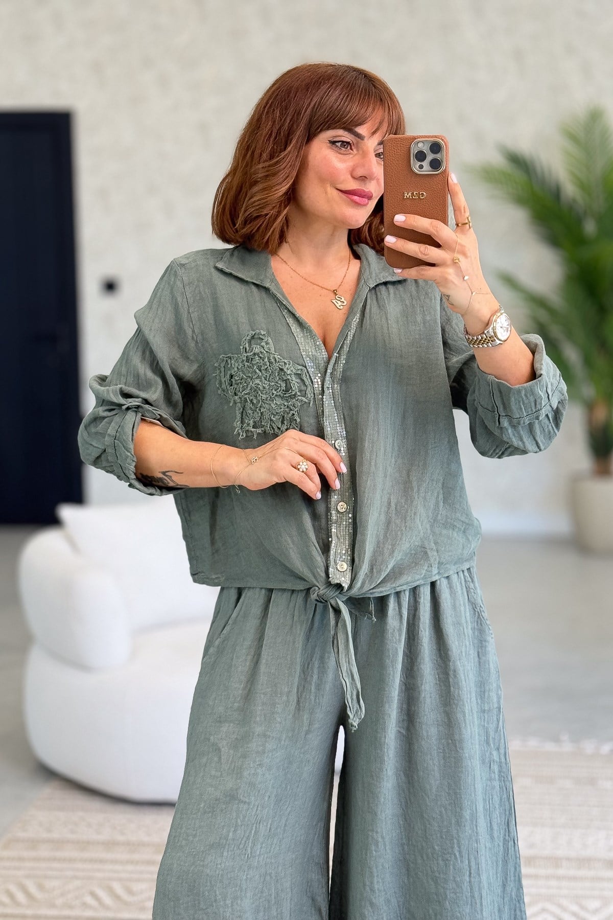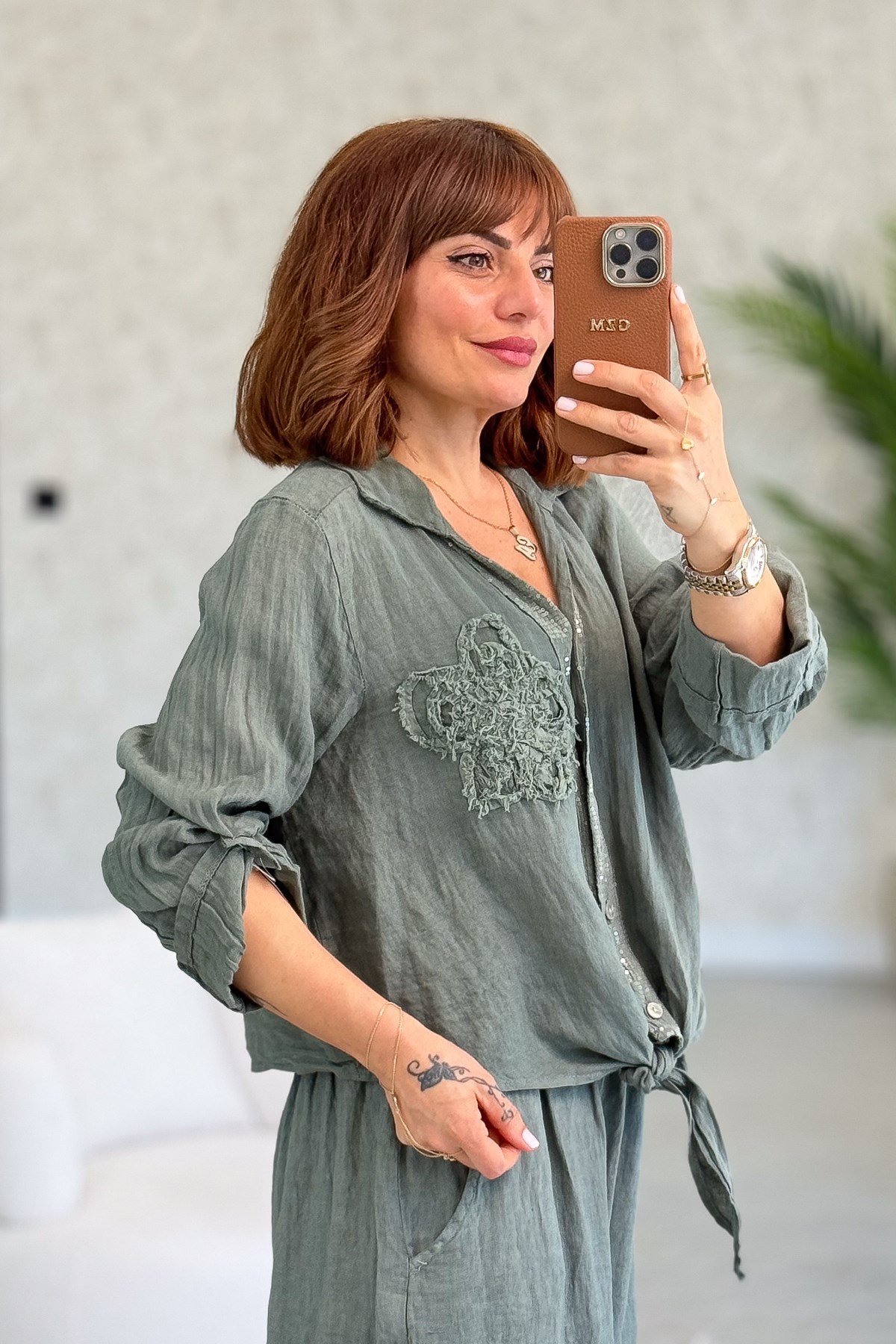 Çiçek Kabartmalı Düğme Yerleri Pullu Bağlamalı Keten Gömlek Haki Renk