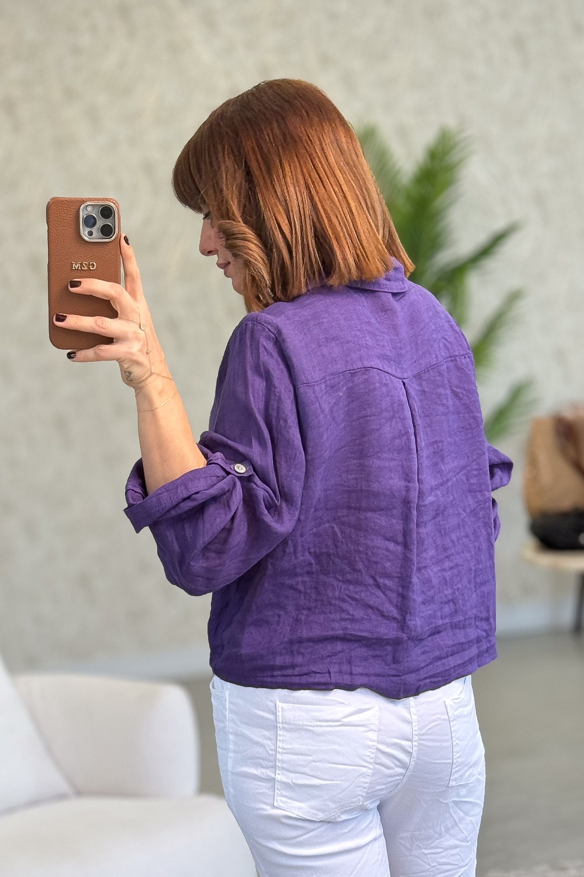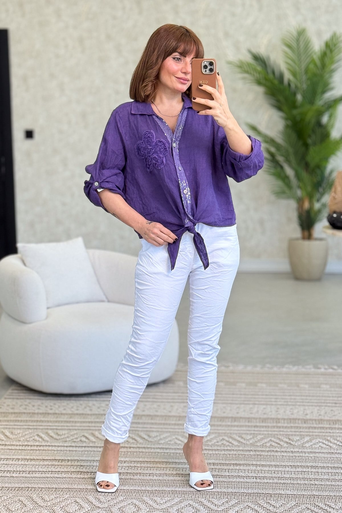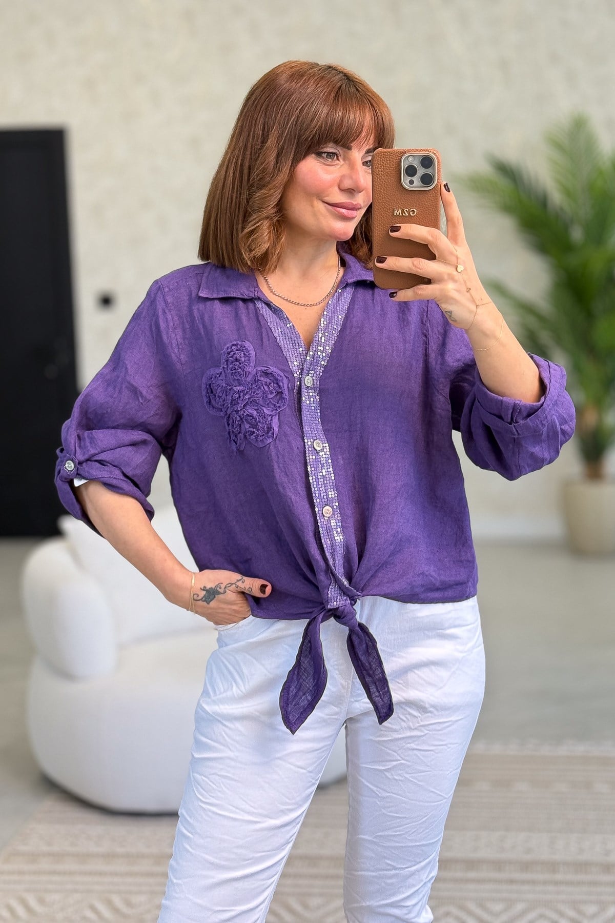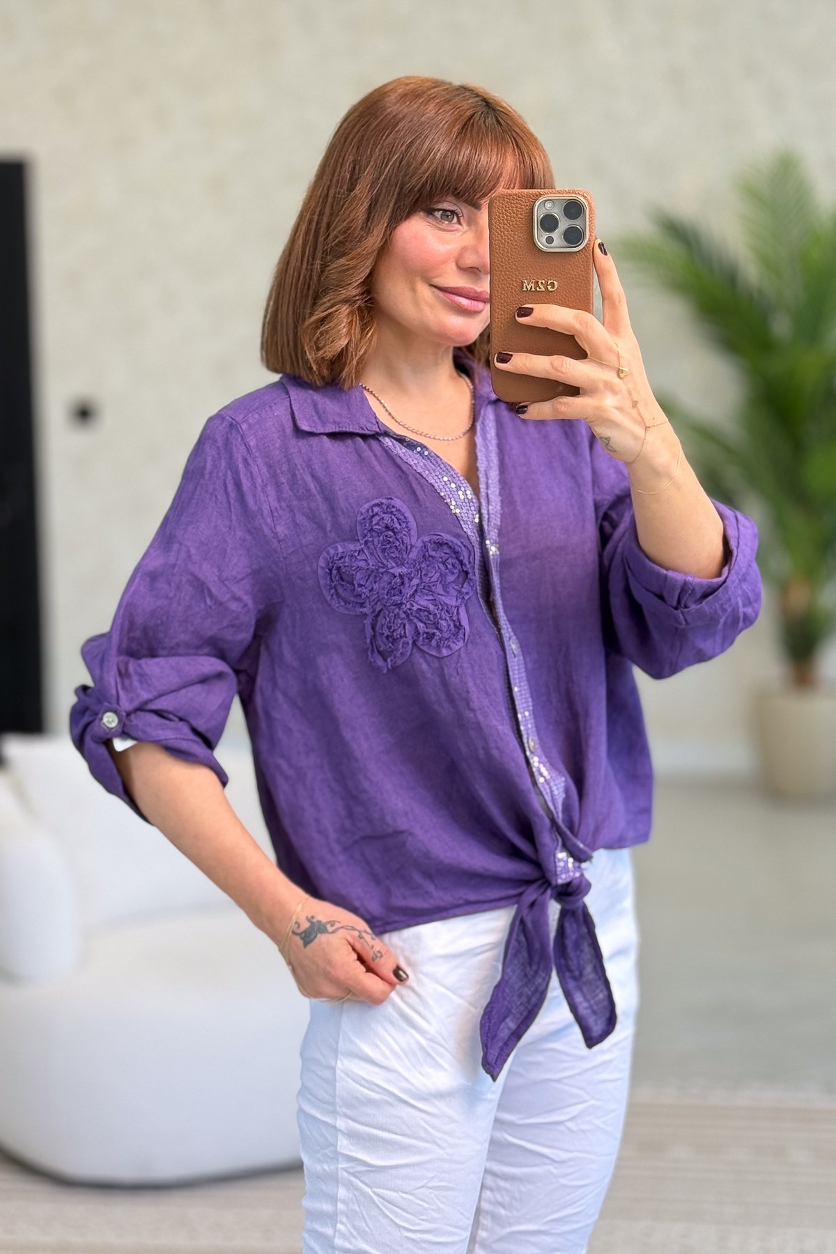 Çiçek Kabartmalı Düğme Yerleri Pullu Bağlamalı Keten Gömlek Mor Renk