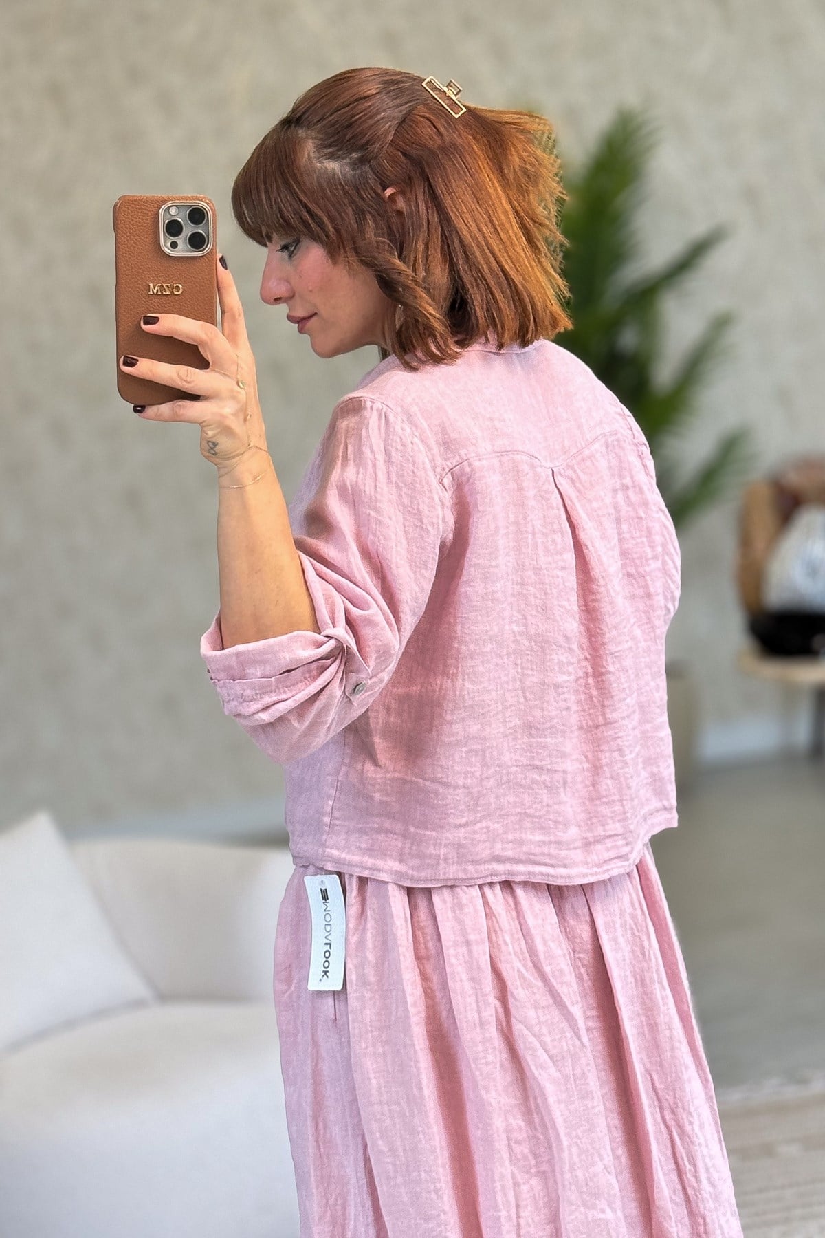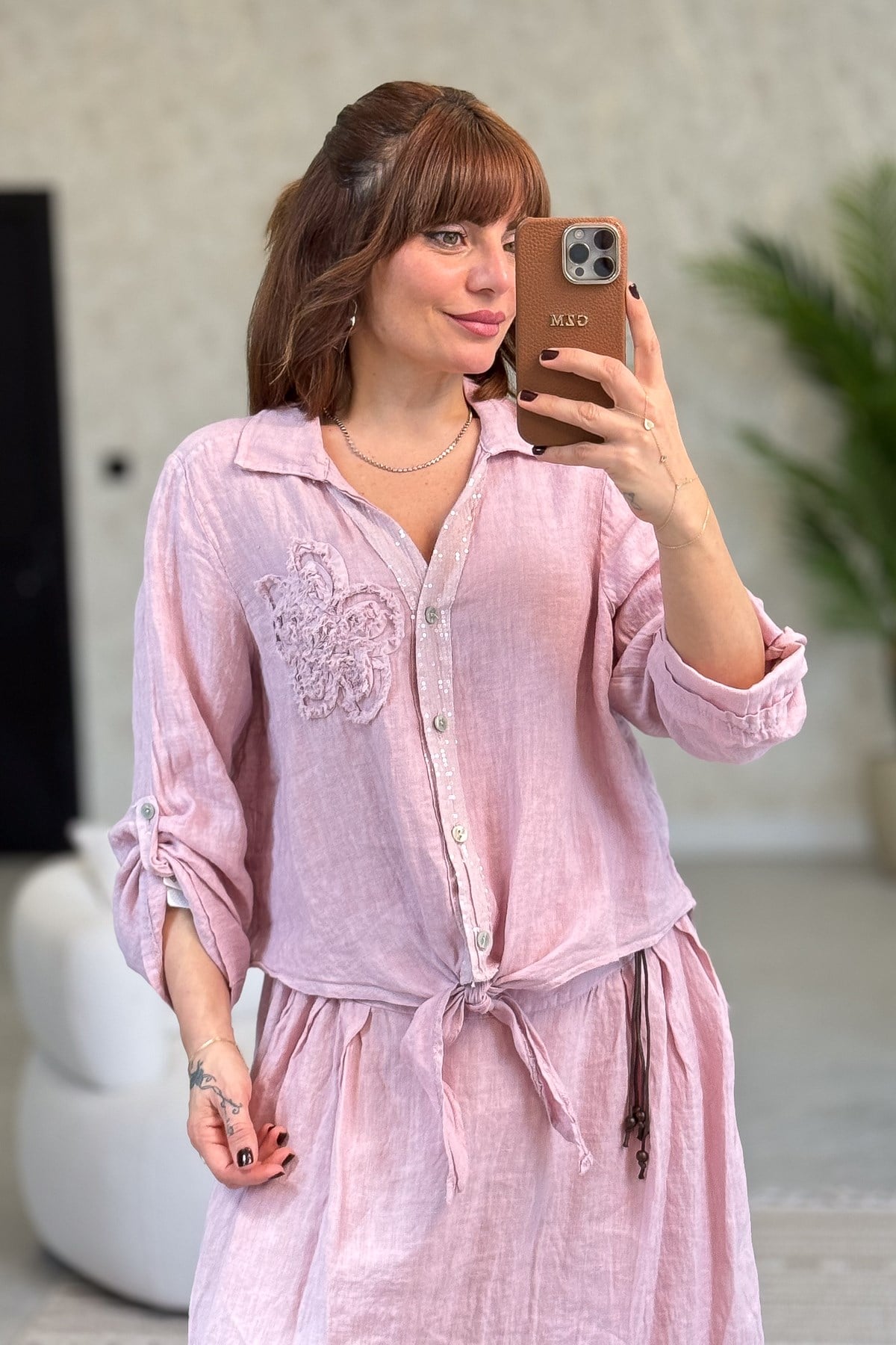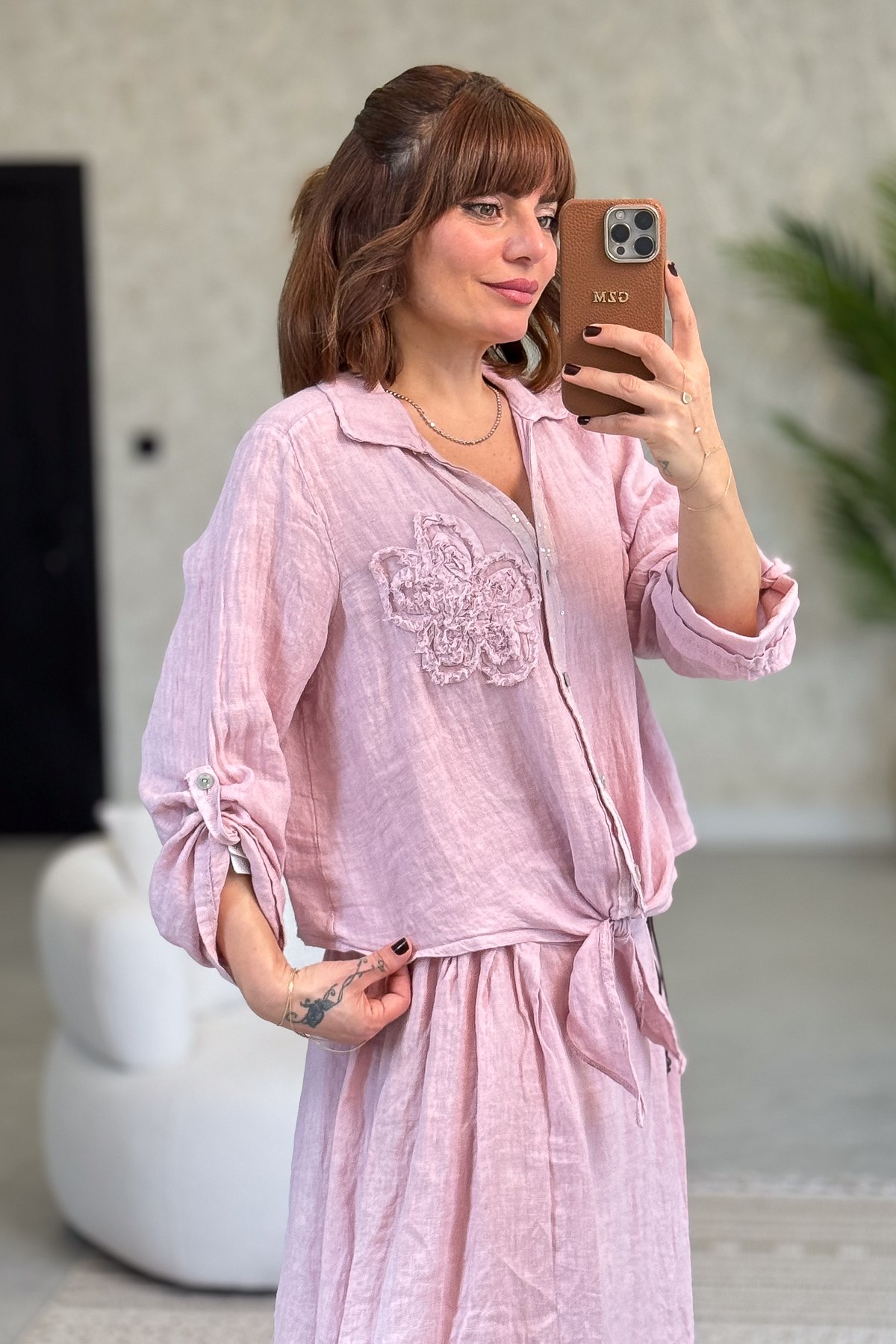 Çiçek Kabartmalı Düğme Yerleri Pullu Bağlamalı Keten Gömlek Pudra Renk