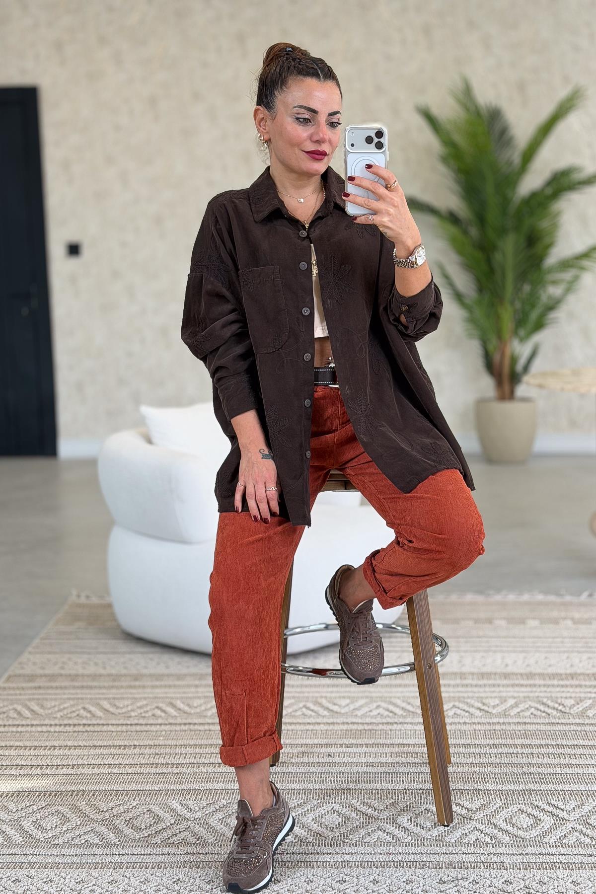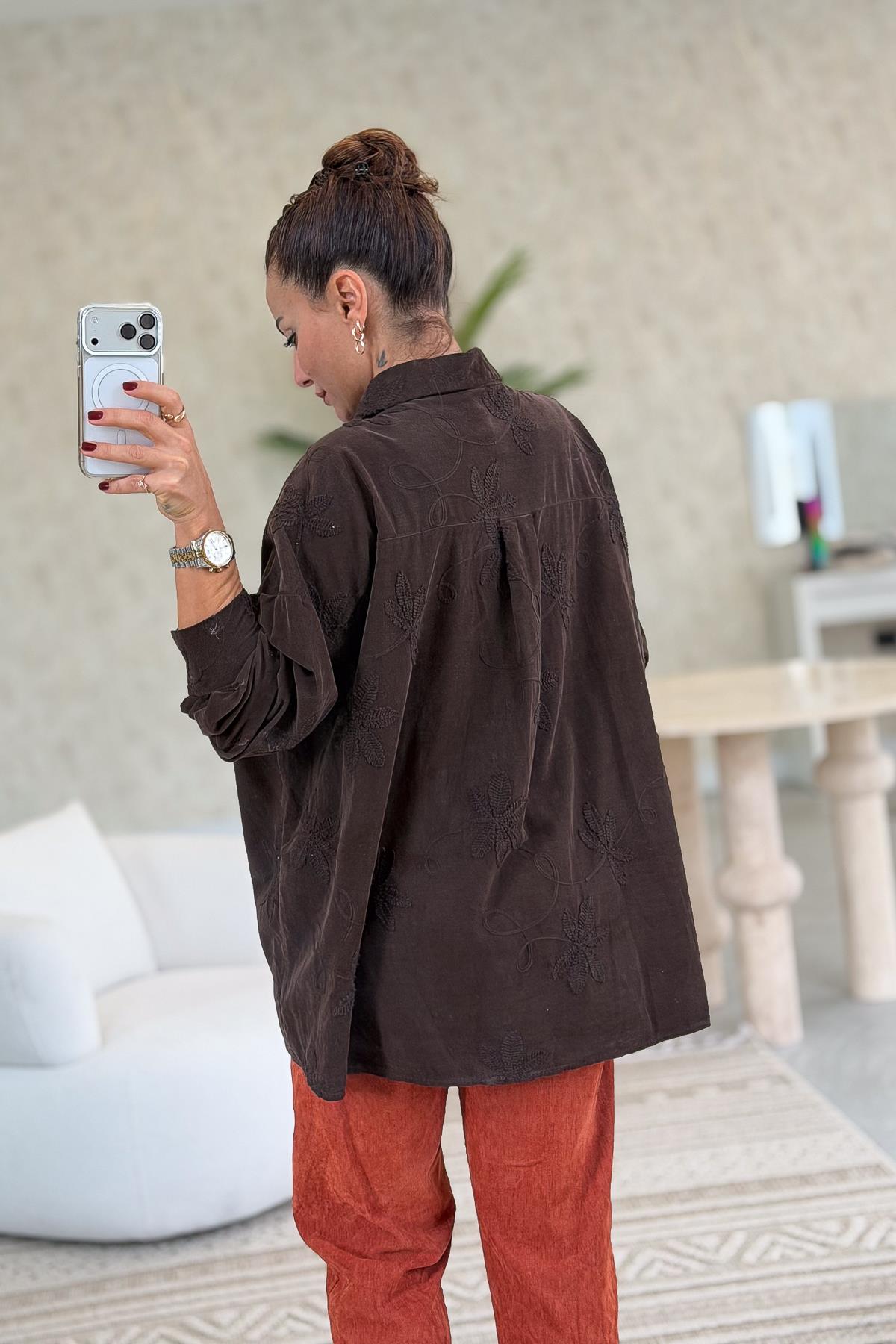 Çiçek Nakışlı Kadife Gömlek Acı Kahve Renk