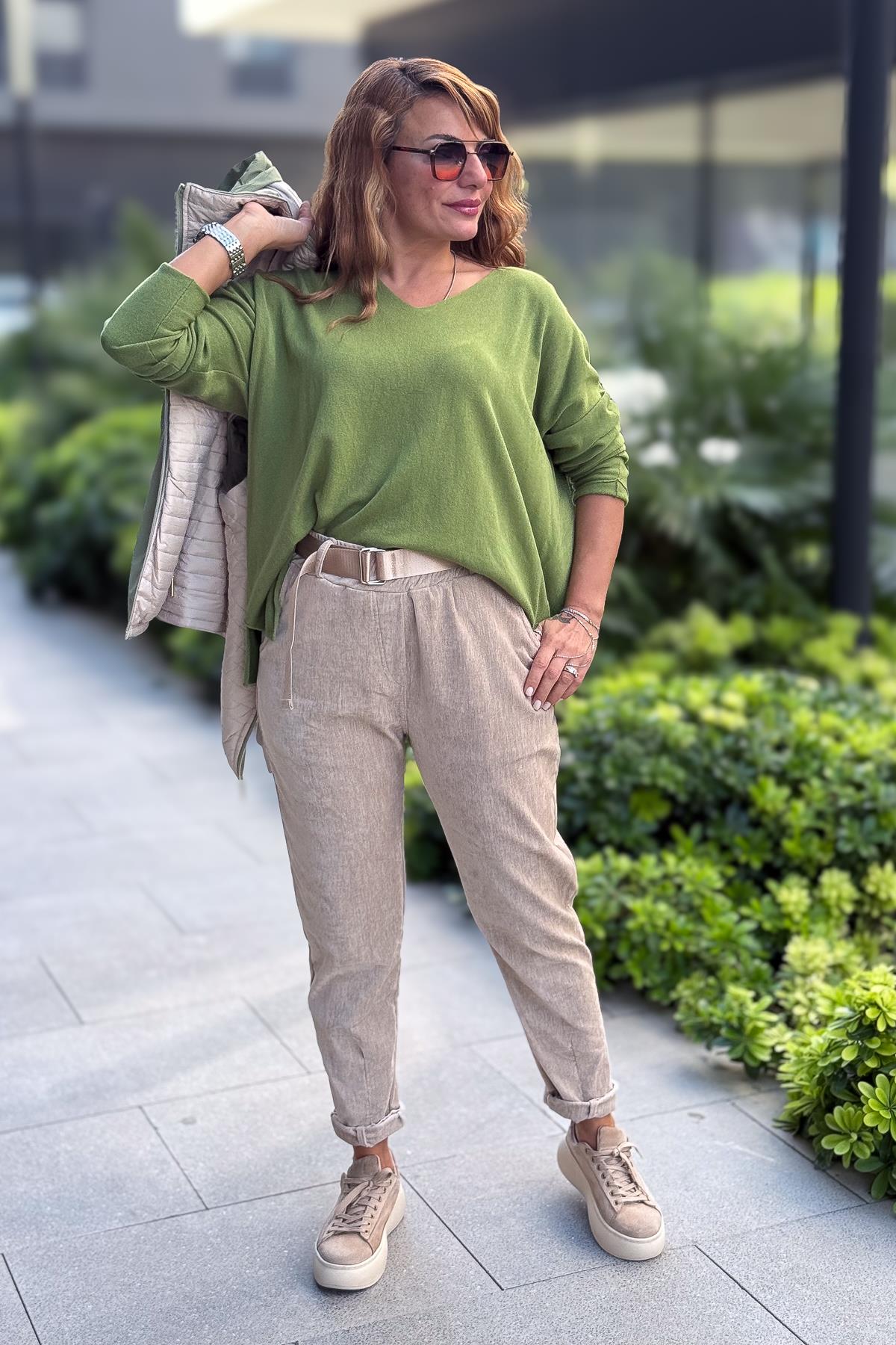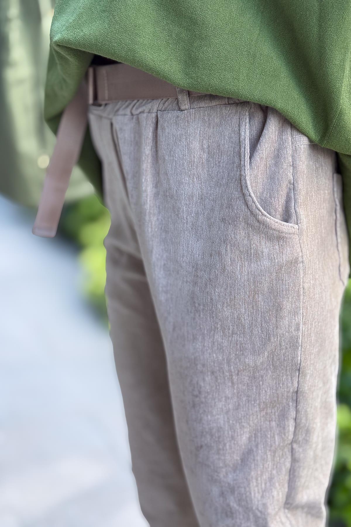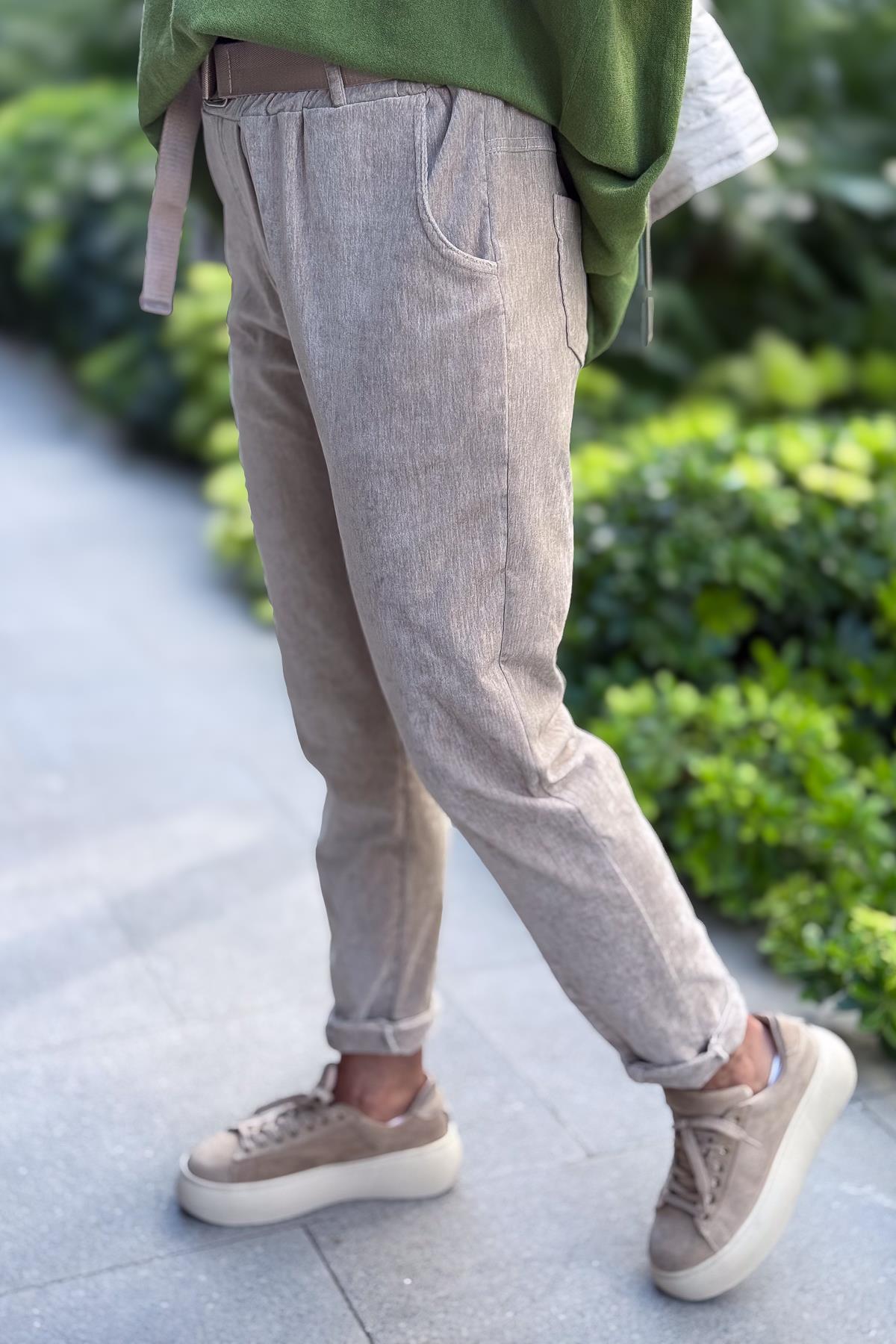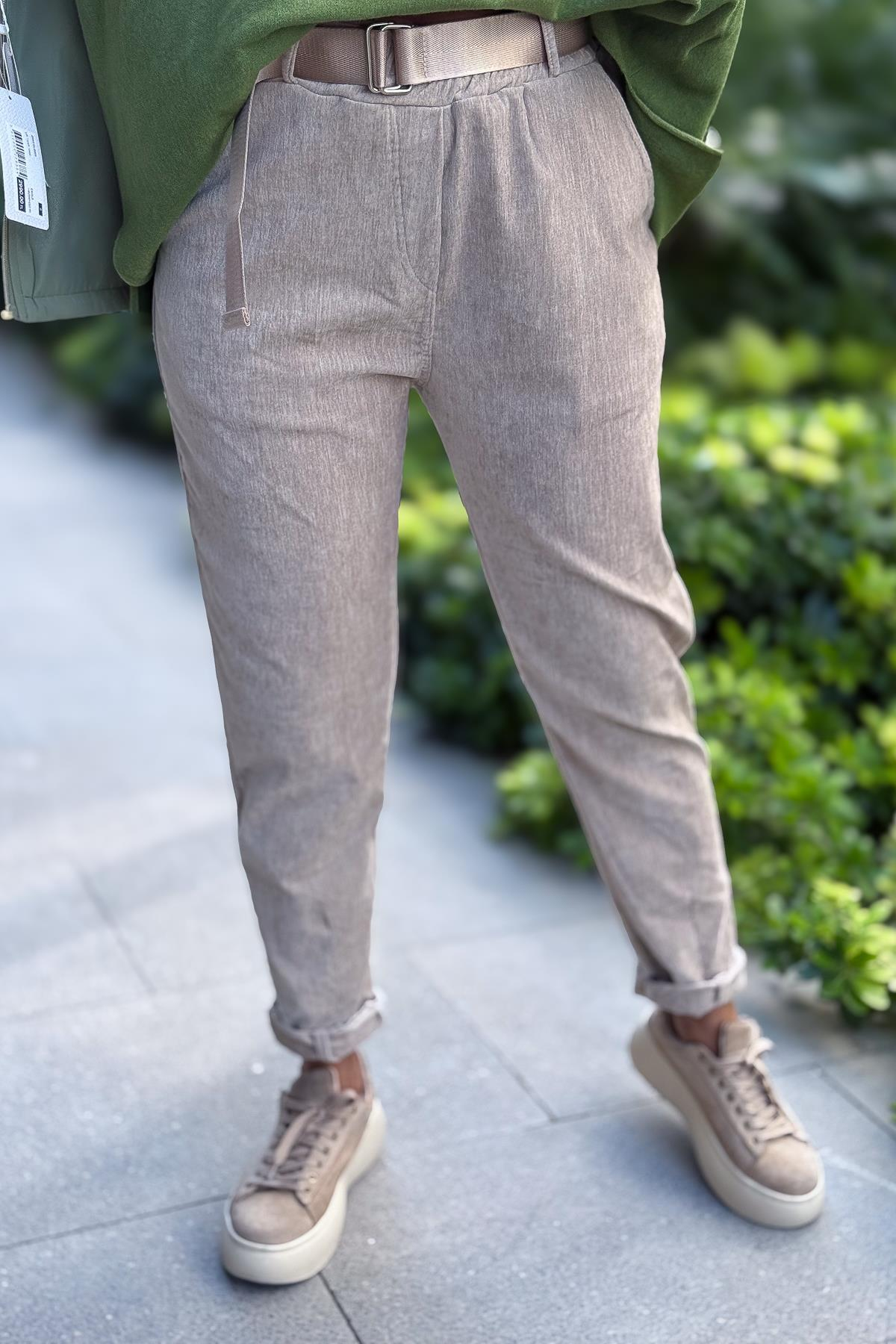 Dar Paça Dikiş Detaylı Fitilsiz Kemerli Kadife Pantolon Bej Renk