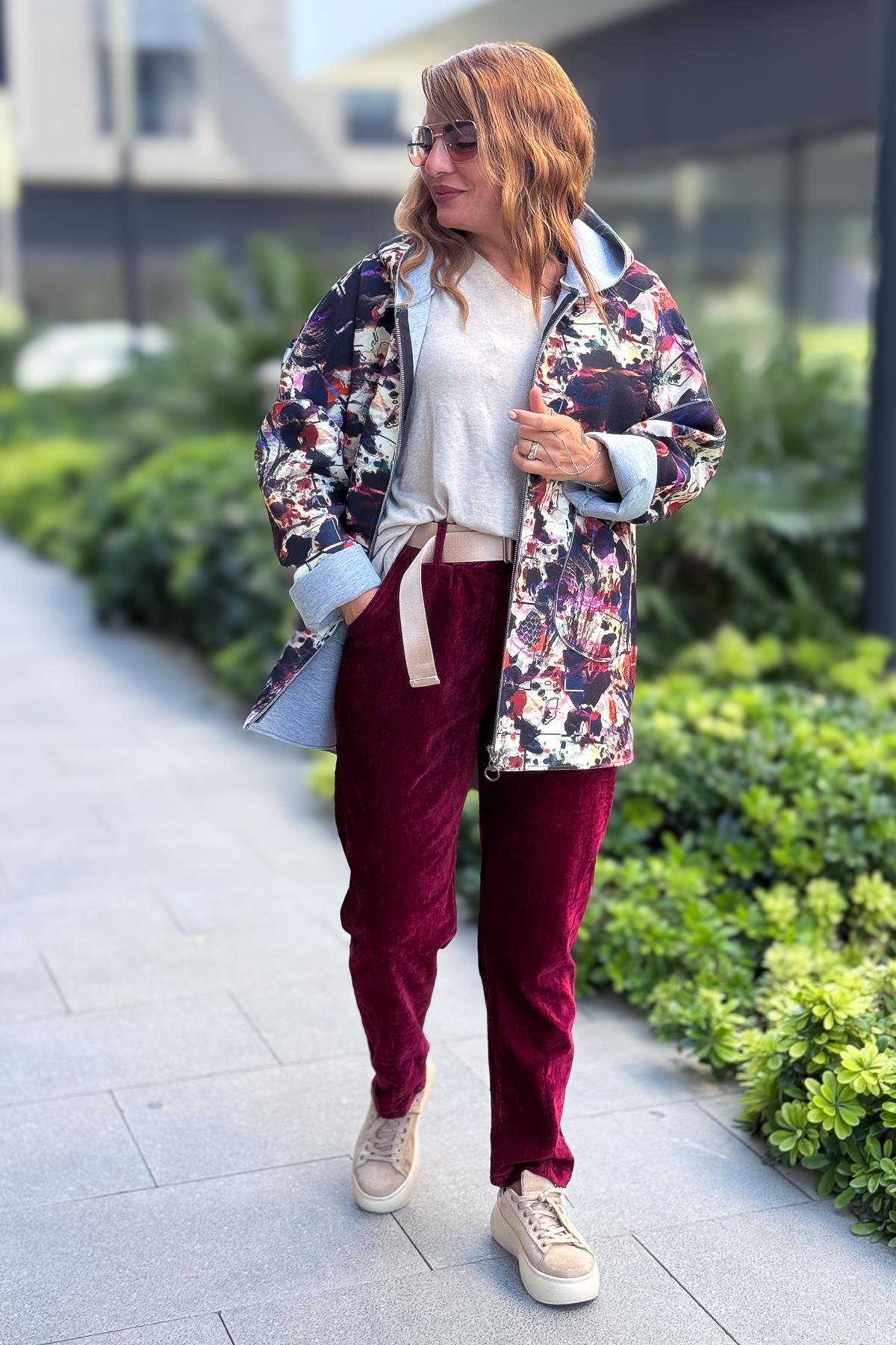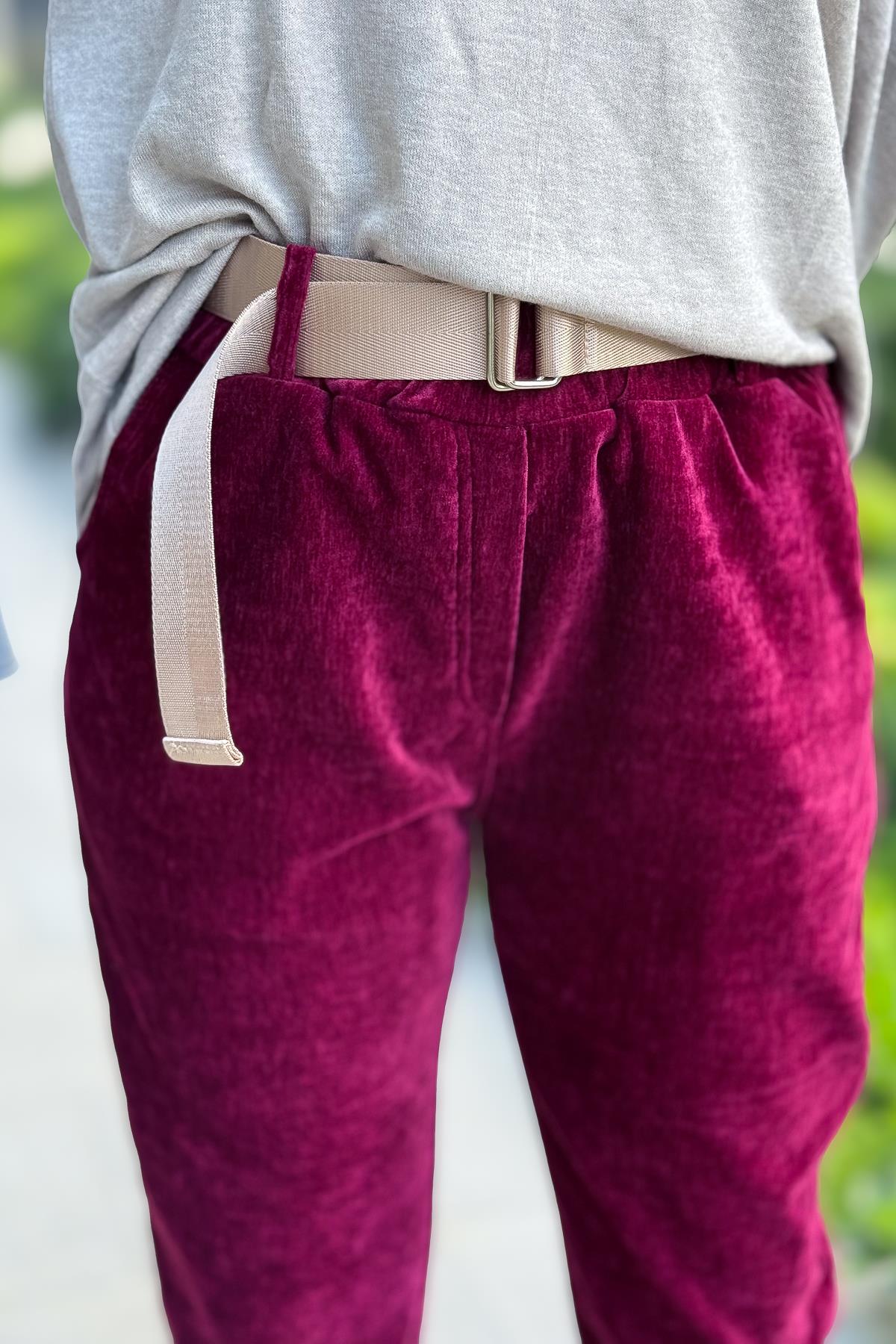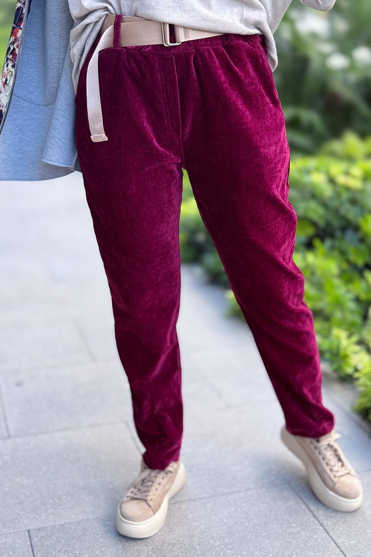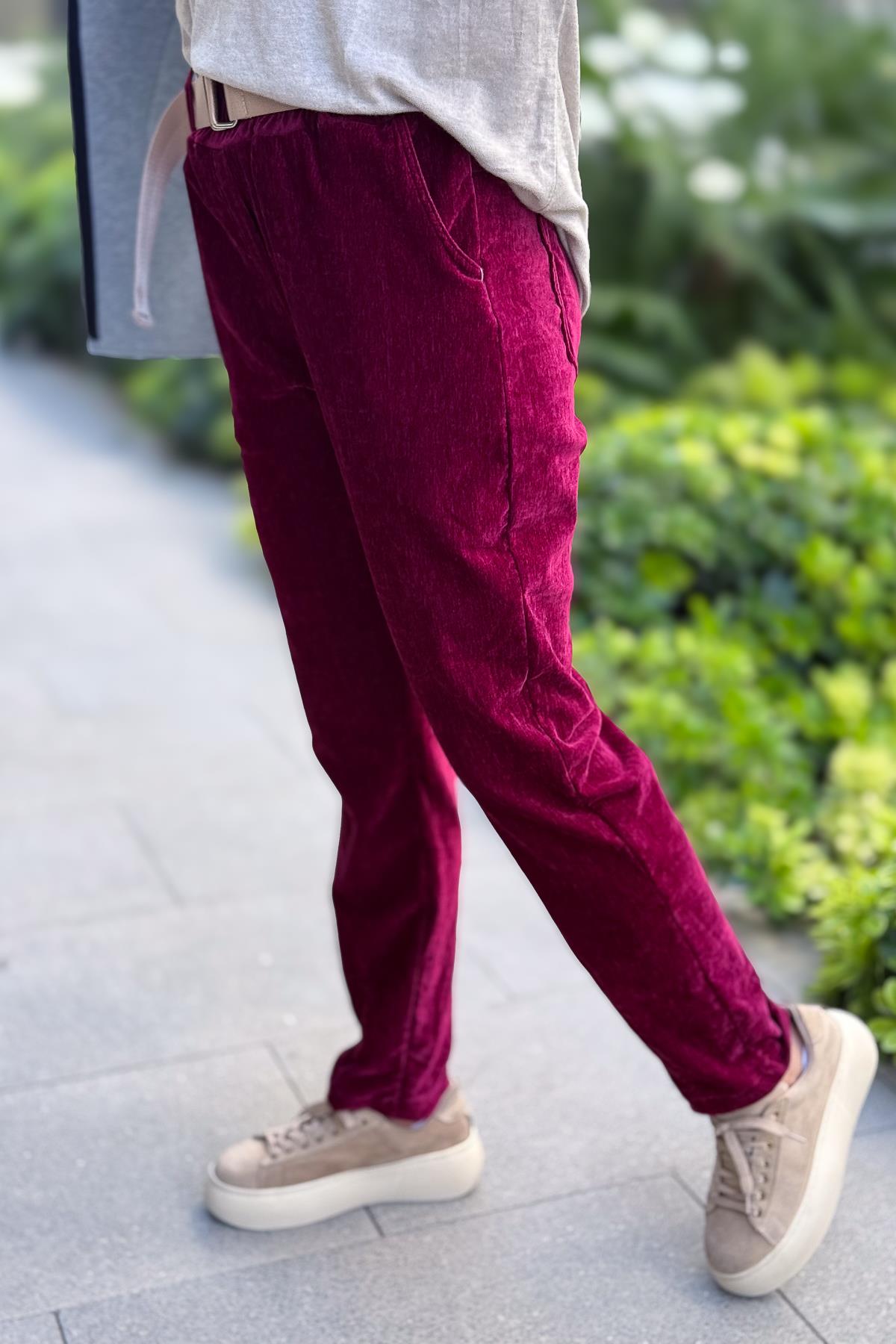 Dar Paça Dikiş Detaylı Fitilsiz Kemerli Kadife Pantolon Bordo Renk