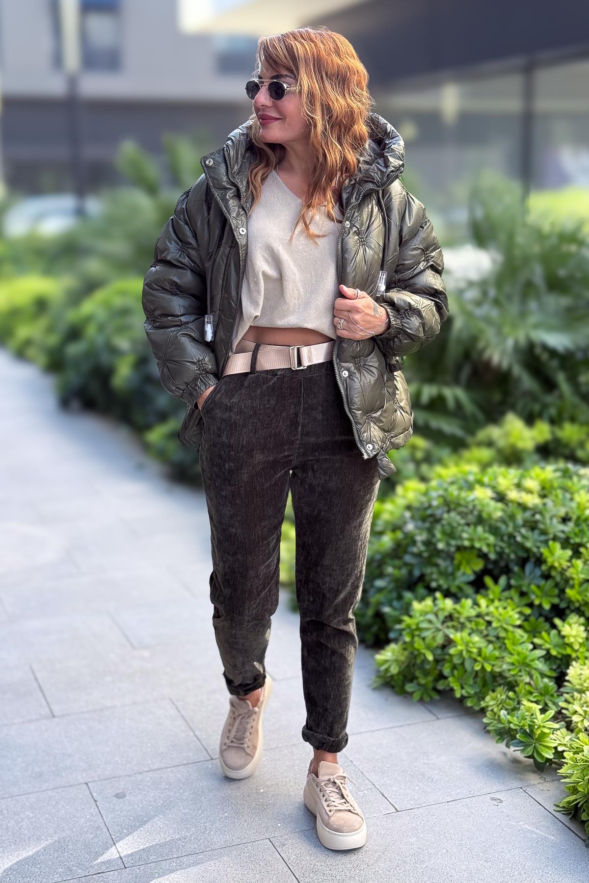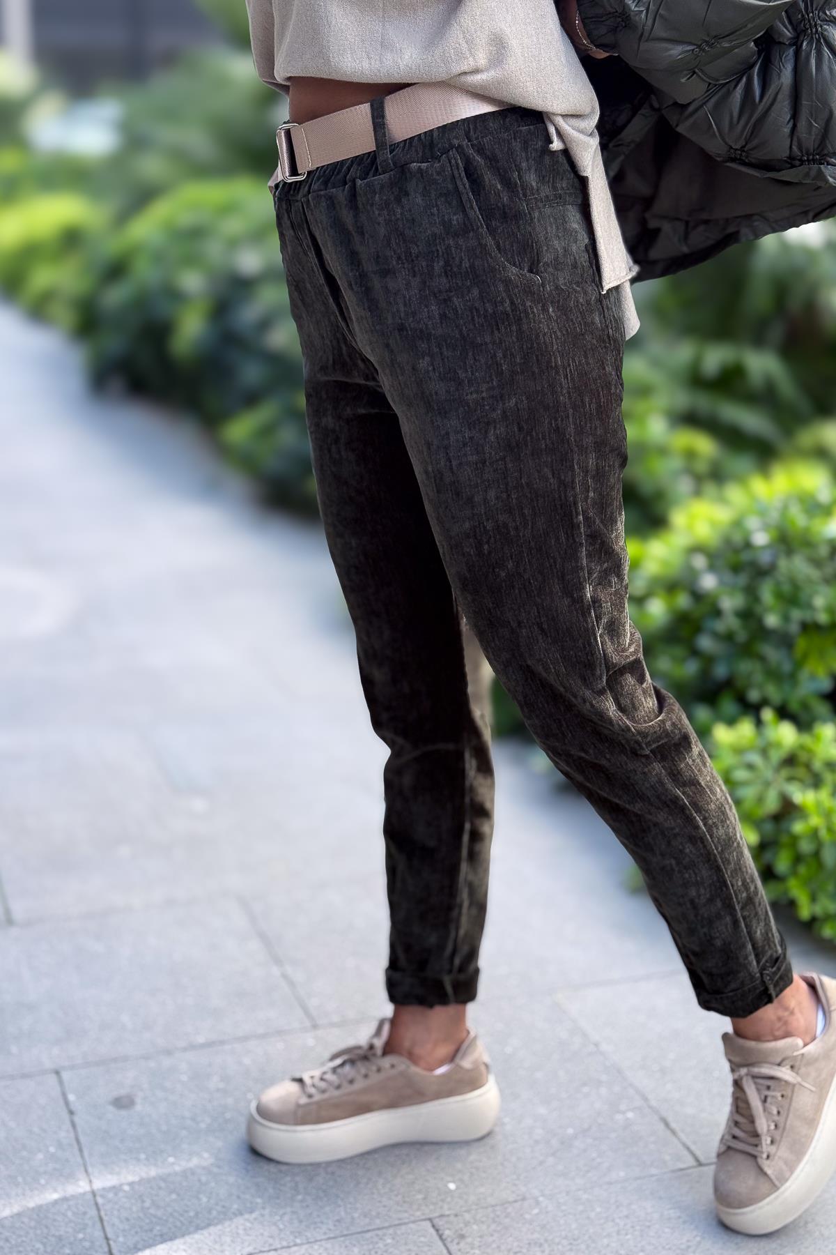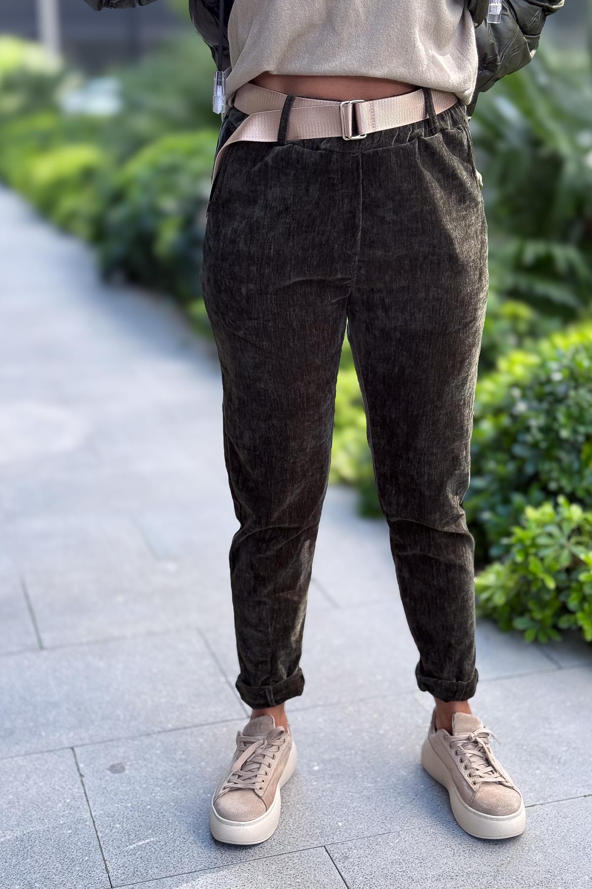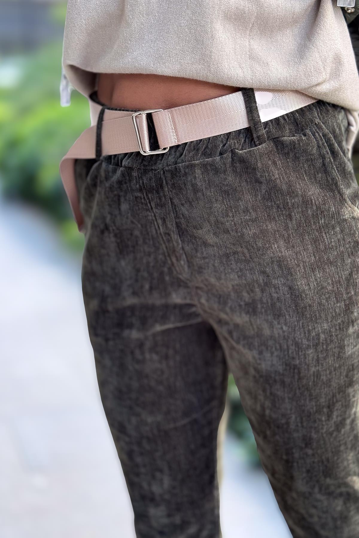 Dar Paça Dikiş Detaylı Fitilsiz Kemerli Kadife Pantolon Haki Renk