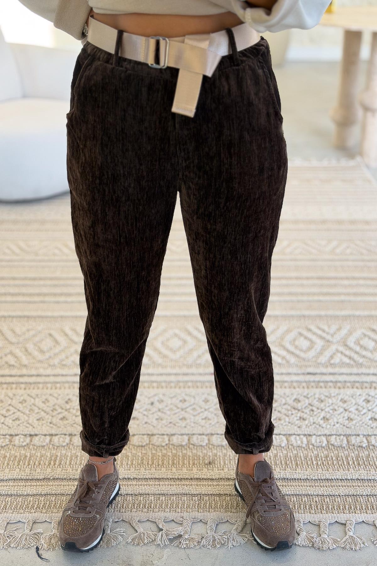 Dar Paça Dikiş Detaylı Fitilsiz Kemerli Kadife Pantolon Kahverengi Renk