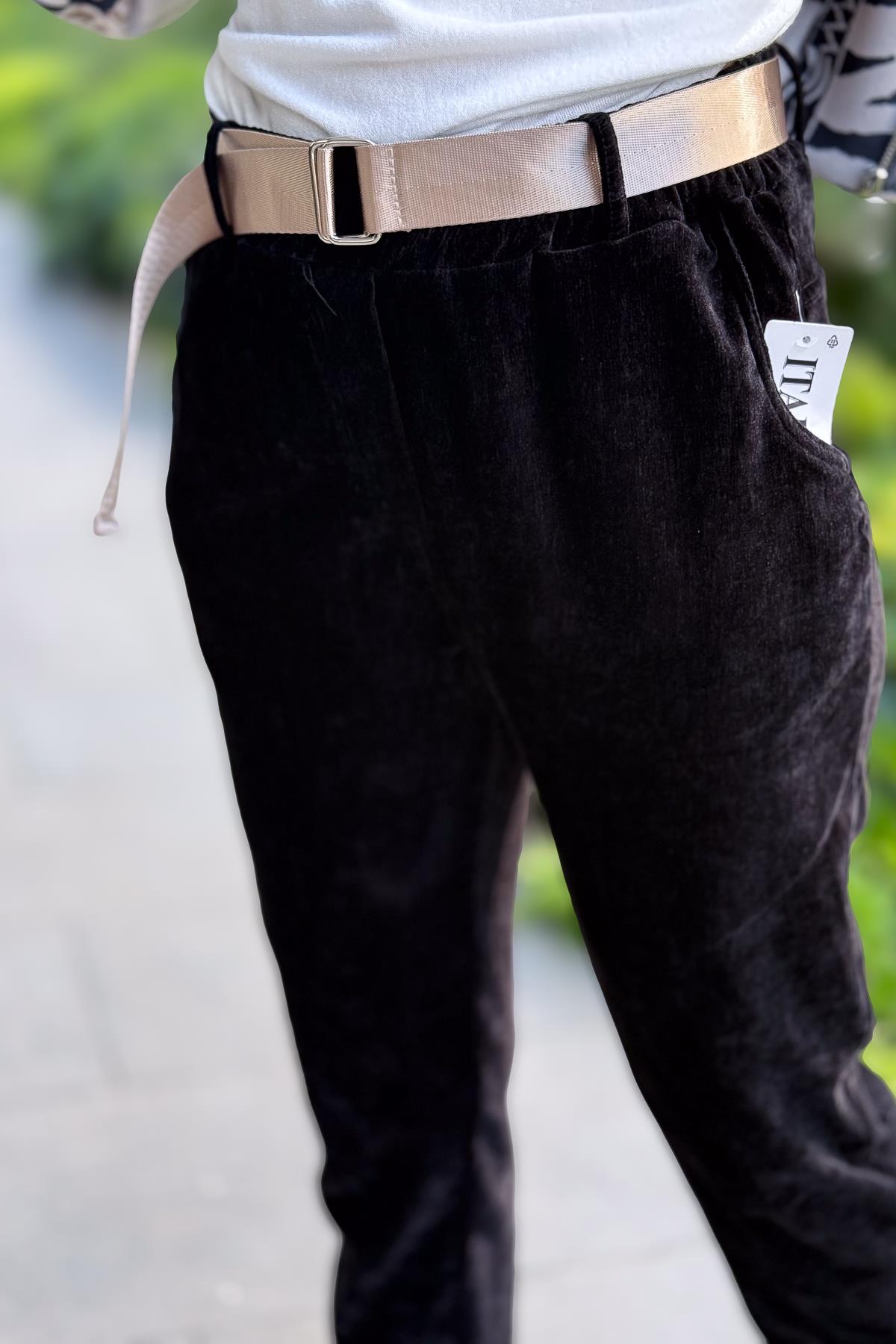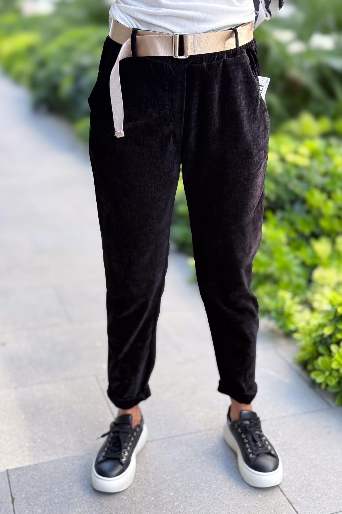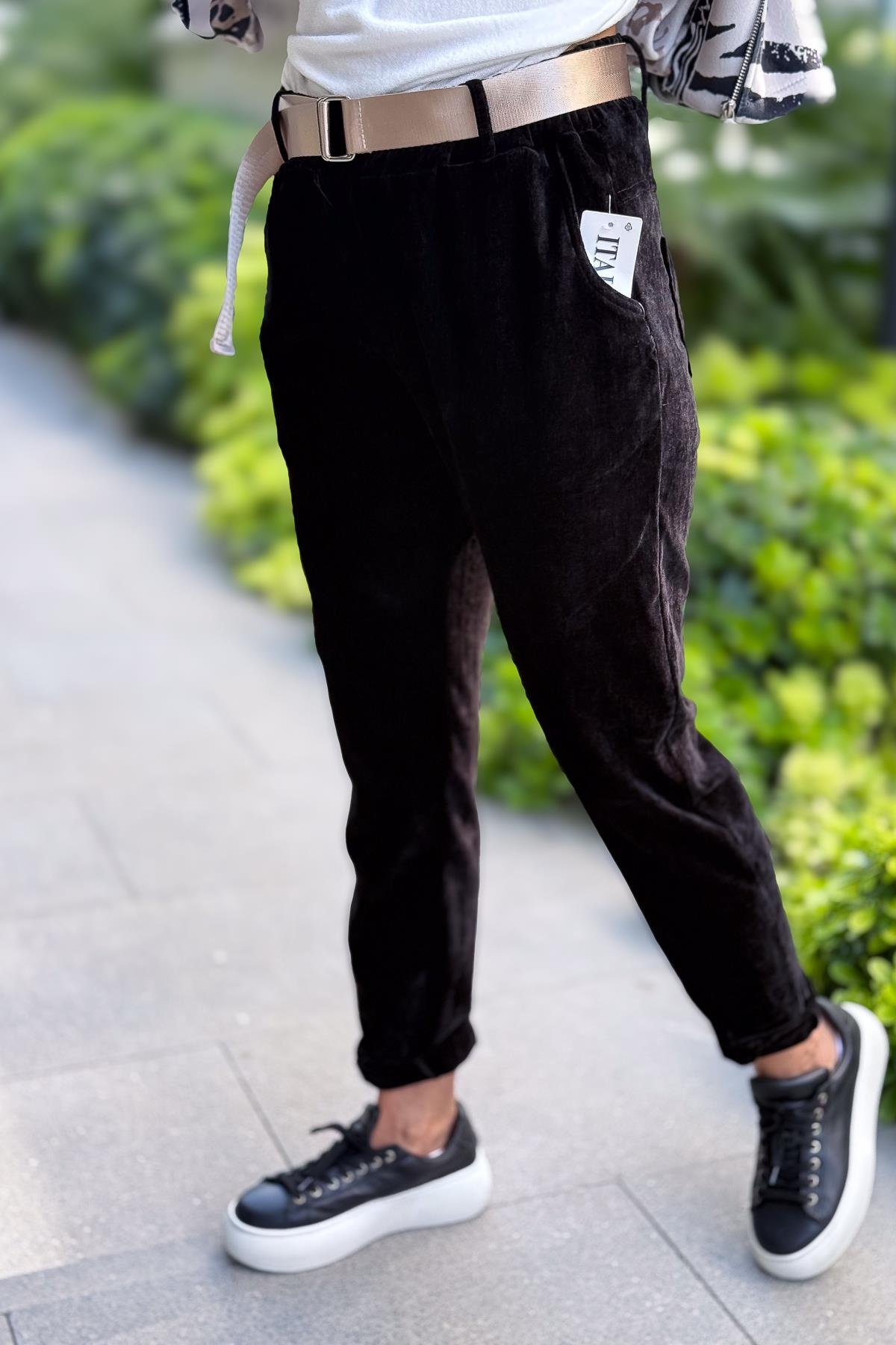 Dar Paça Dikiş Detaylı Fitilsiz Kemerli Kadife Pantolon Siyah Renk