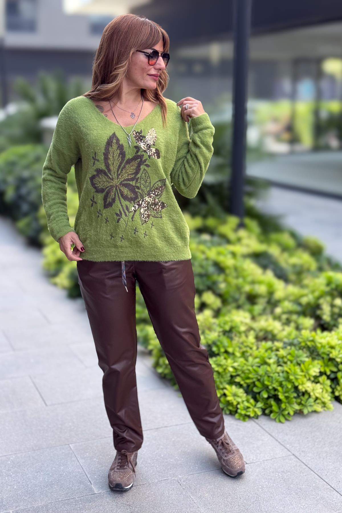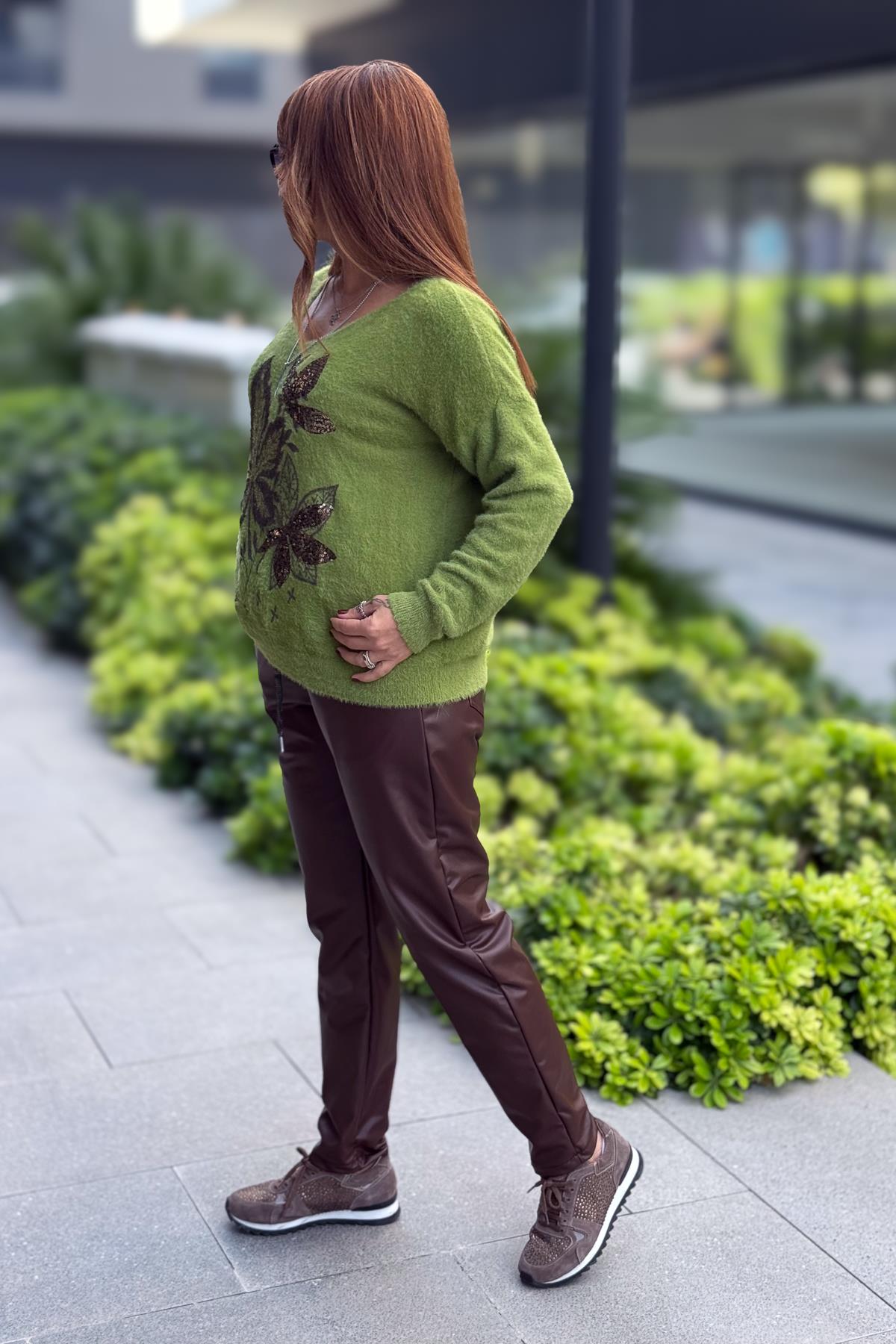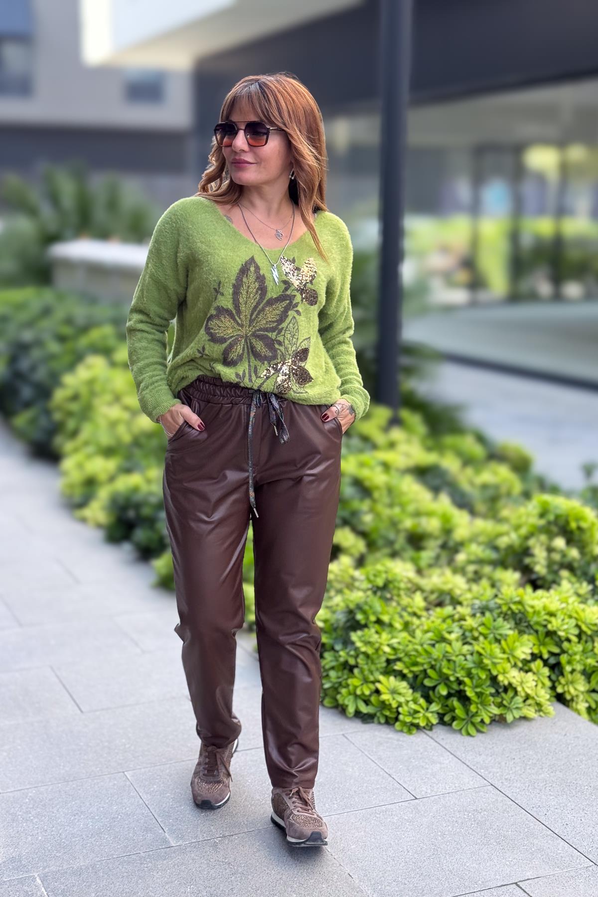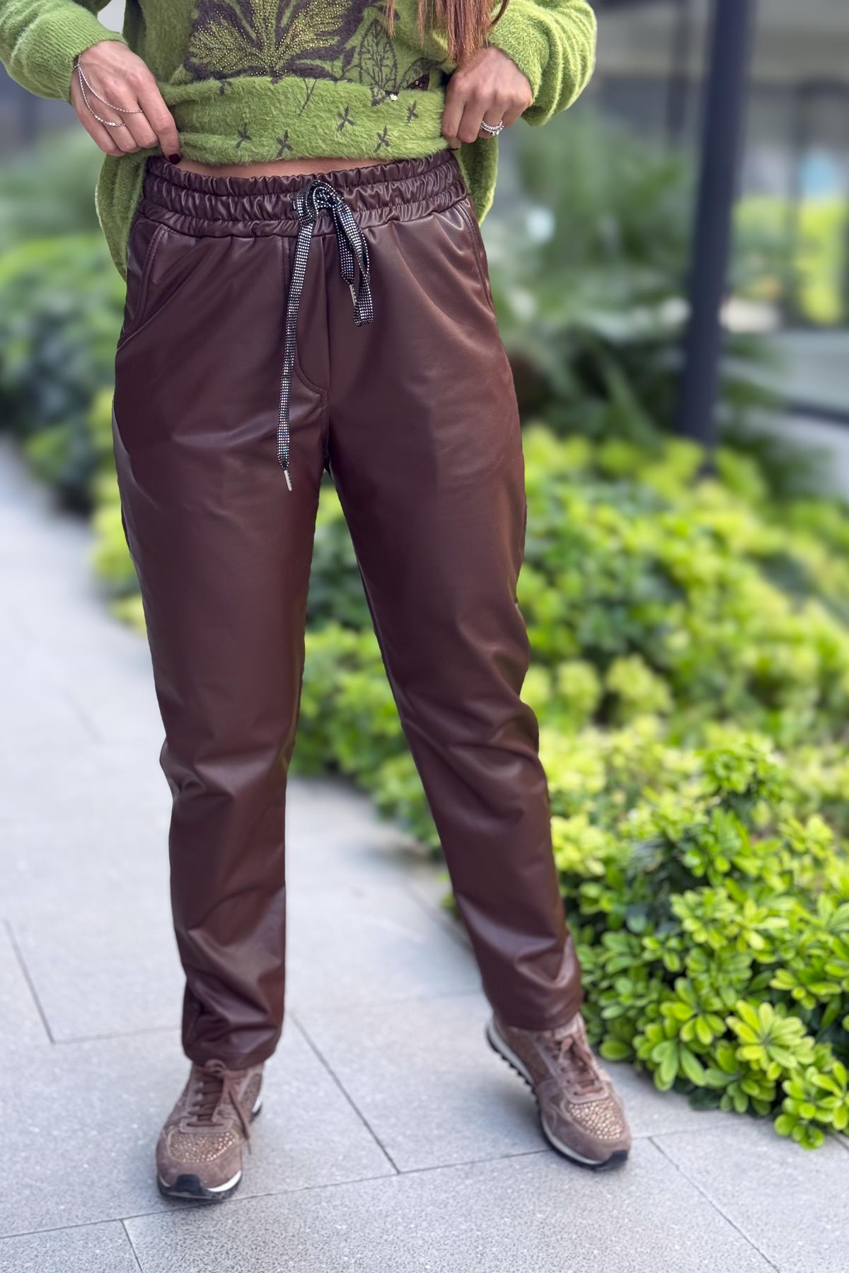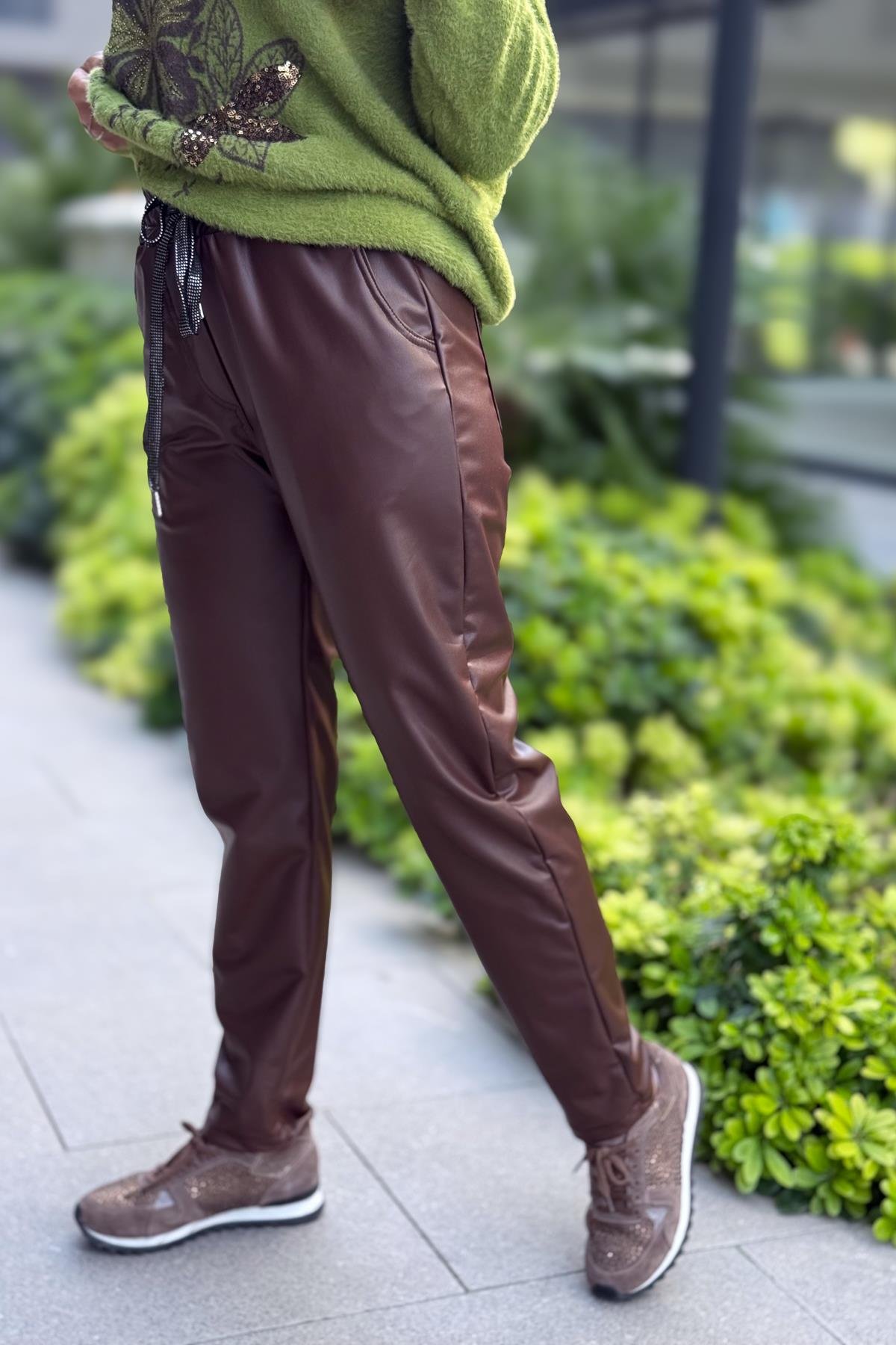 Deri Görünümlü Likralı Pantolon Kızılkahve Renk