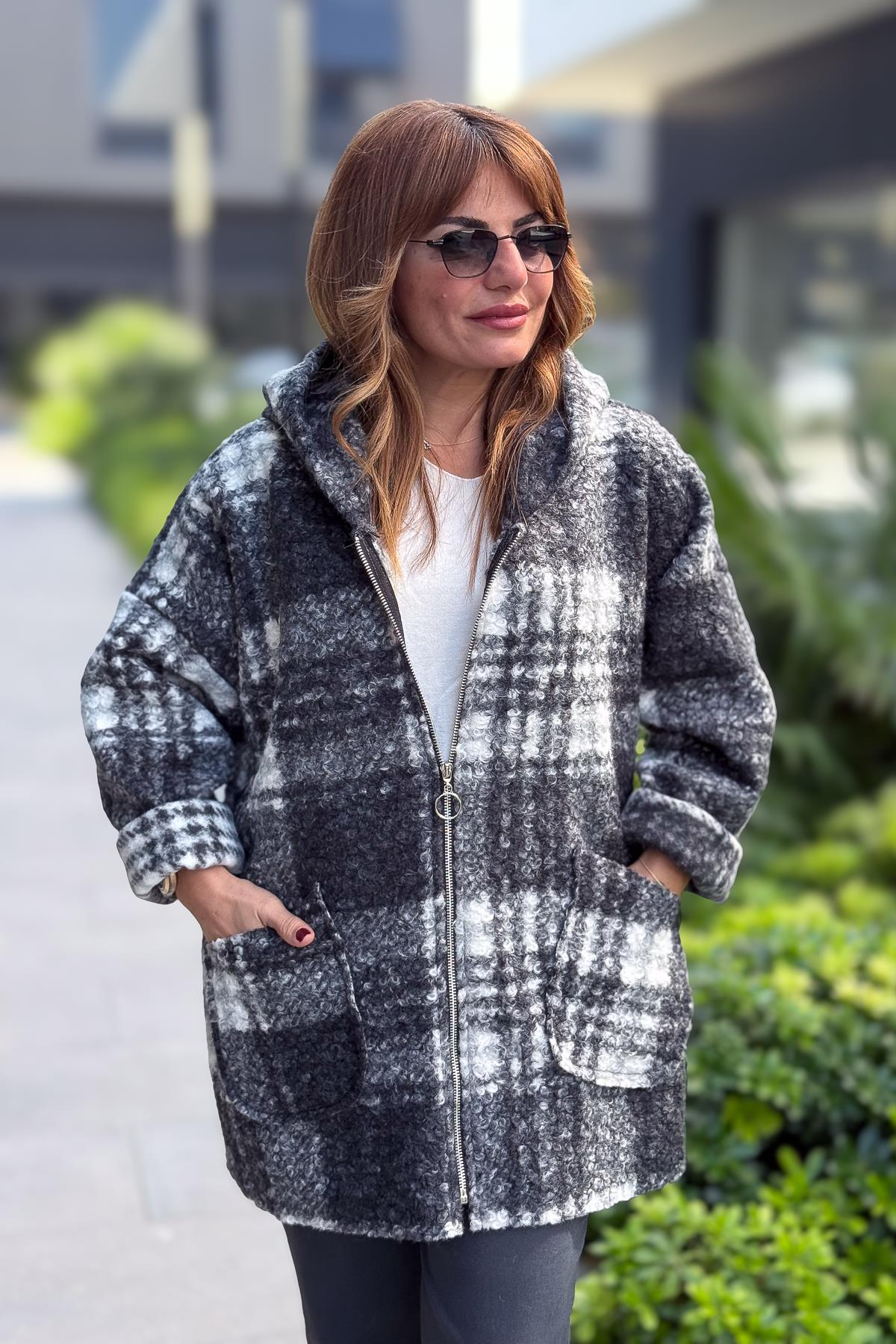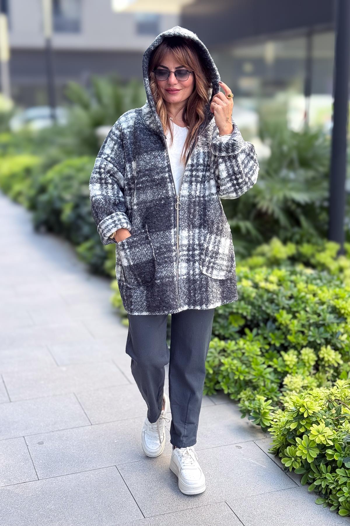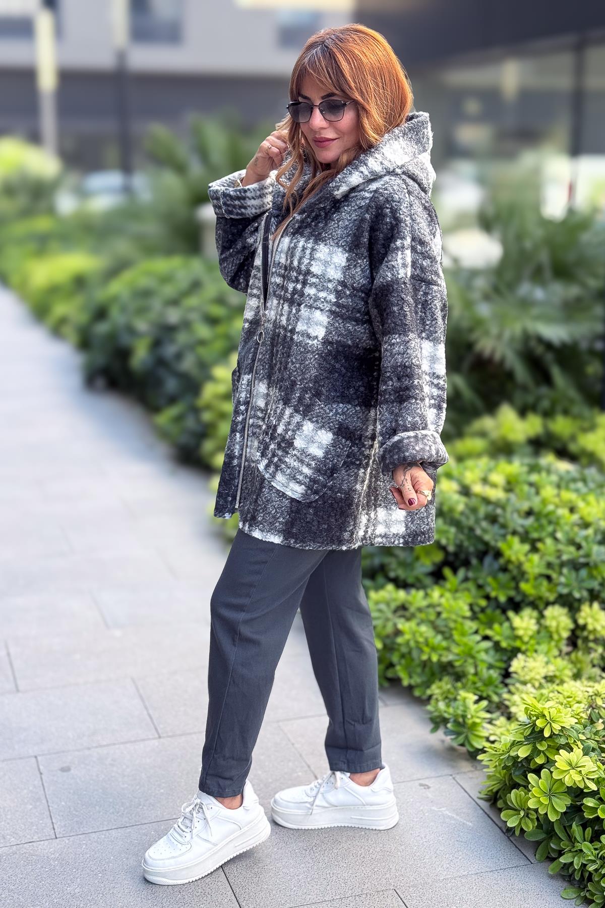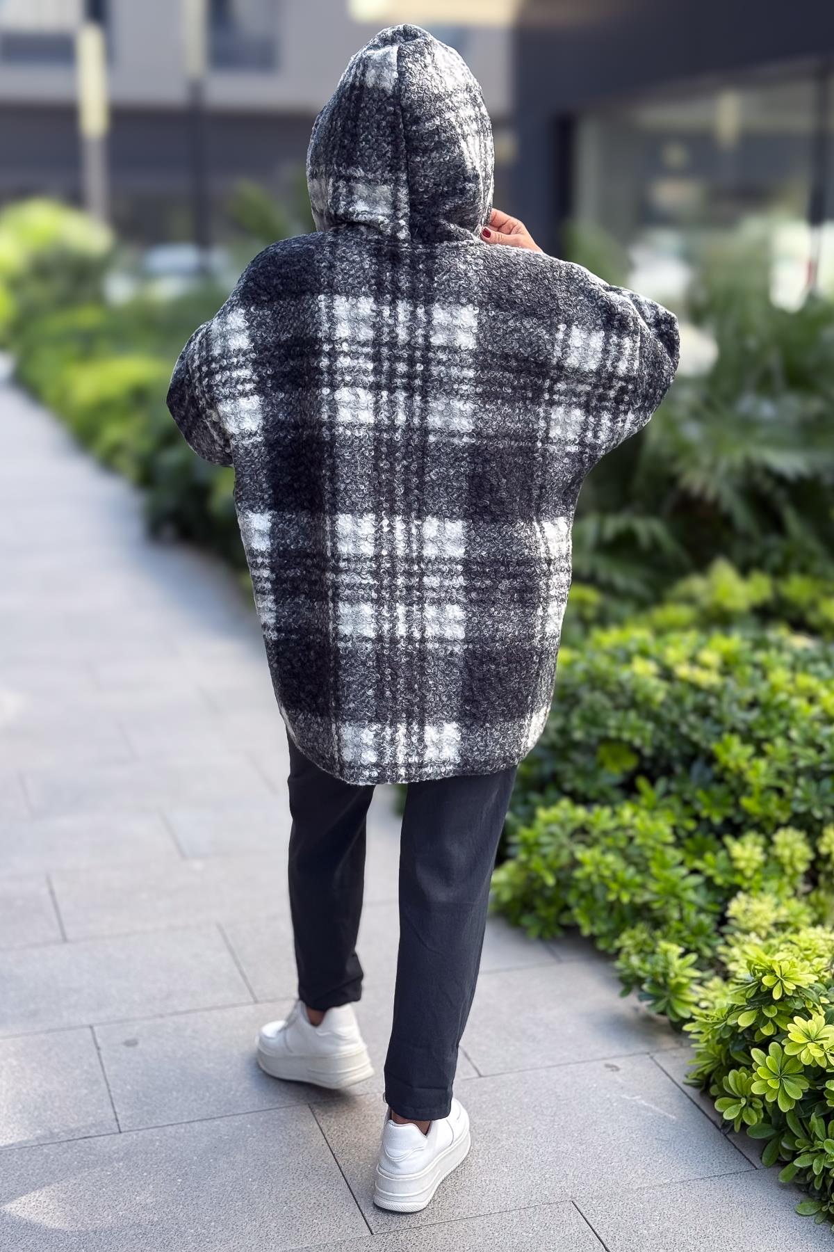 Ekose Desenli Keçe Kaban Gri Renk