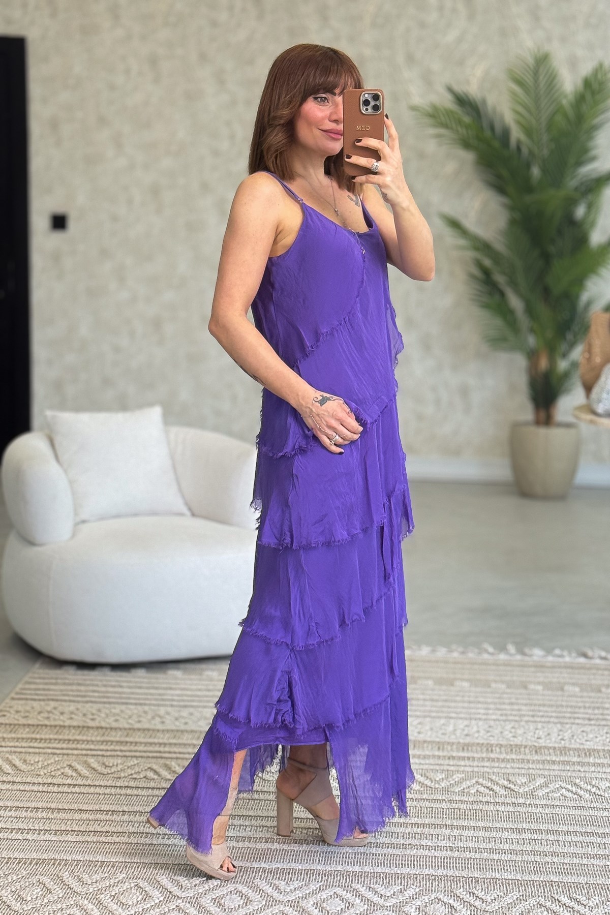 Asimetrik Kesim Kat Kat İpek Elbise Mor Renk