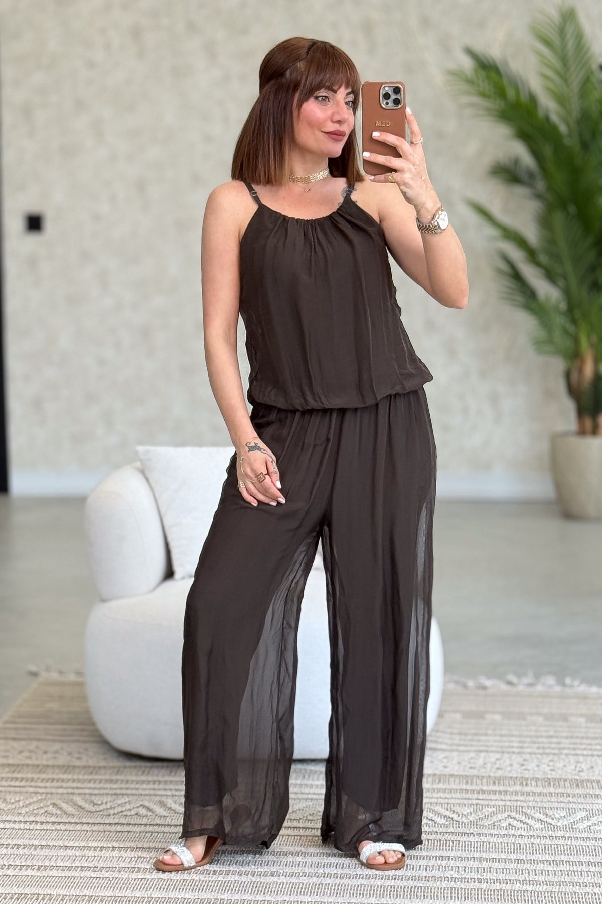 Askılı İpek Tulum Acı Kahve Renk