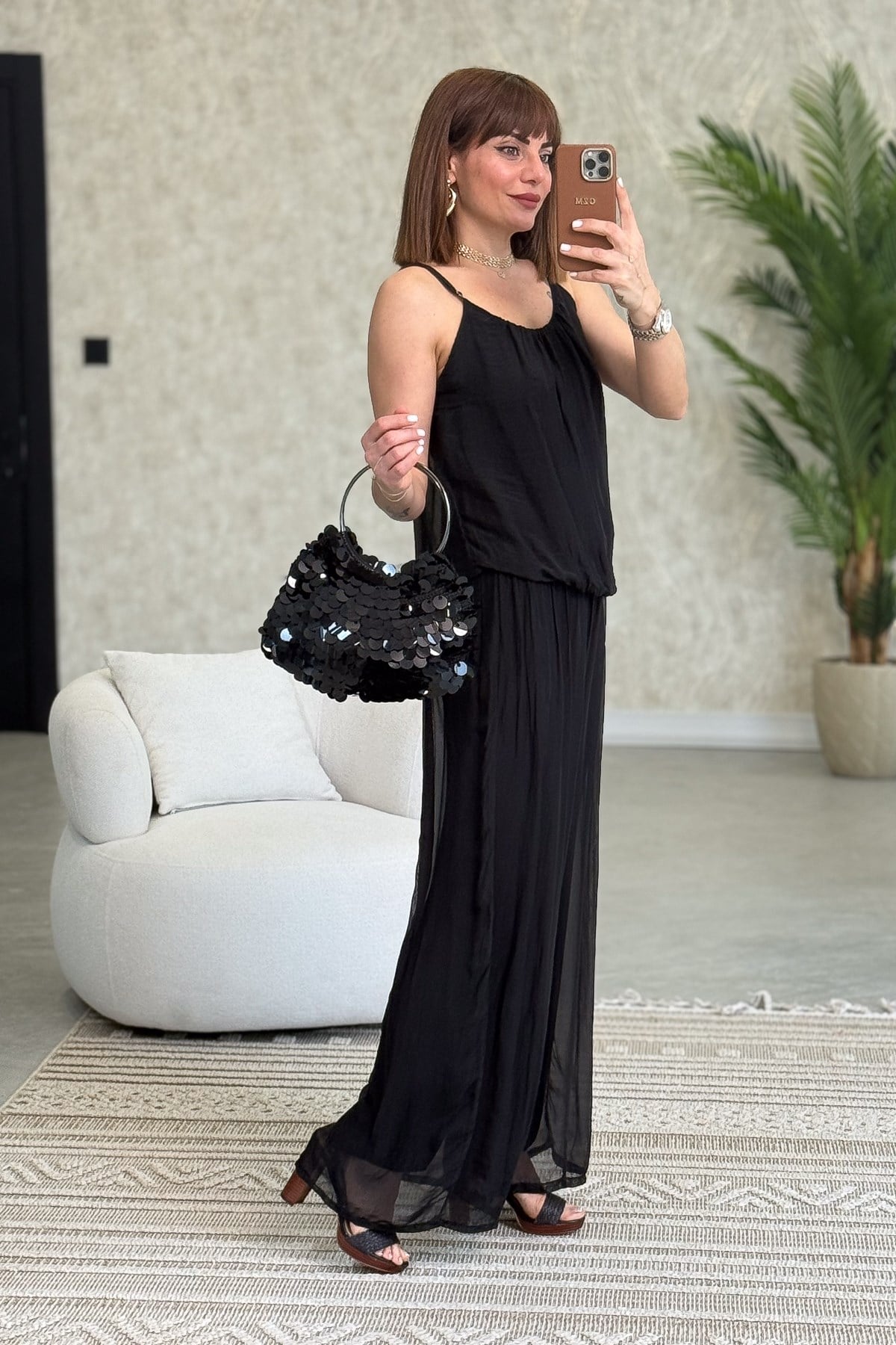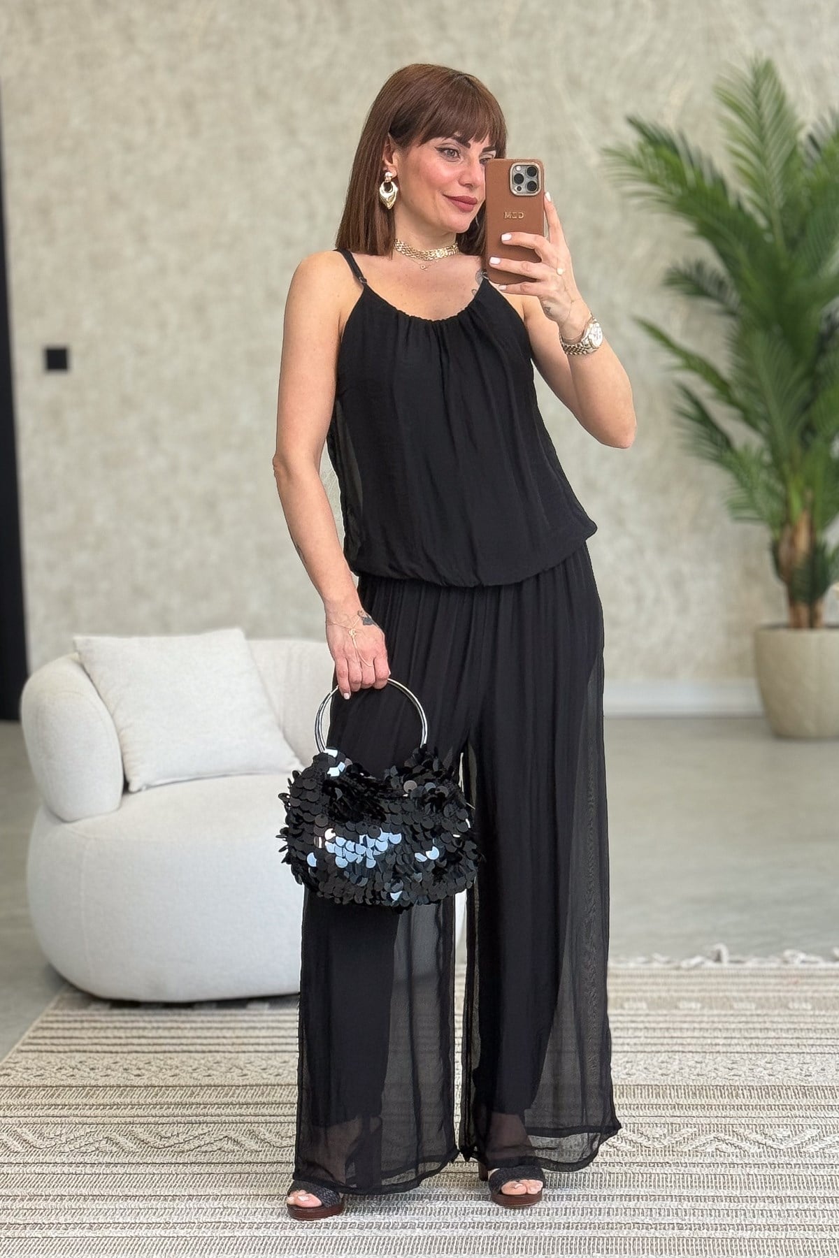 Askılı İpek Tulum Siyah Renk