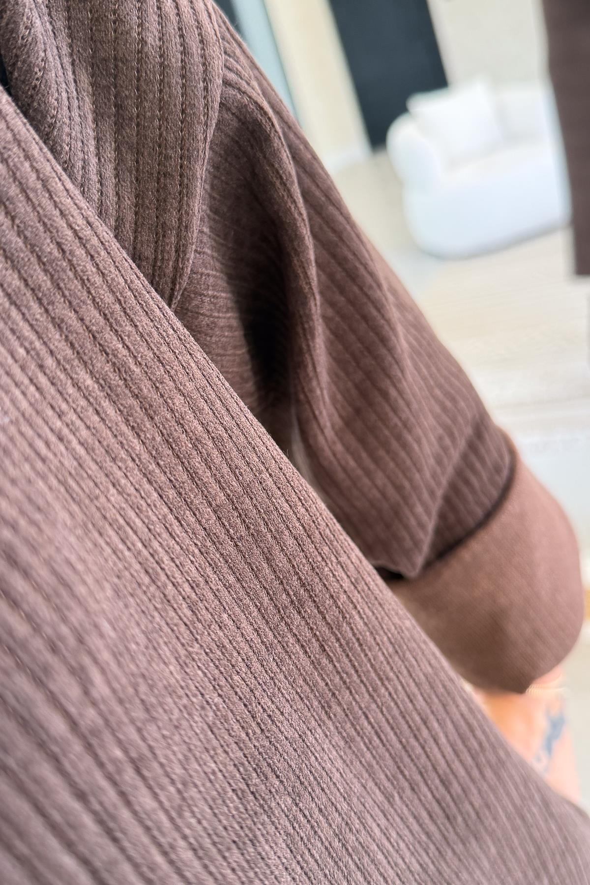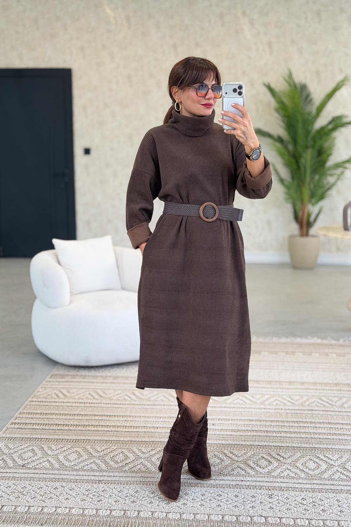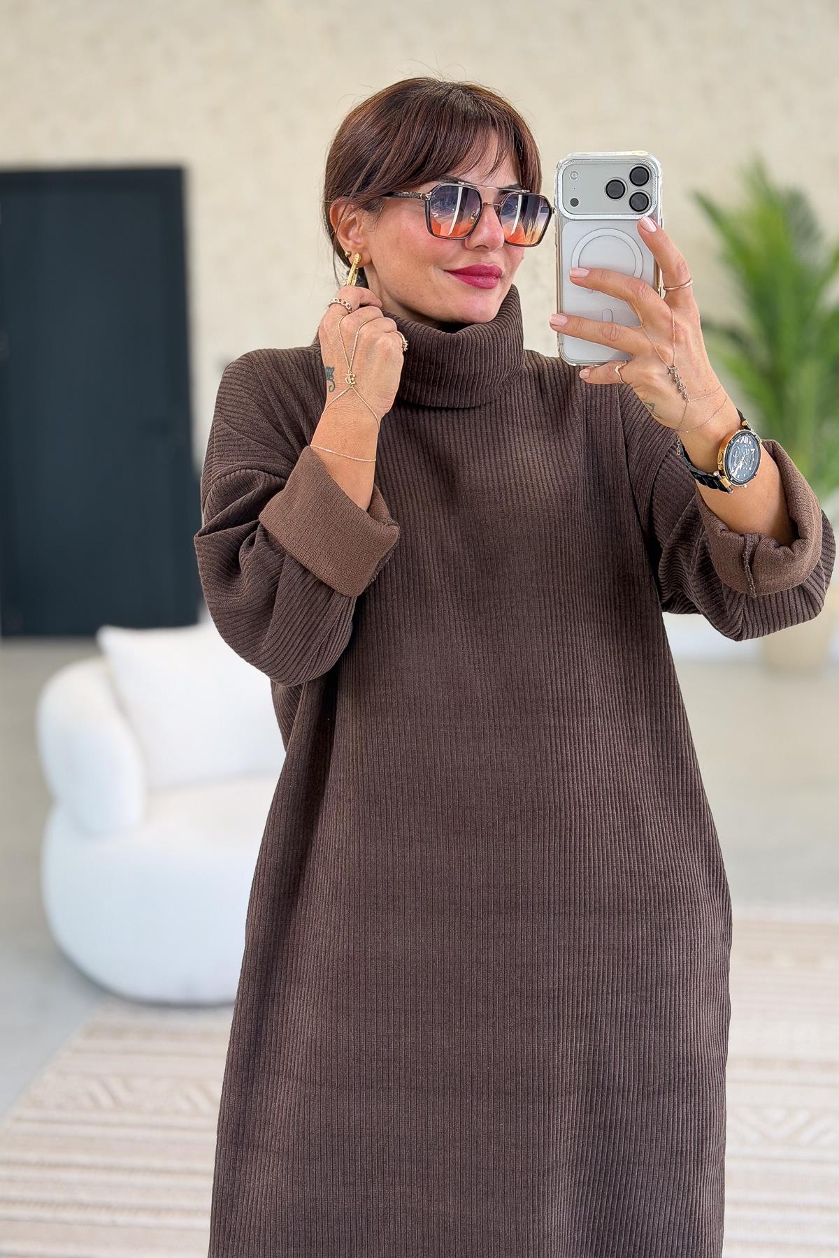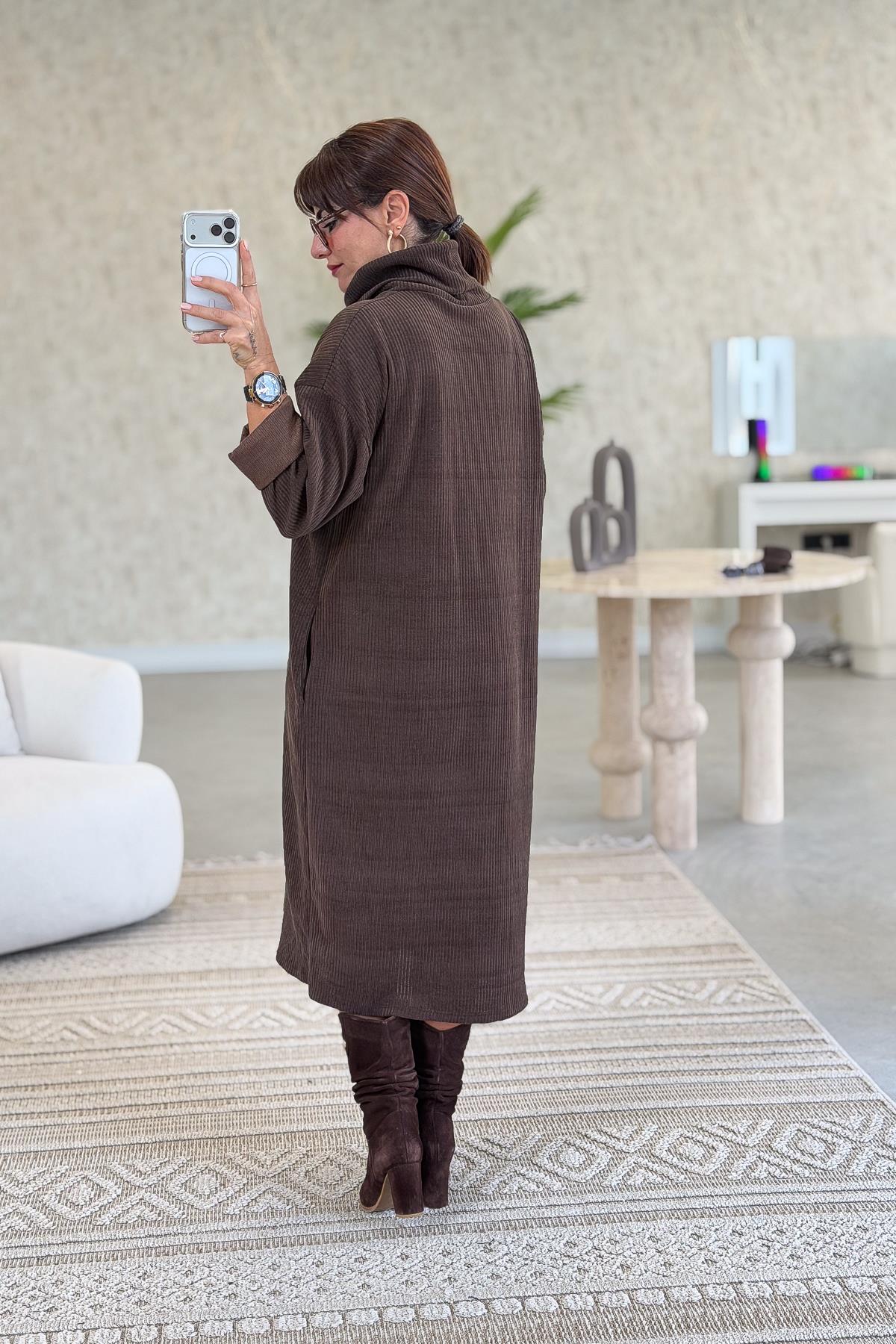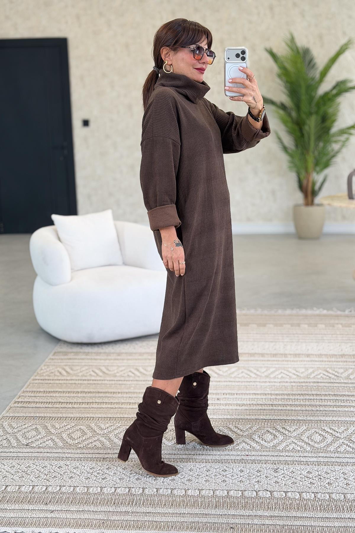 Balıkçı Yaka Midi Boy Kalın Fitilli Kadife Elbise Acı Kahve Renk