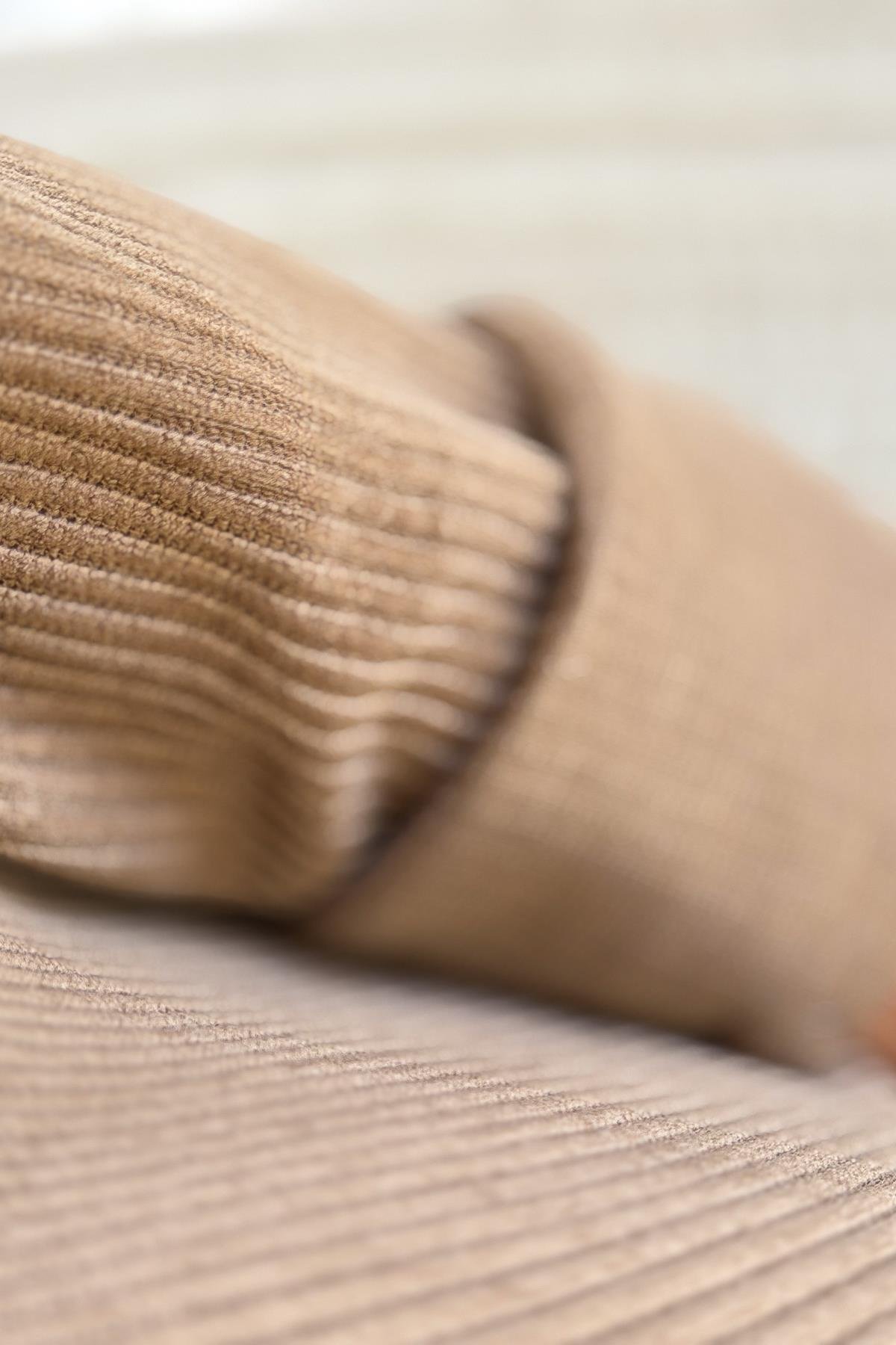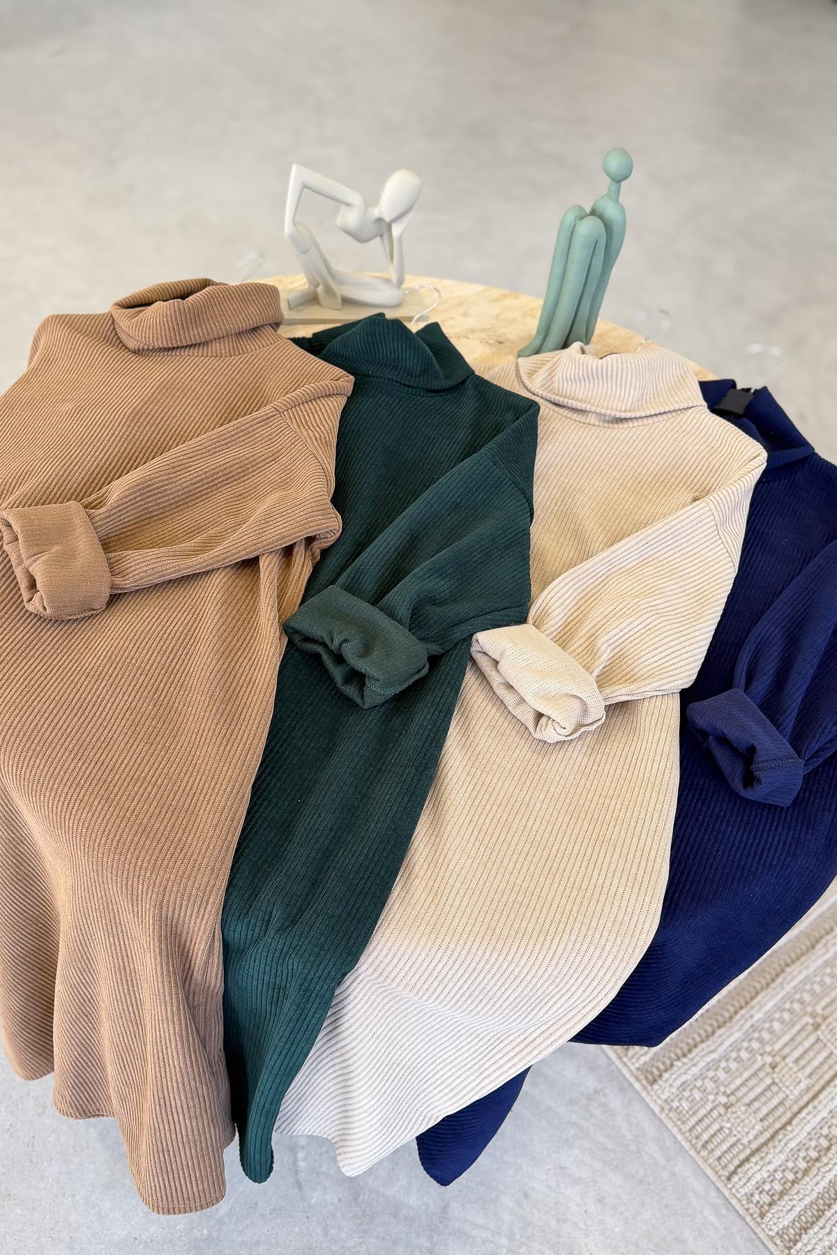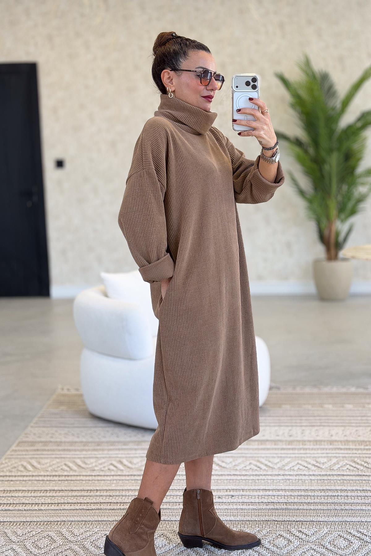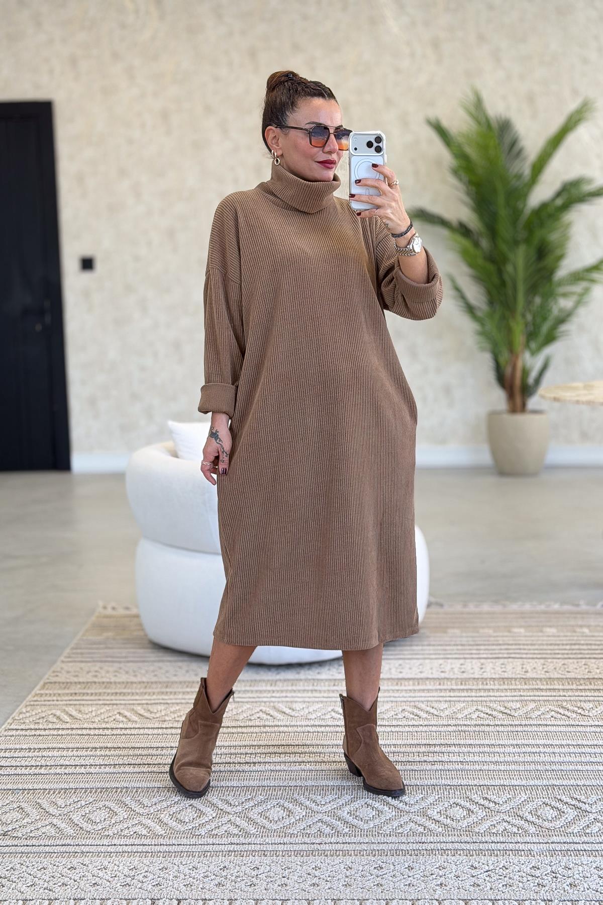 Balıkçı Yaka Midi Boy Kalın Fitilli Kadife Elbise Bal Köpüğü Renk