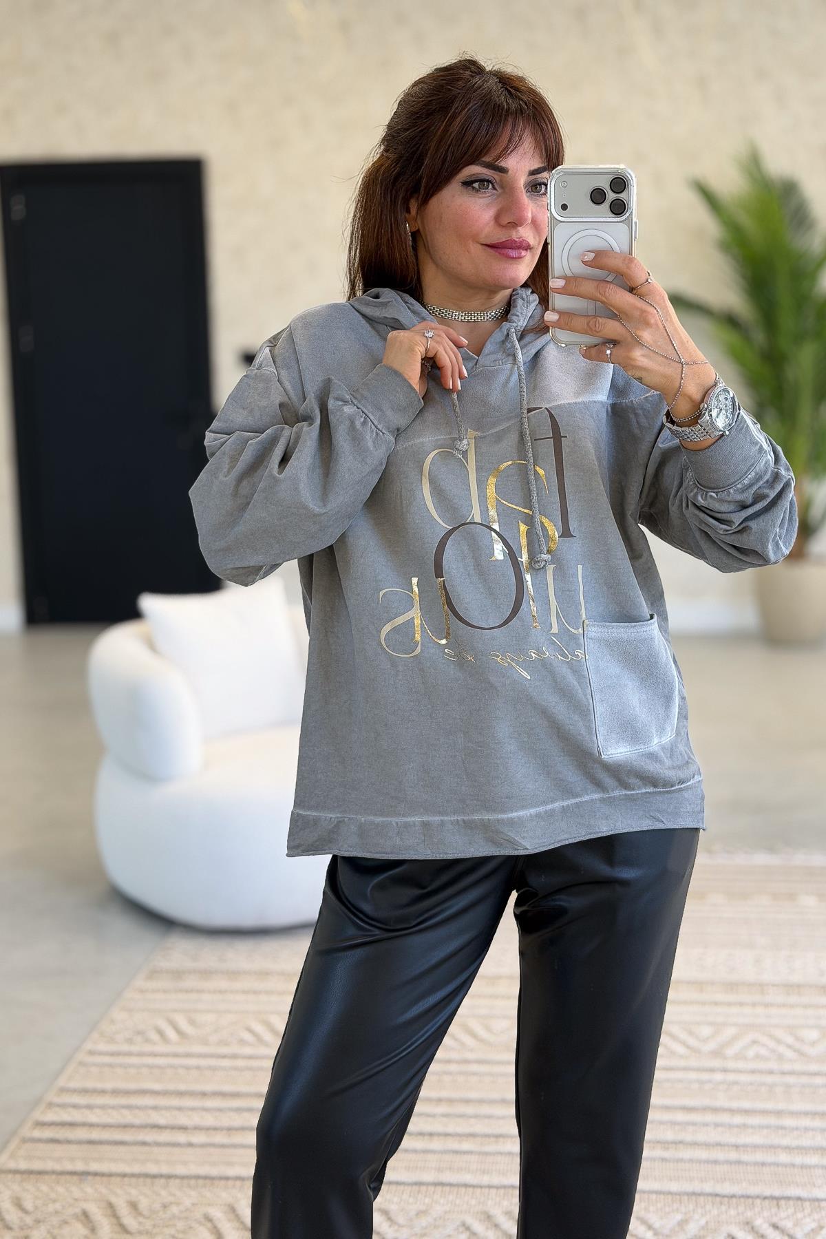Cep Detaylı Gold Yazılı Yıkamalı Kapüşonlu Sweet Gri Renk