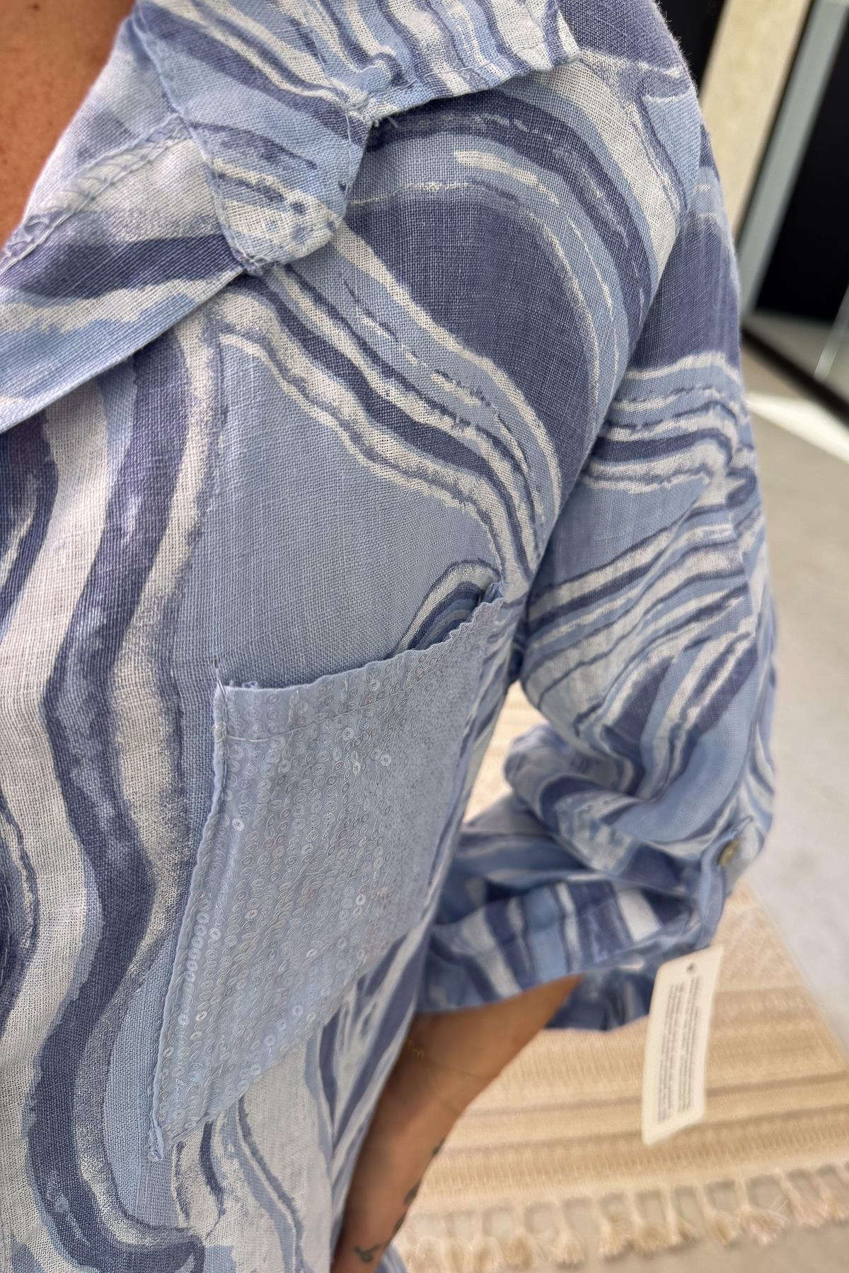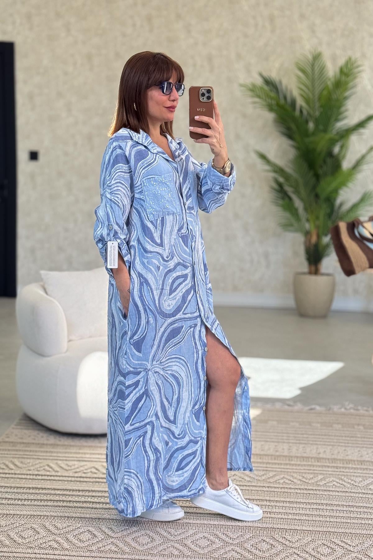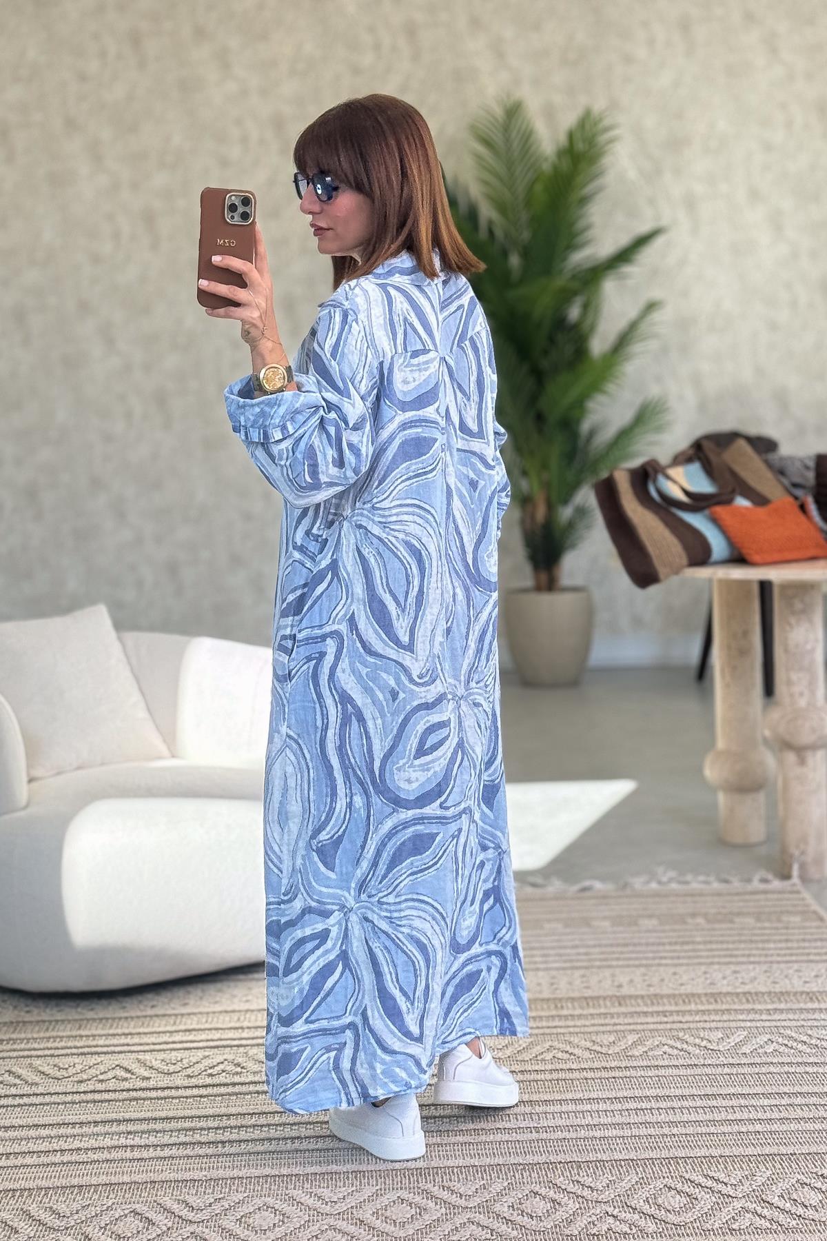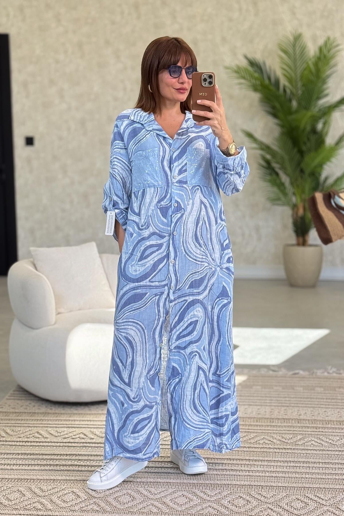 Cepleri Pullu Mermer Desenli Uzunboy Keten Gömlek Elbise Bebe Mavi Renk