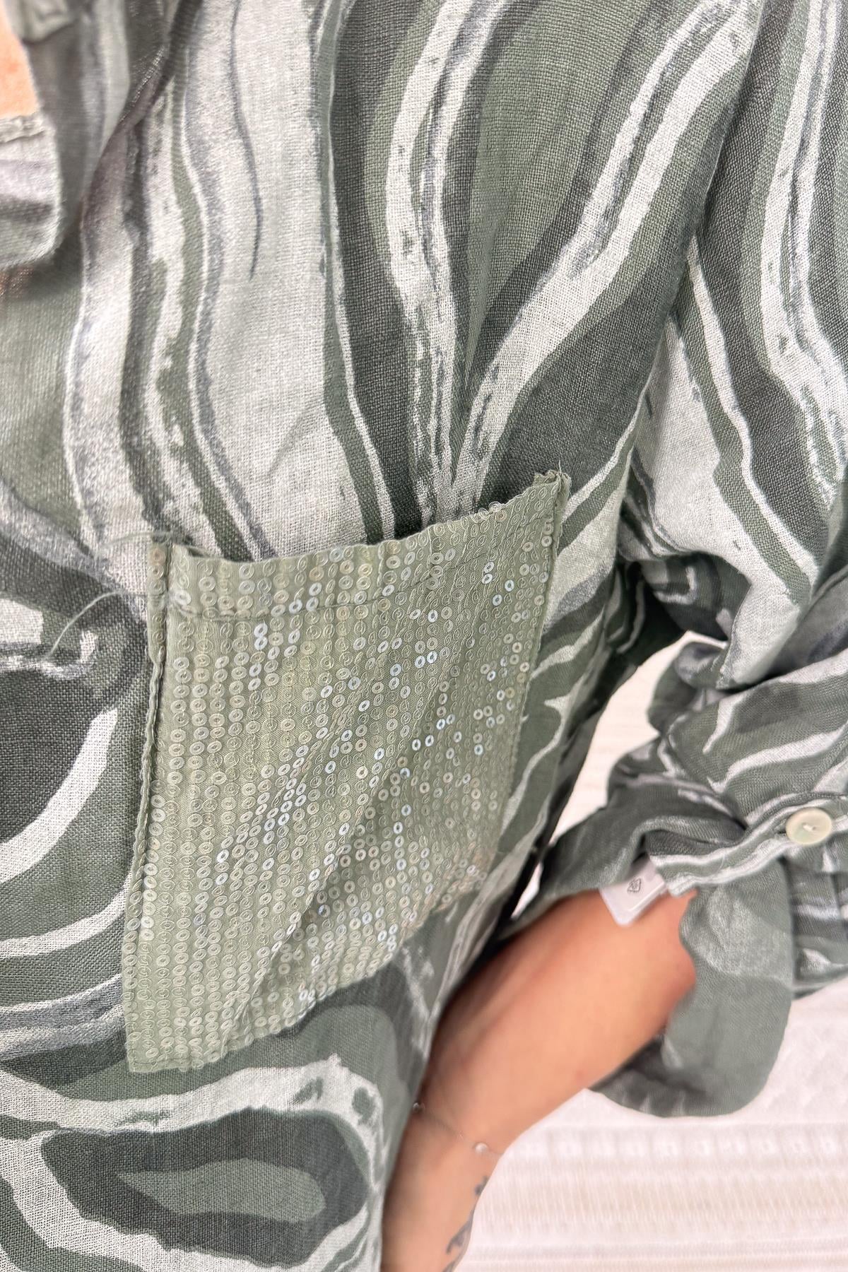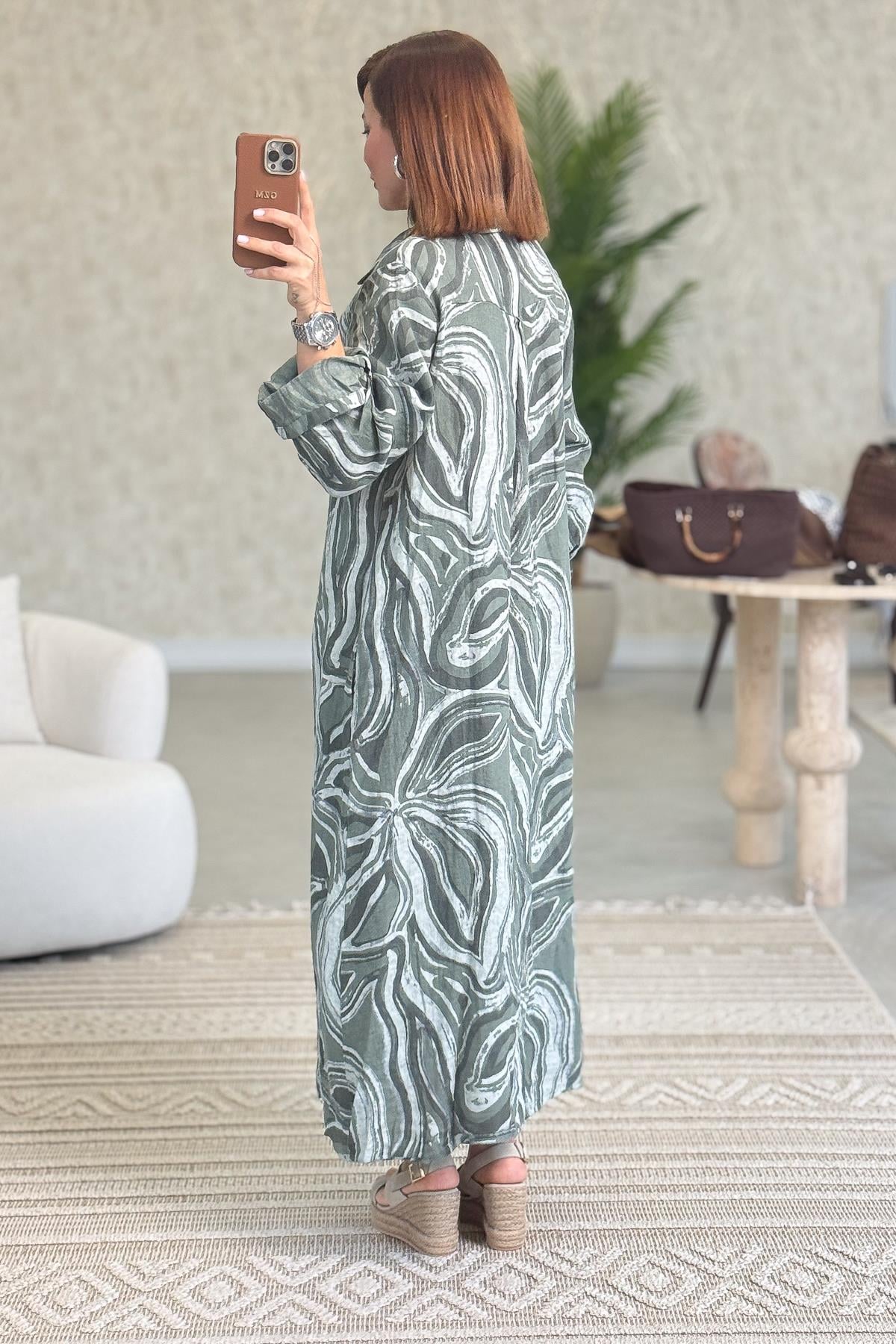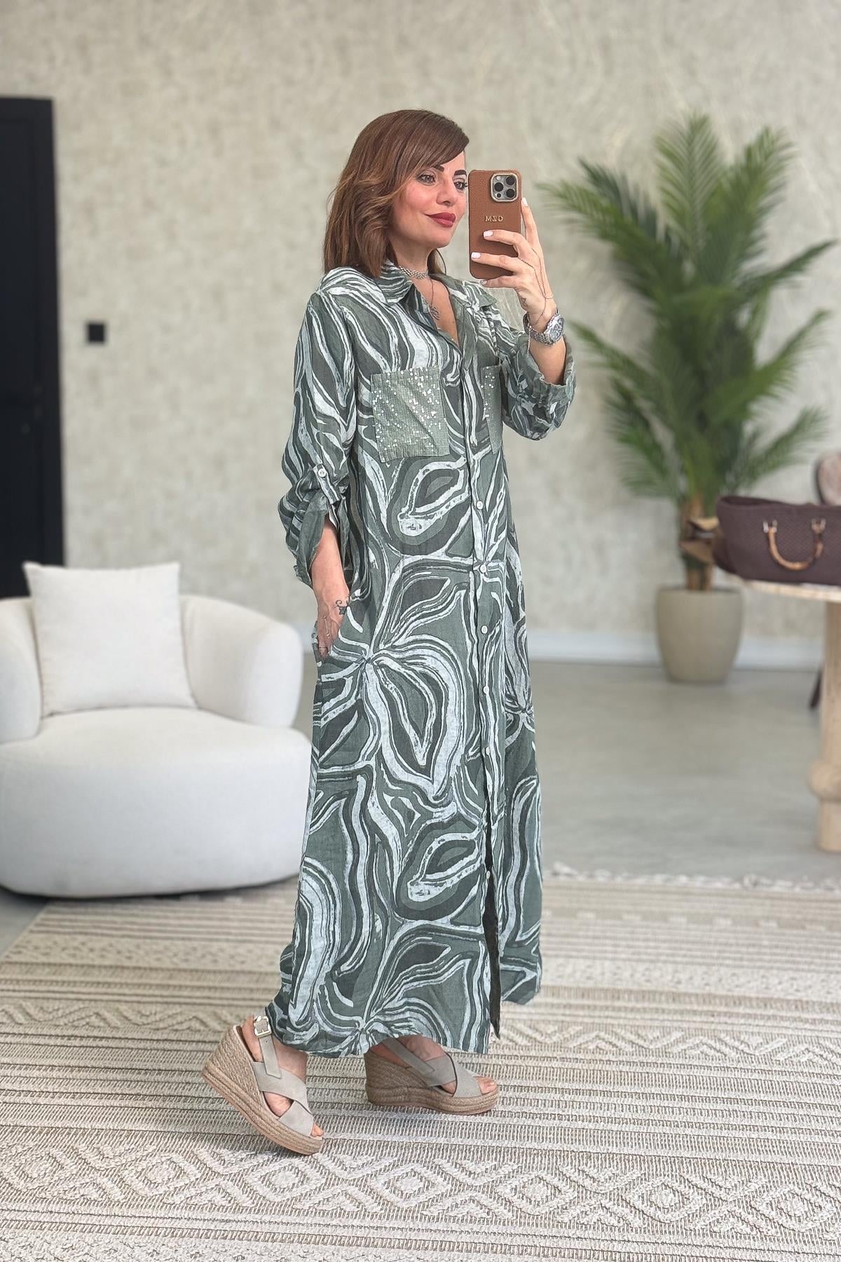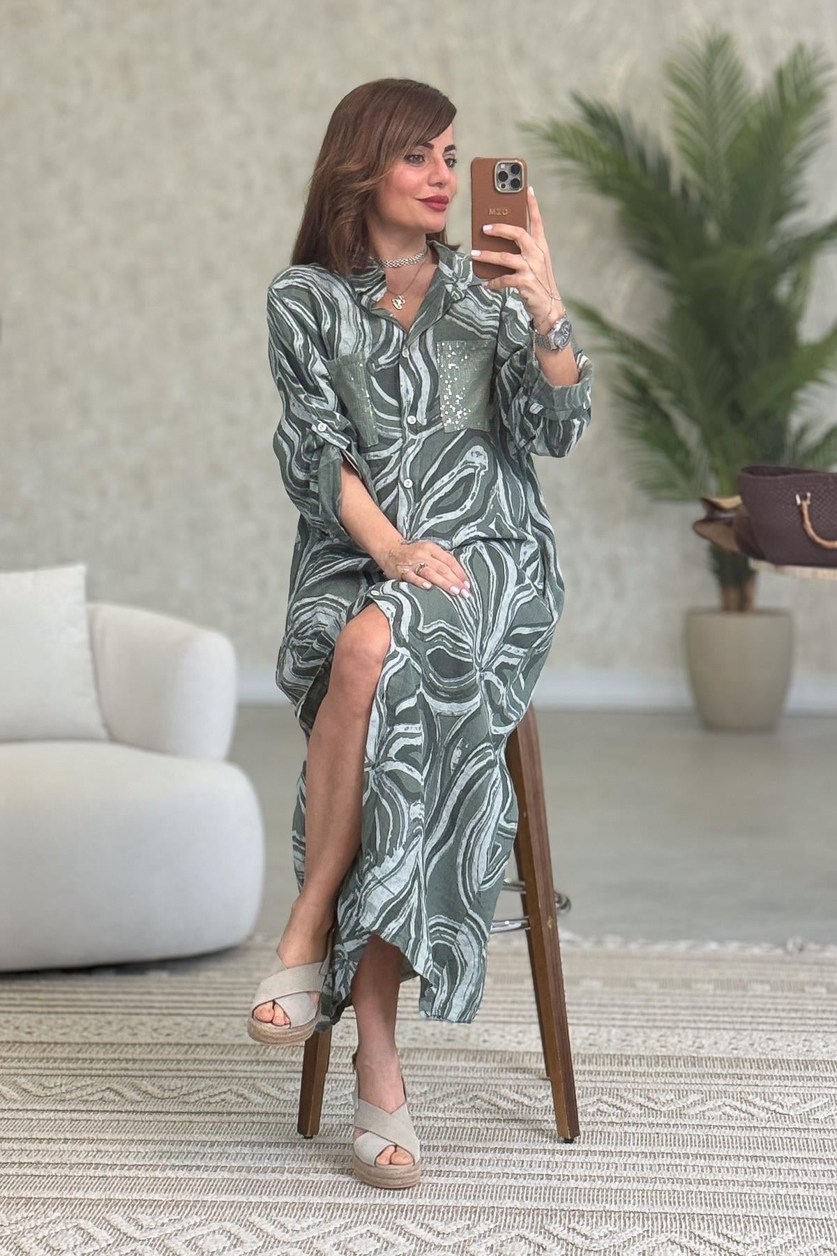 Cepleri Pullu Mermer Desenli Uzunboy Keten Gömlek Elbise Haki Renk