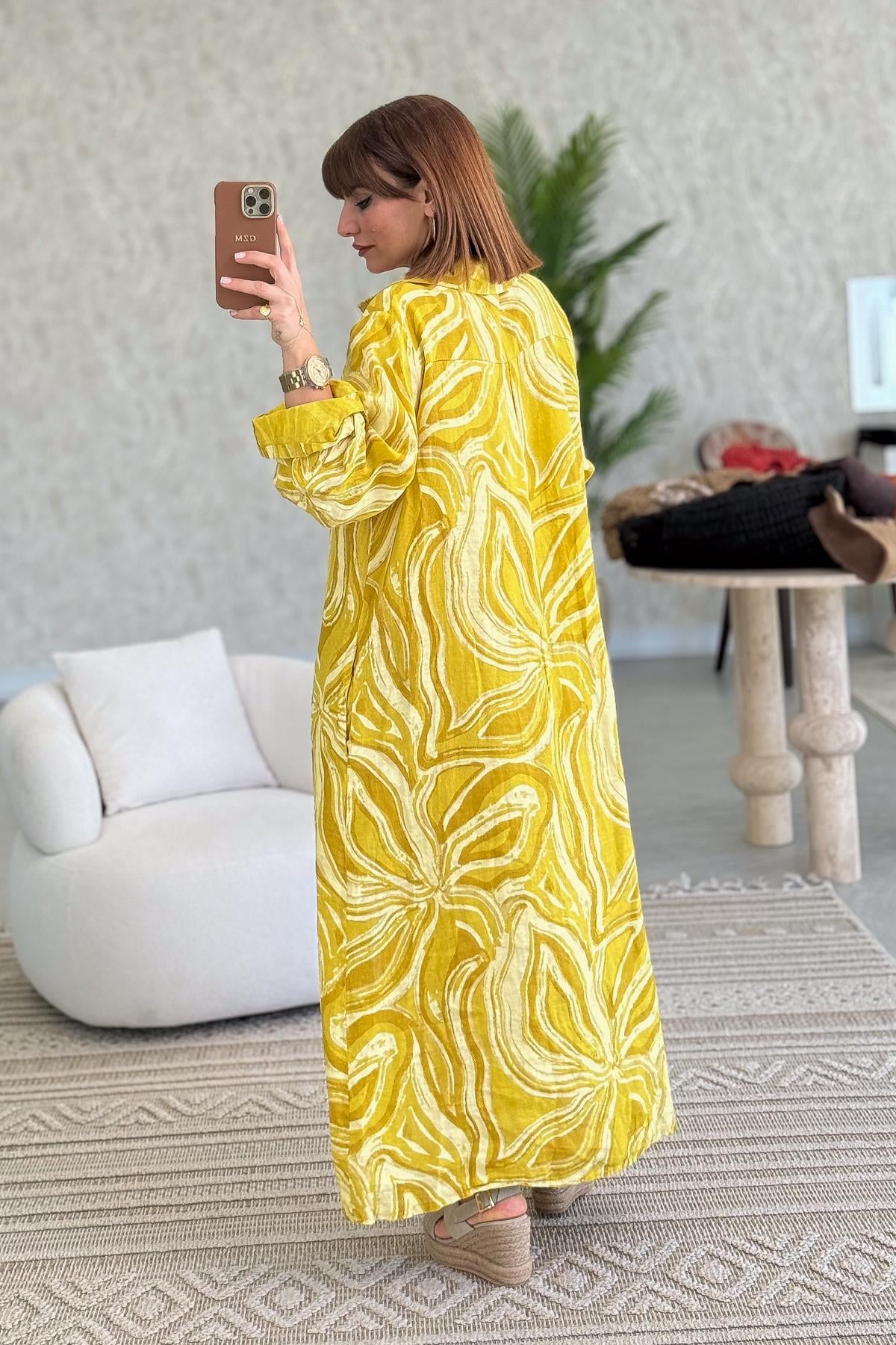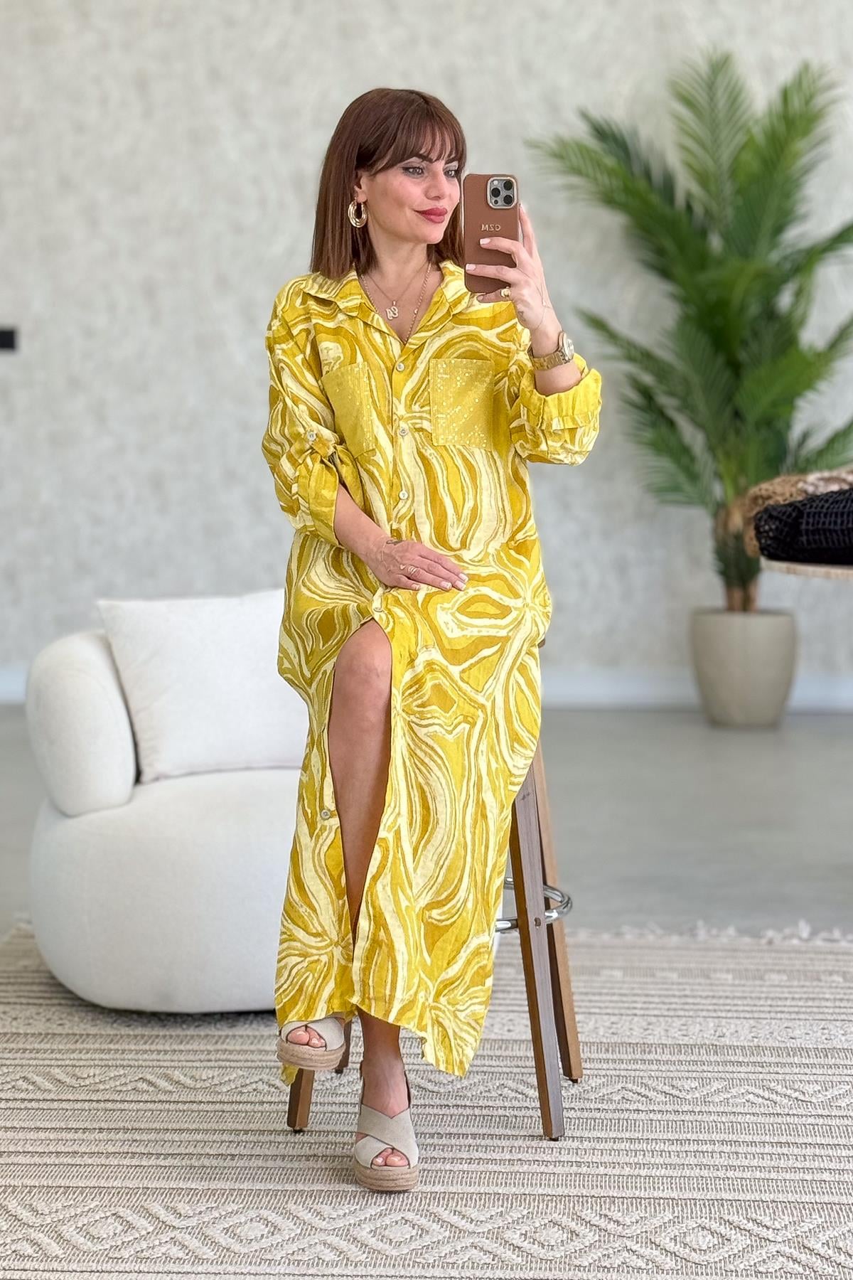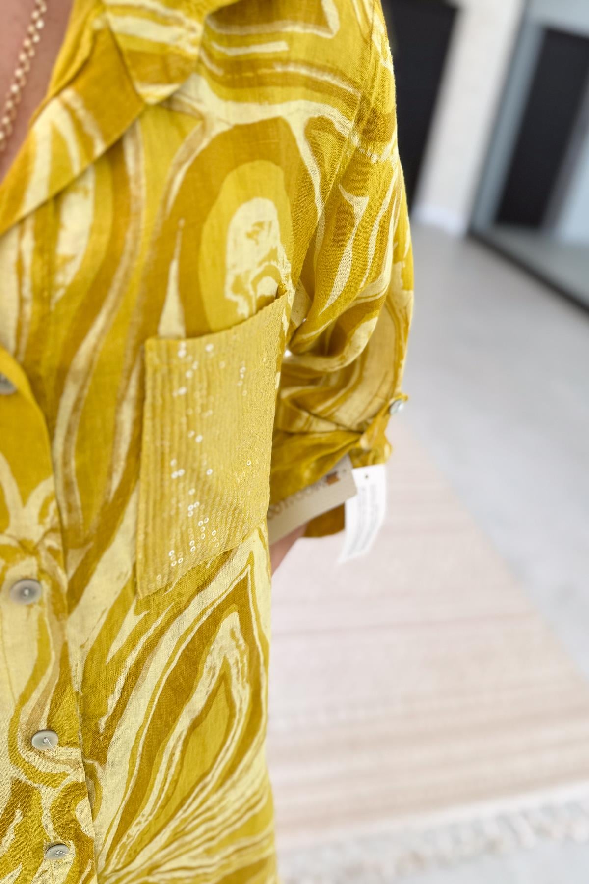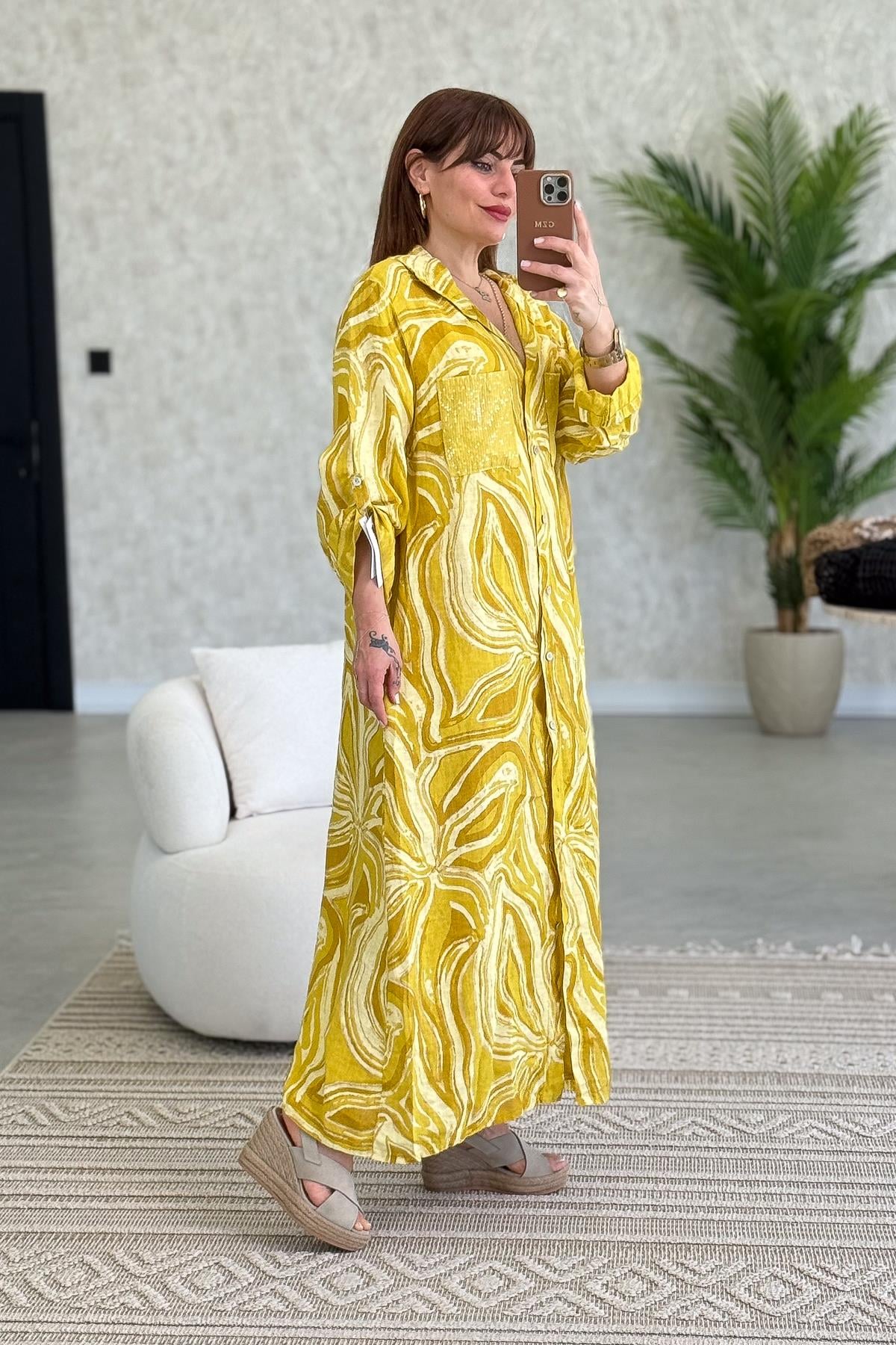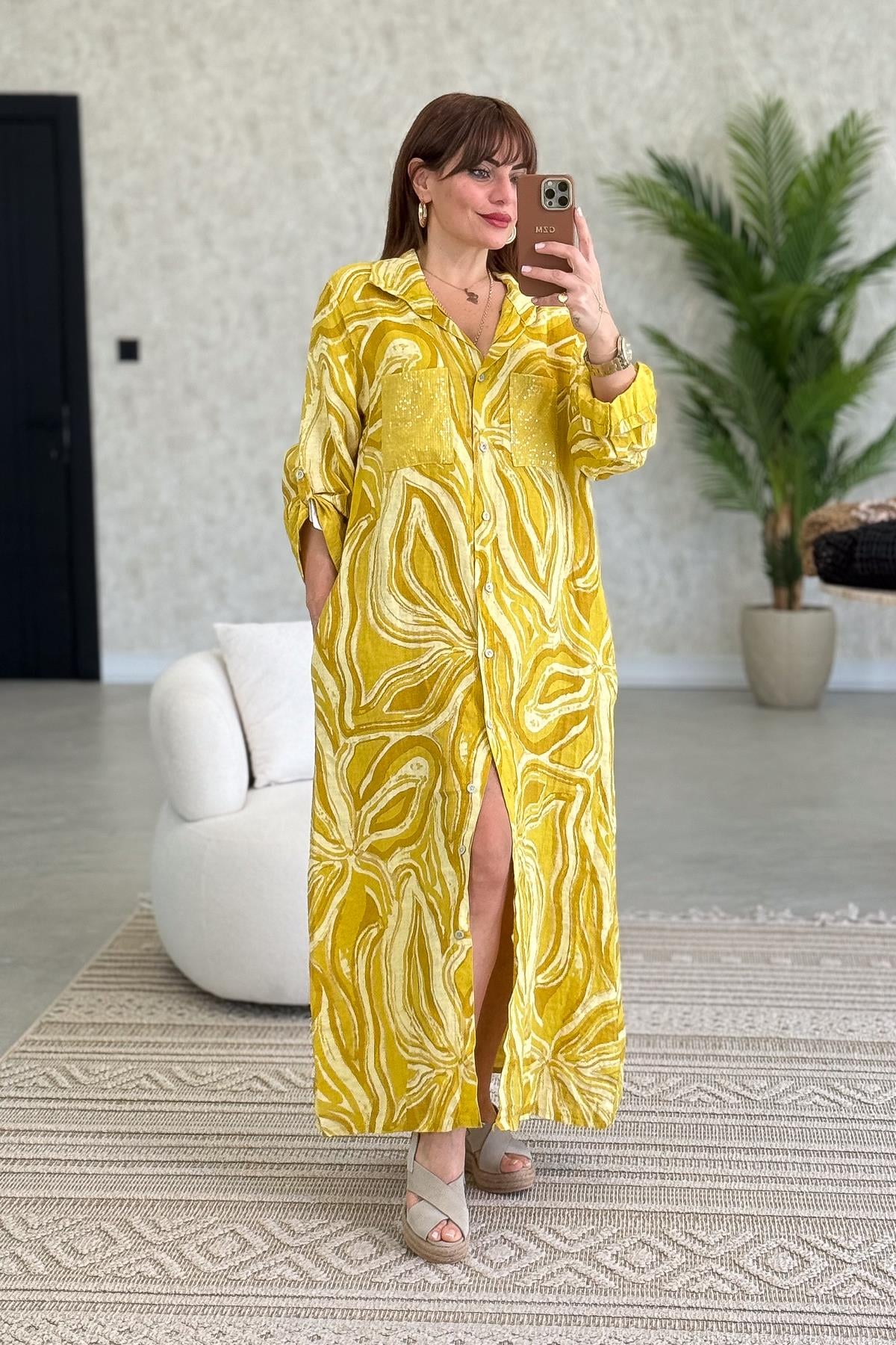 Cepleri Pullu Mermer Desenli Uzunboy Keten Gömlek Elbise Hardal Renk