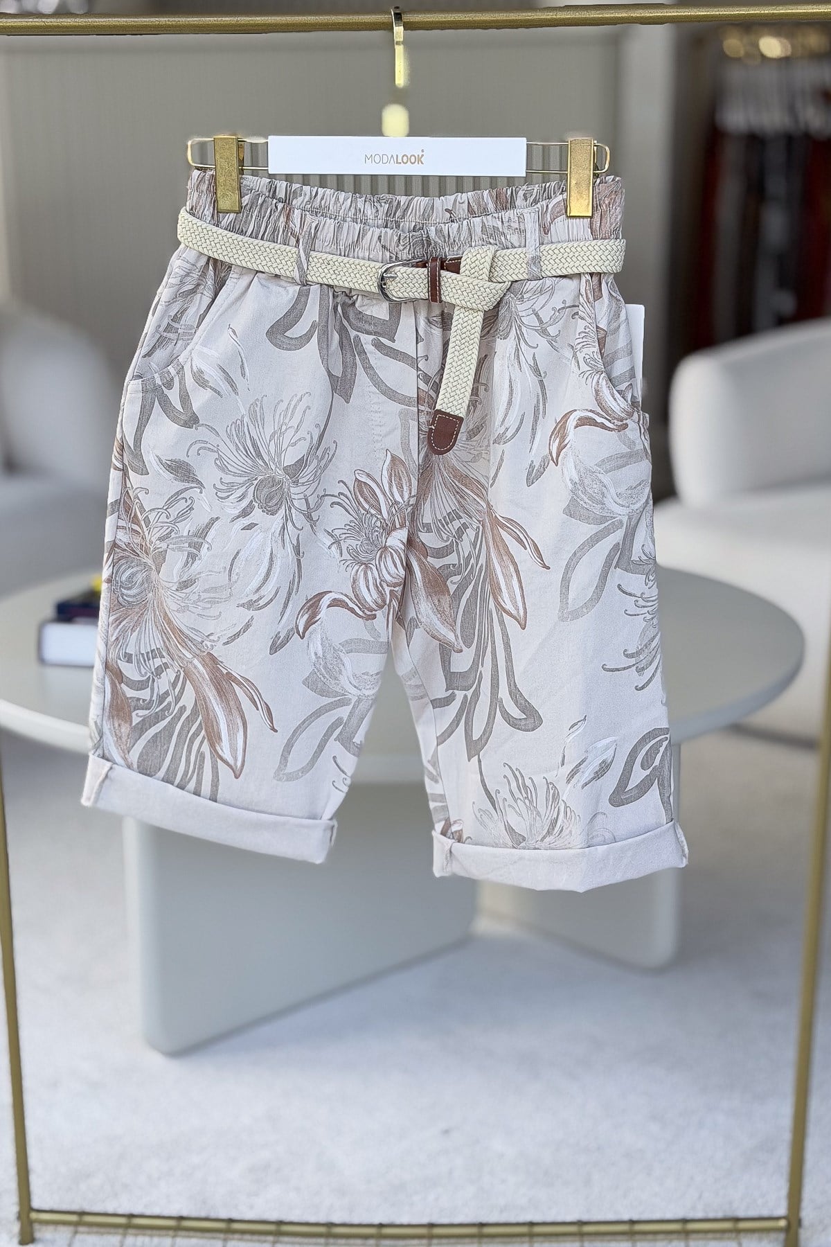 Çiçek Baskılı Kemerli Bermuda Şort Bej Renk