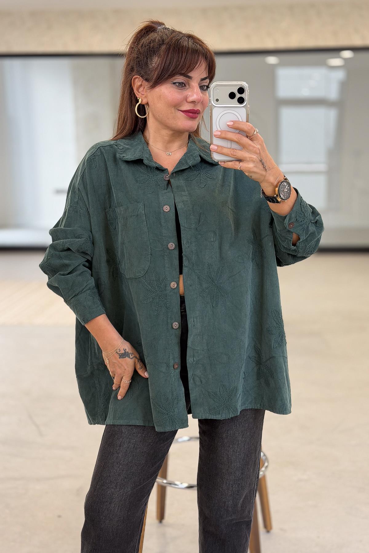 Çiçek Nakışlı Kadife Gömlek Nefti Yeşil Renk