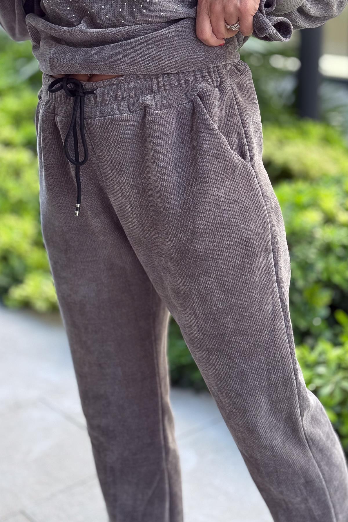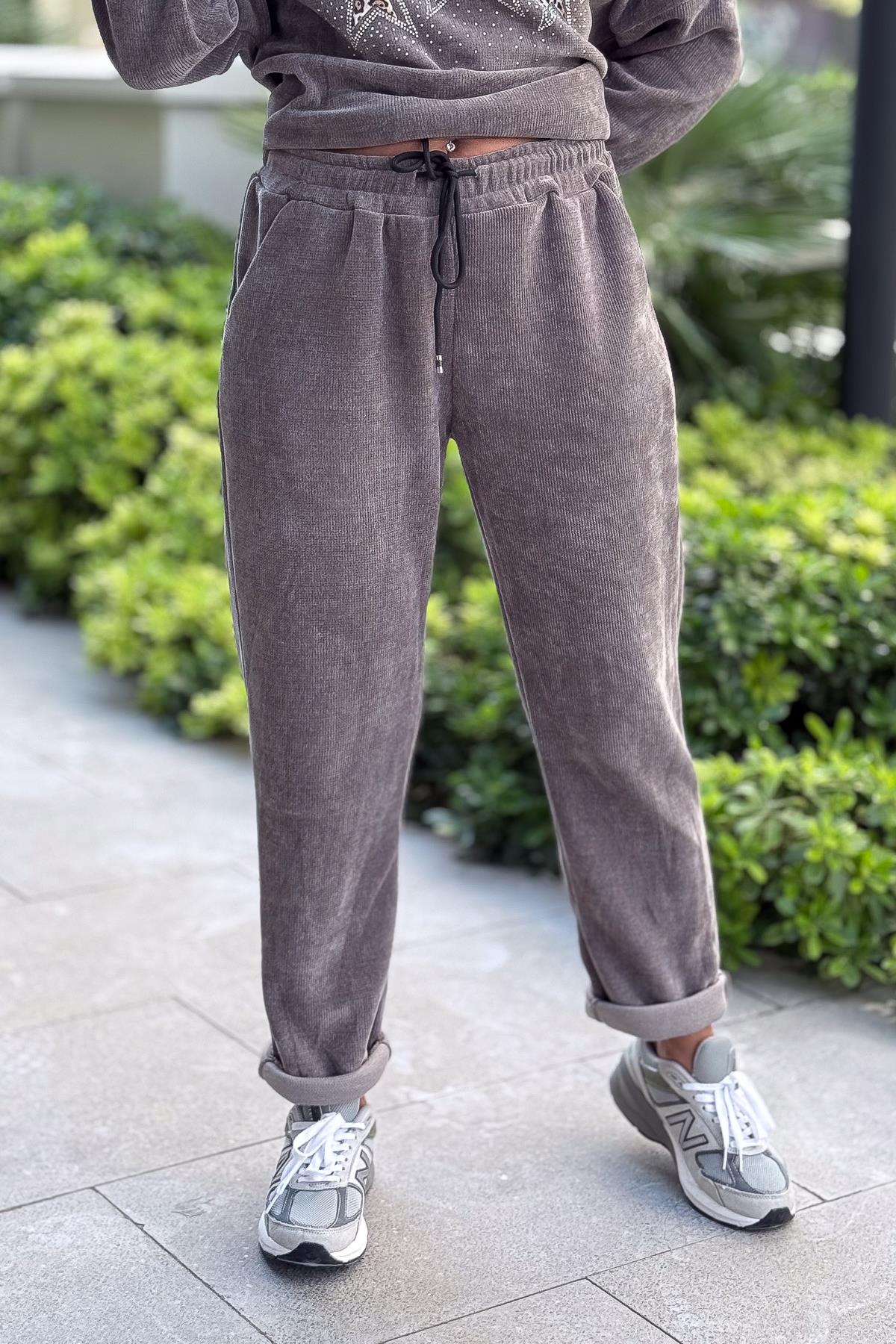 Havuç Paça Beli Lastikli Düz Basic Kadife Eşorfman Altı Gri Renk