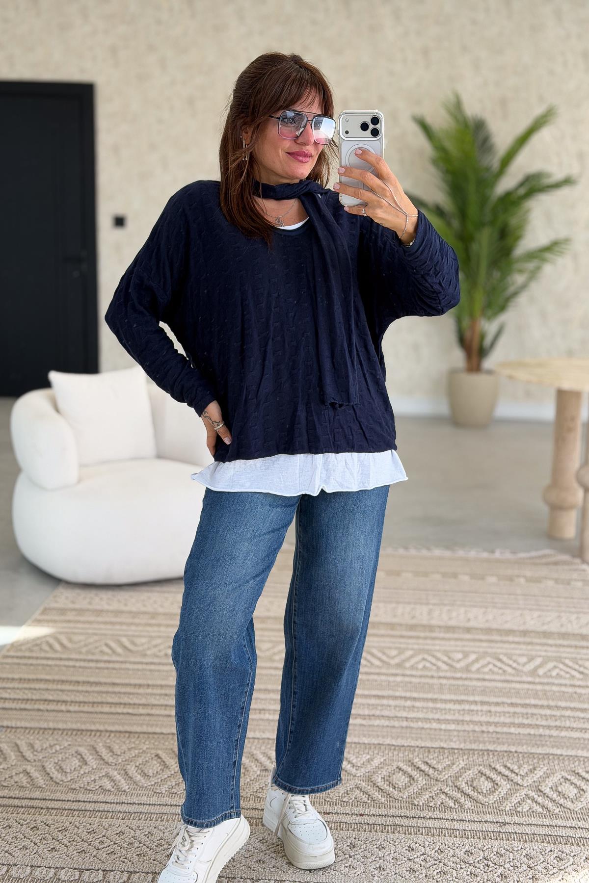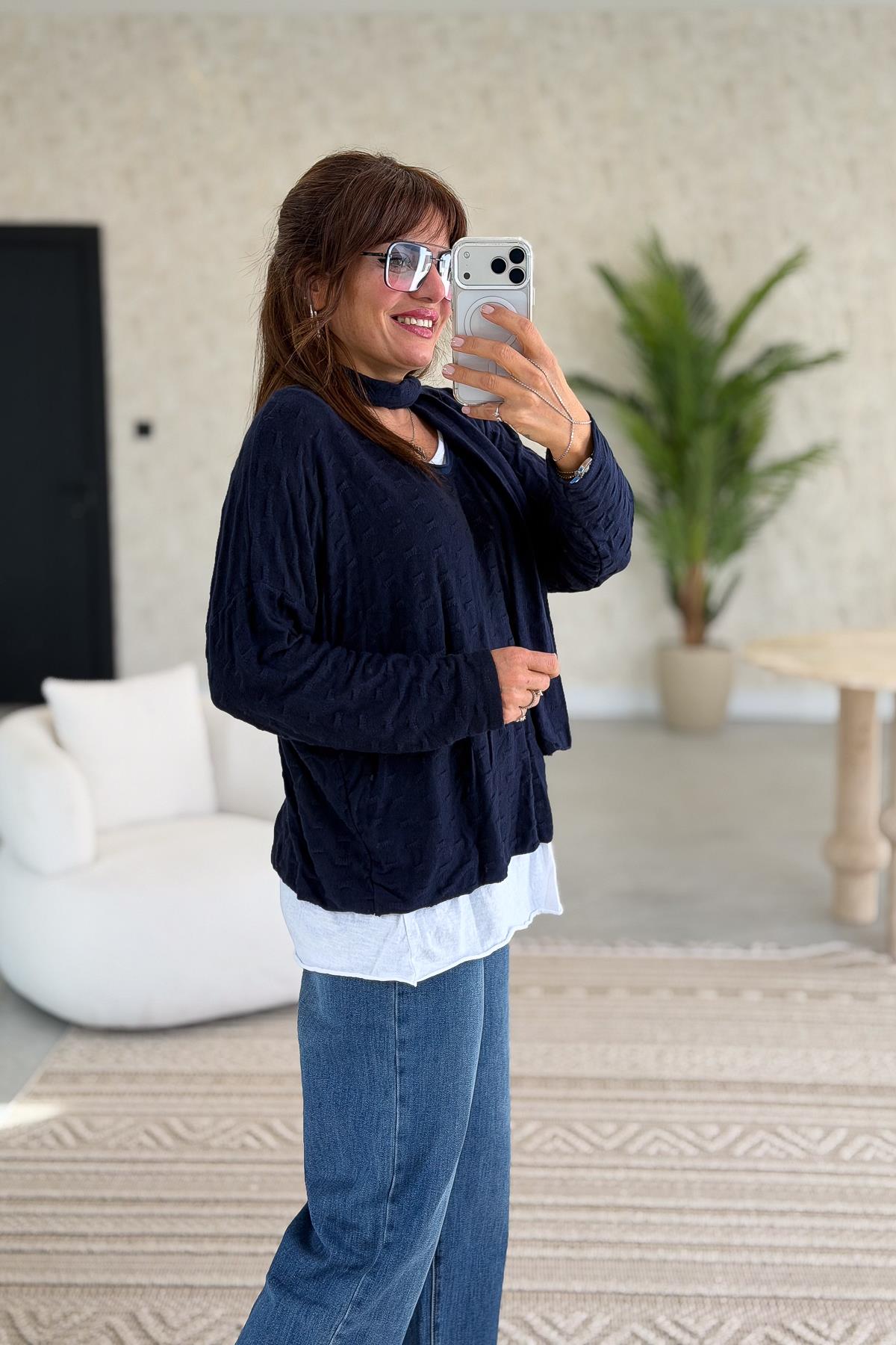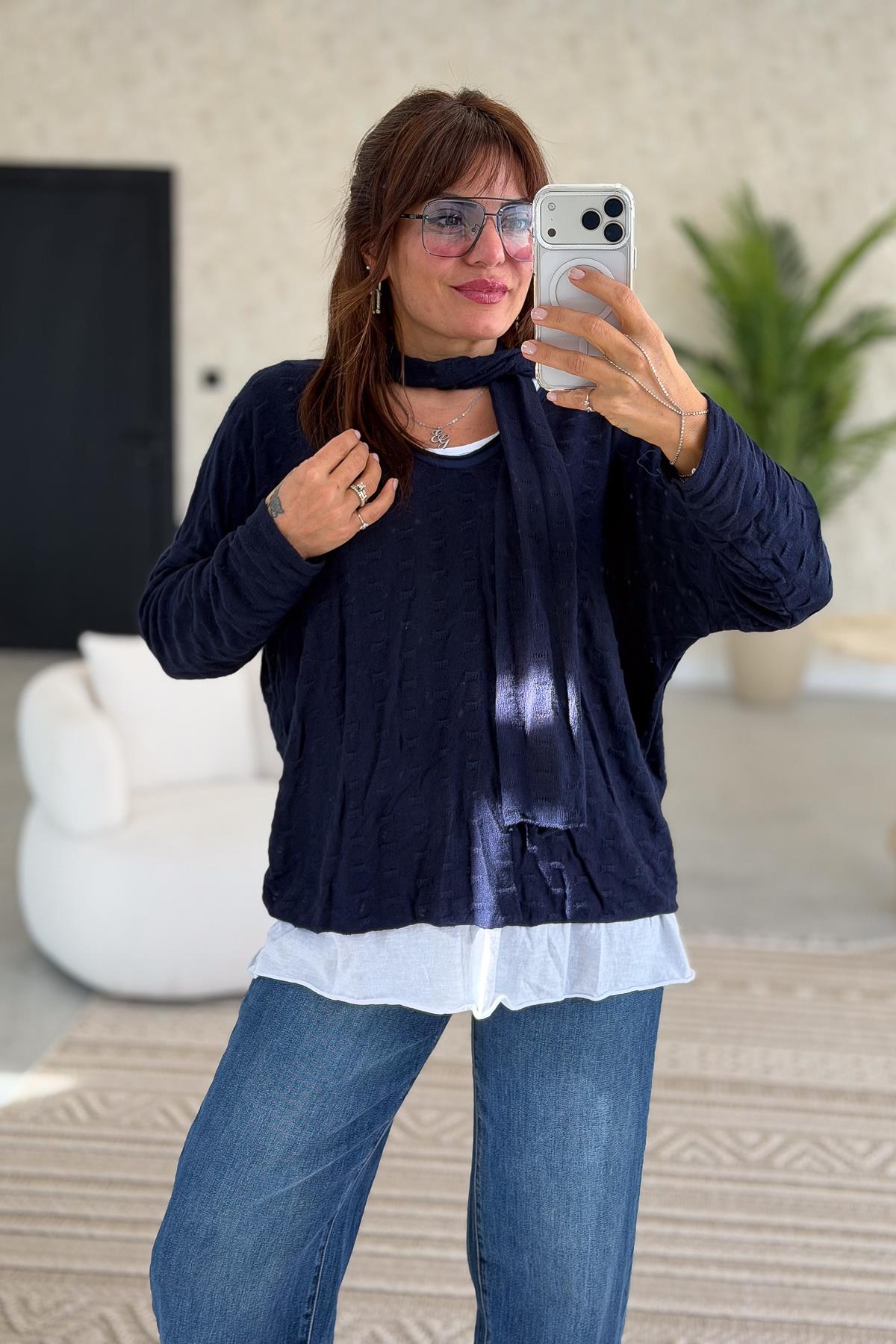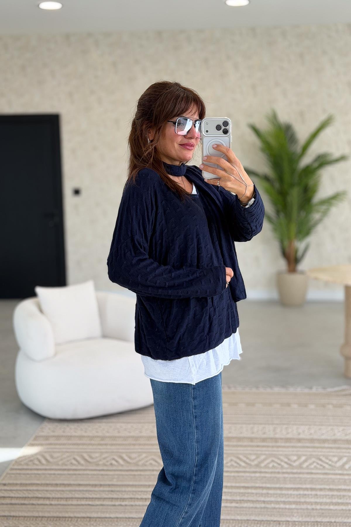 İç Astarı Pamuklu Üstü Trikolu Şallı Takım Bluz Lacivert Renk