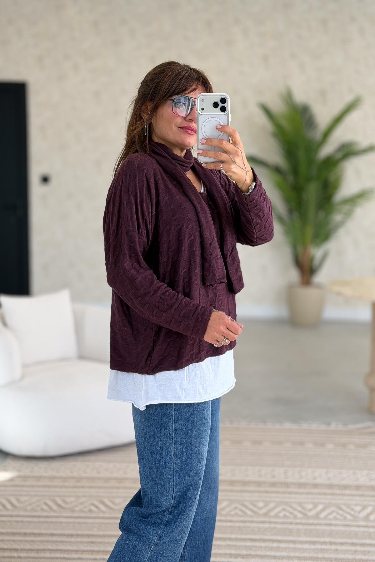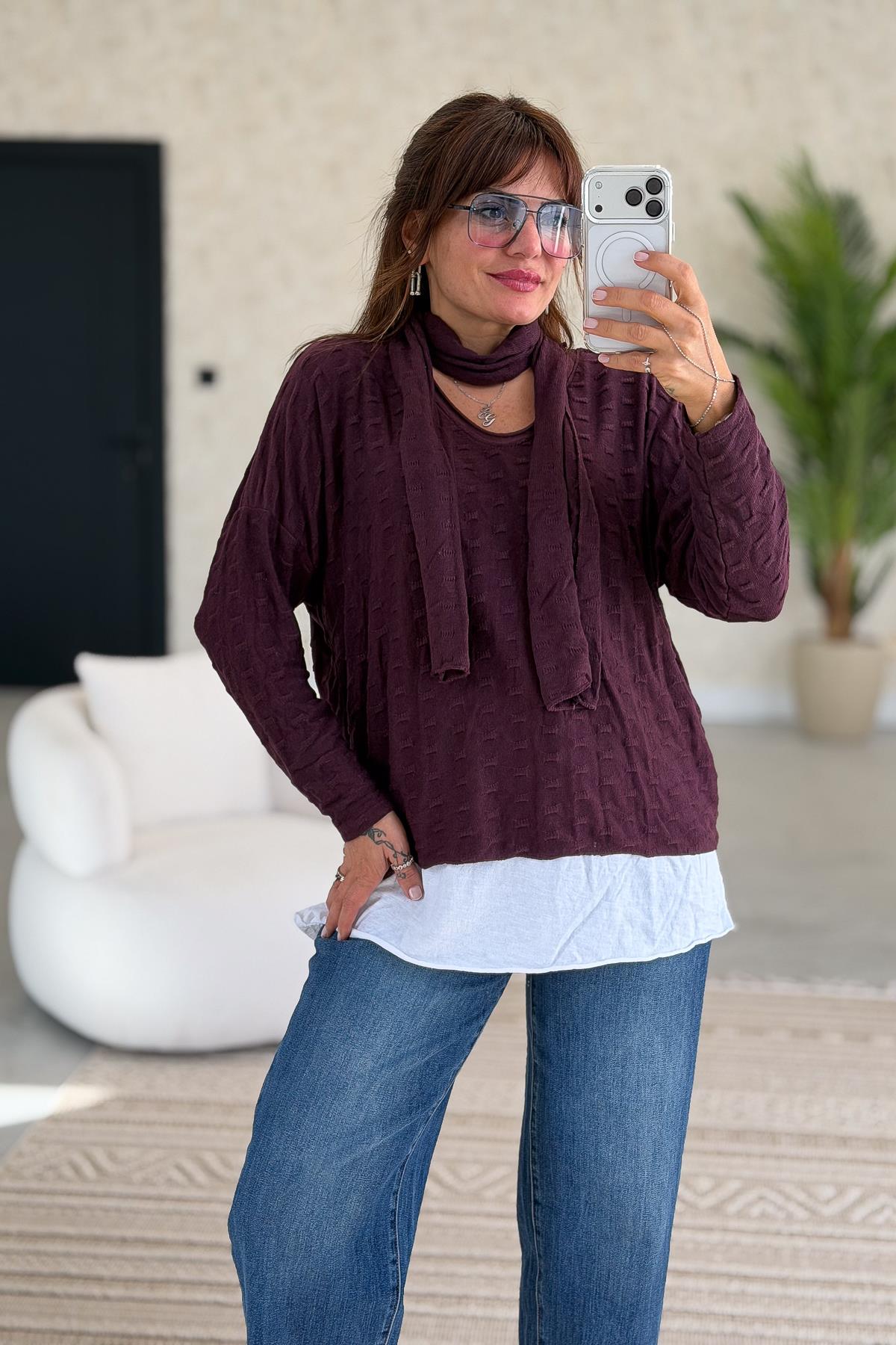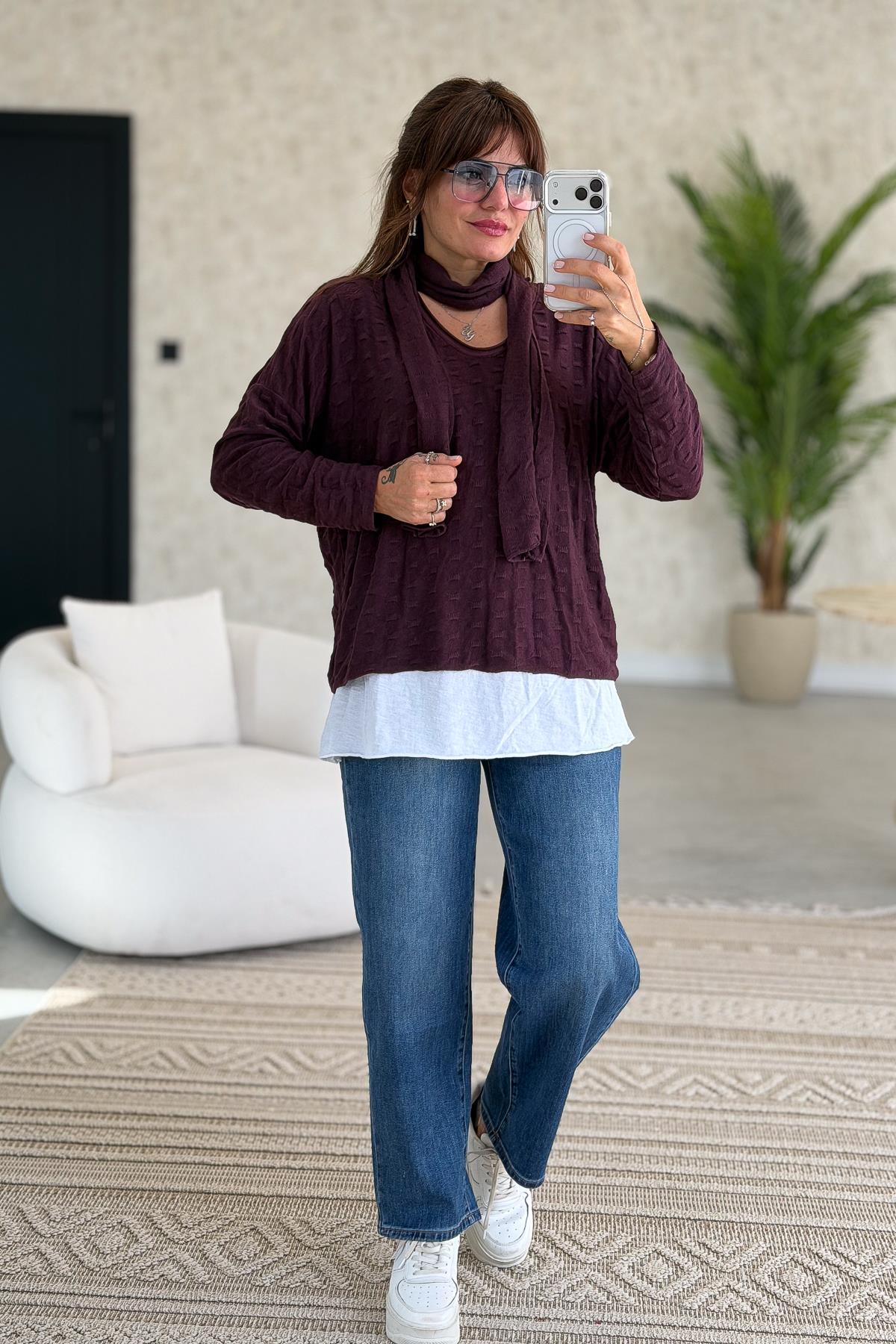 İç Astarı Pamuklu Üstü Trikolu Şallı Takım Bluz Mürdüm Renk