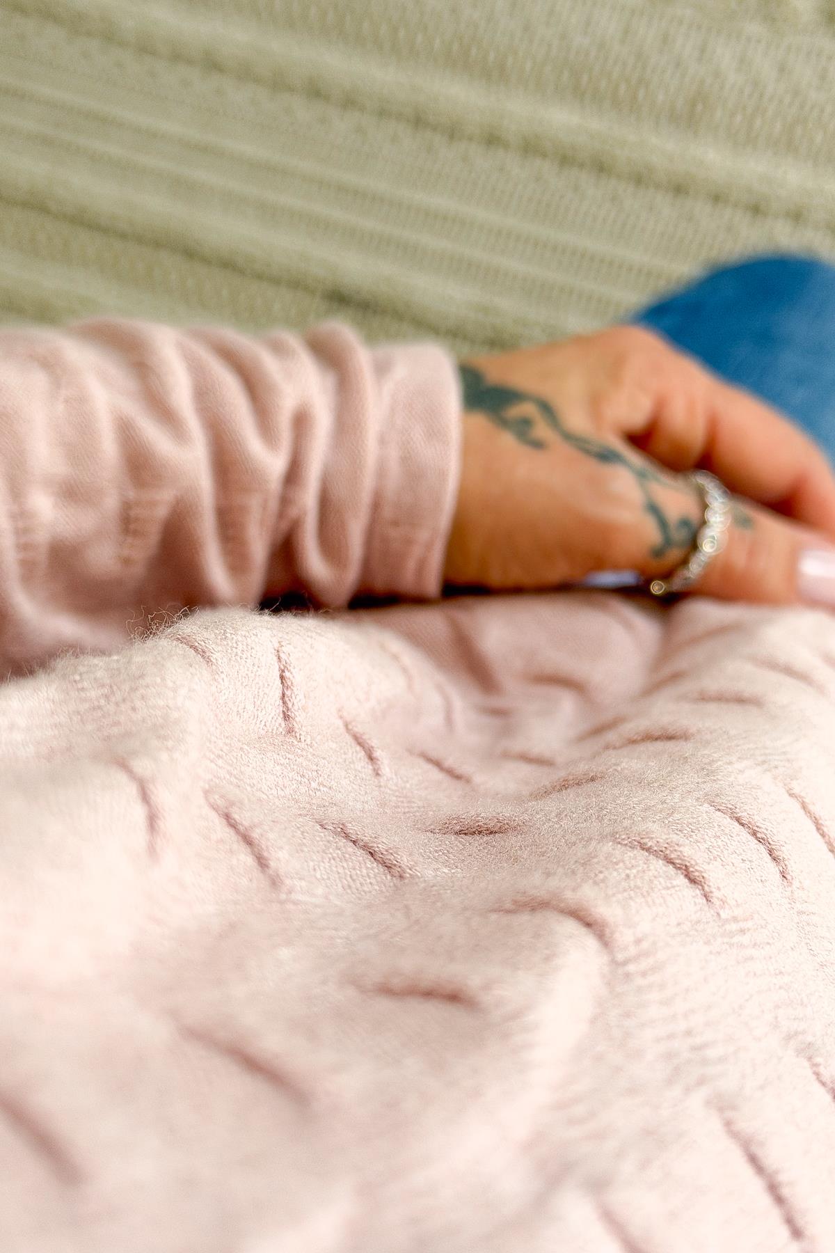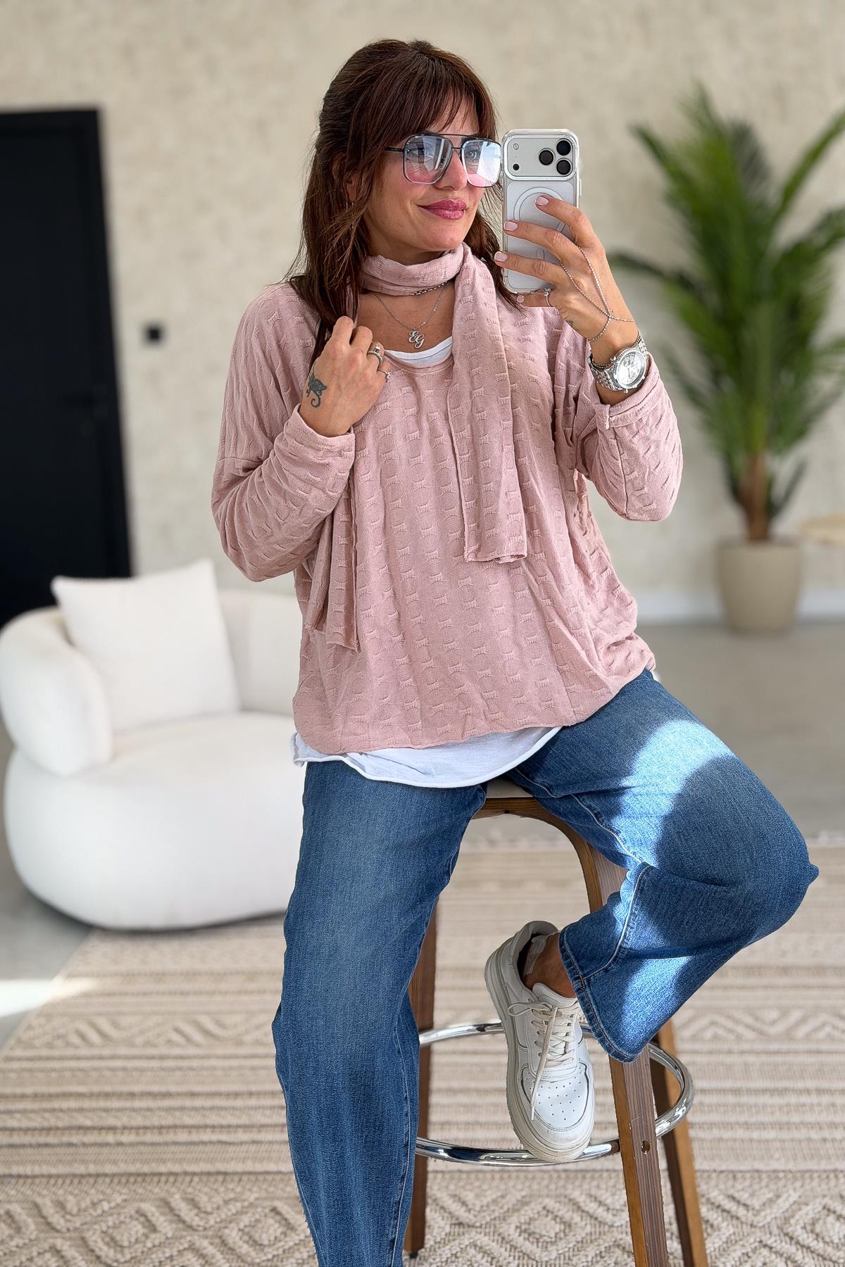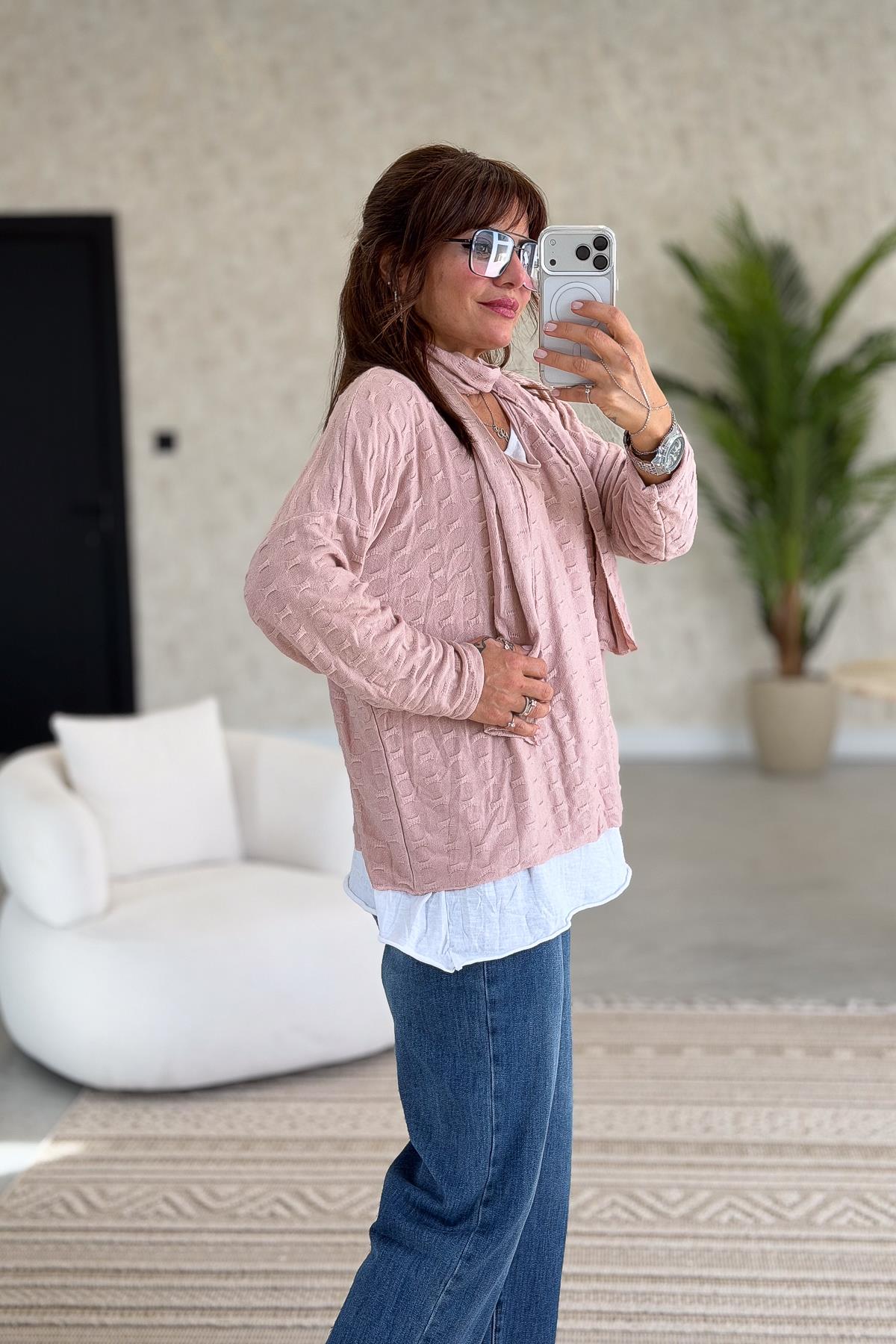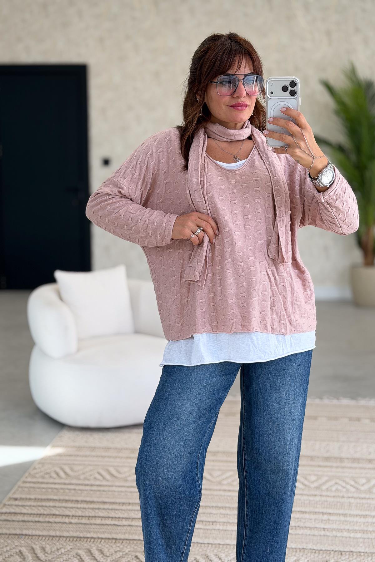 İç Astarı Pamuklu Üstü Trikolu Şallı Takım Bluz Pudra Renk