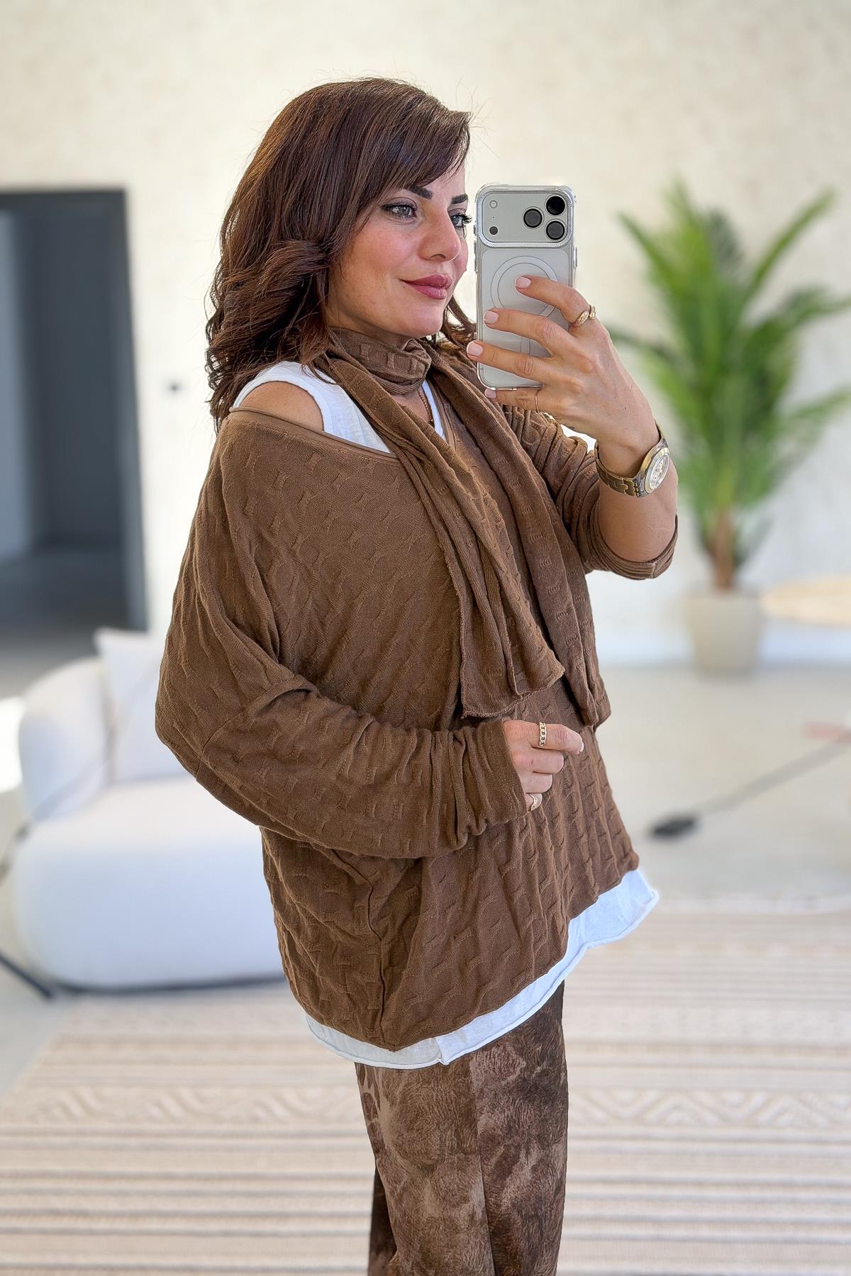 İç Astarı Pamuklu Üstü Trikolu Şallı Takım Bluz Taba Renk