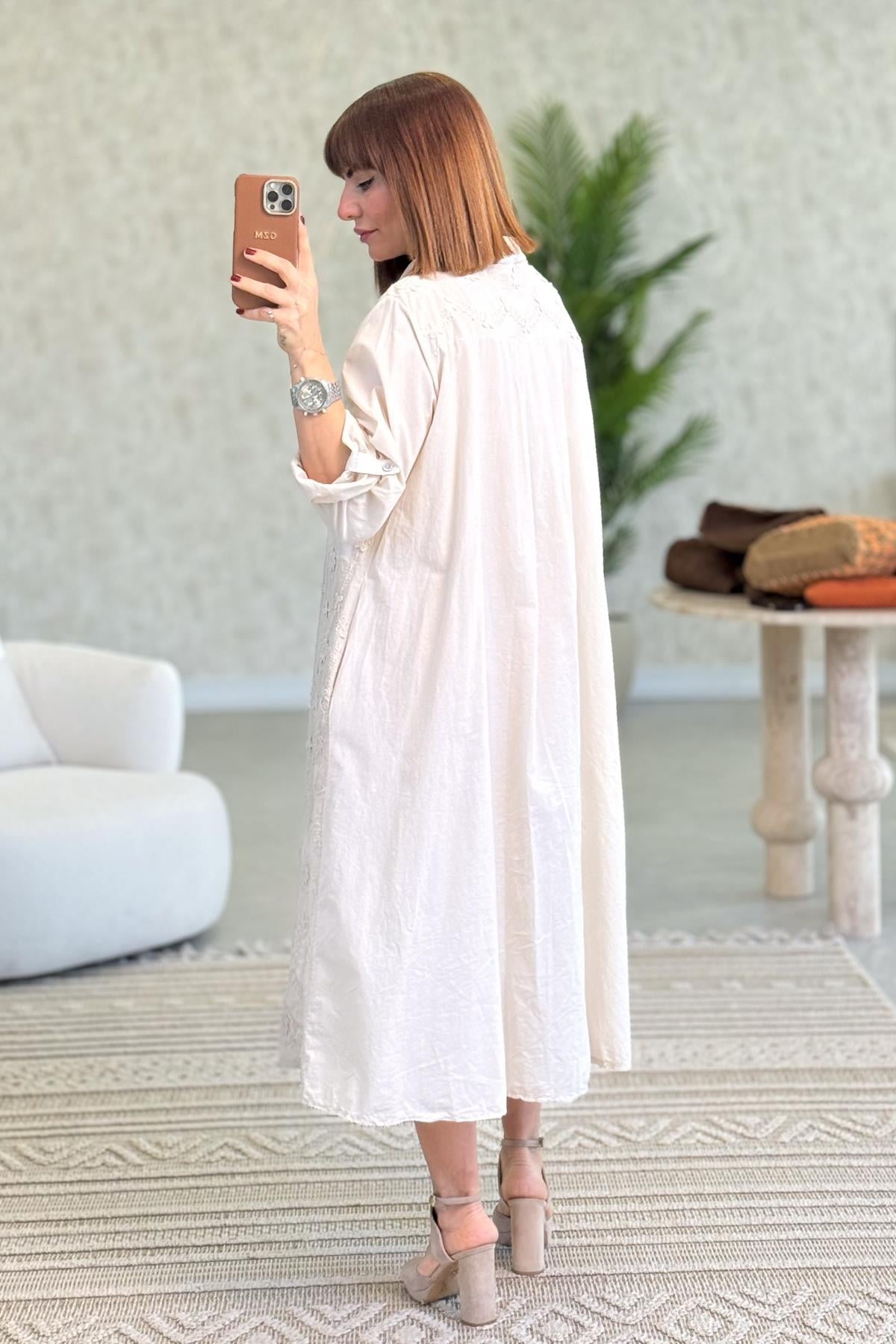 Kabartma Çiçekli Pamuklu Gömlek Elbise Bej Renk
