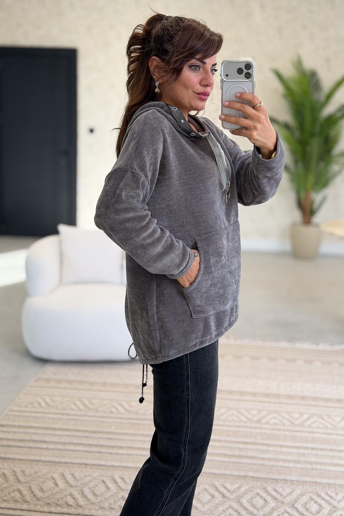 Kapüşonu Halka Taş Detaylı Kadife Sweet Gri Renk