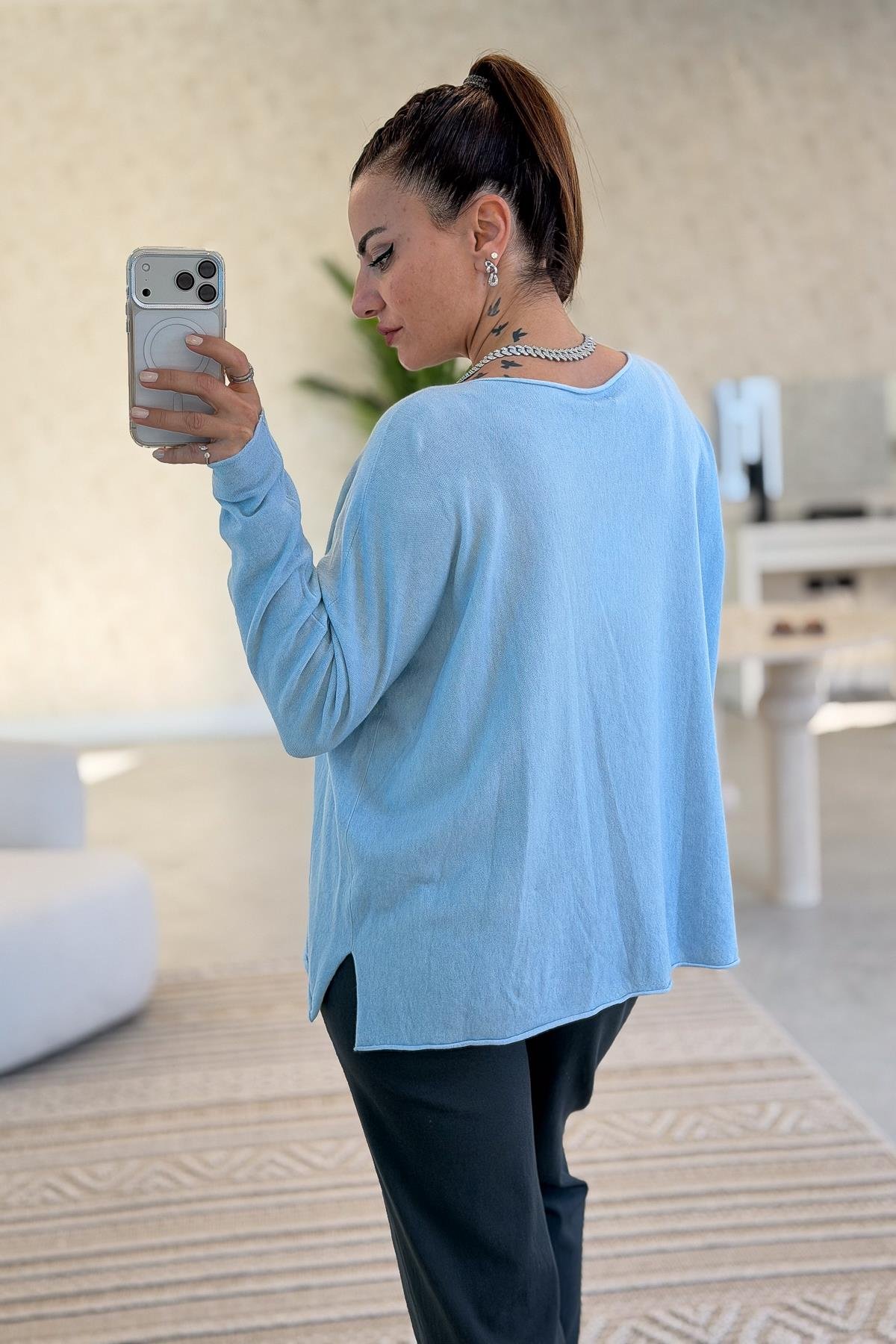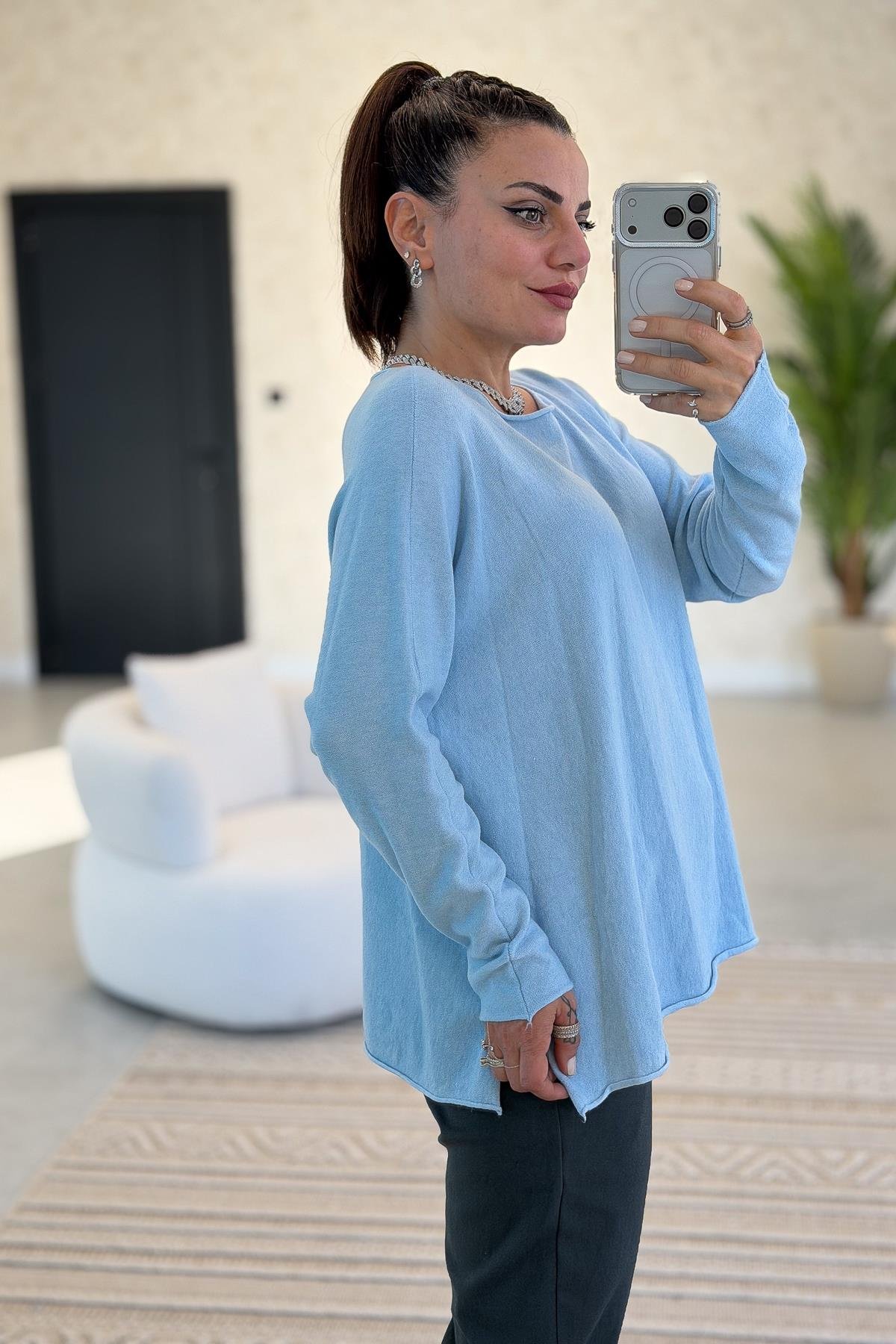 Kayık Yaka Kuzu Yünü Triko Bebe Mavi Renk