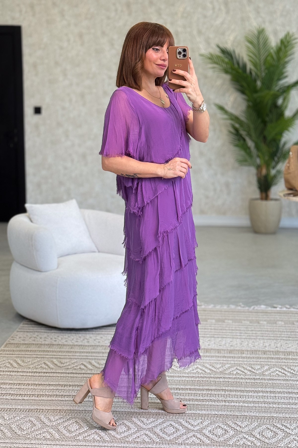 Kısa Kollu Kat Kat İpek Elbise Mor Renk