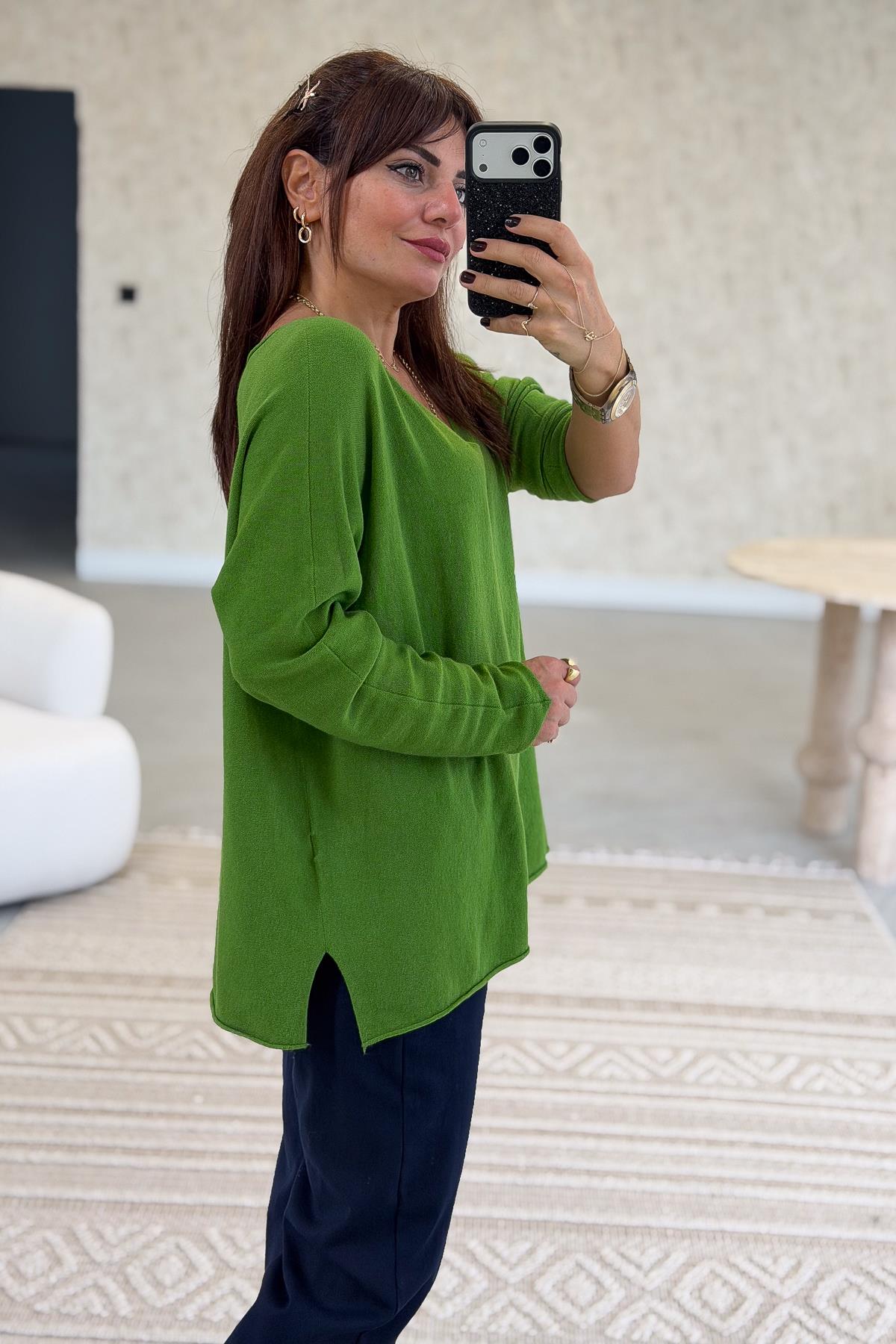 Kuzu Yünü V Yaka Triko Yeşil Renk