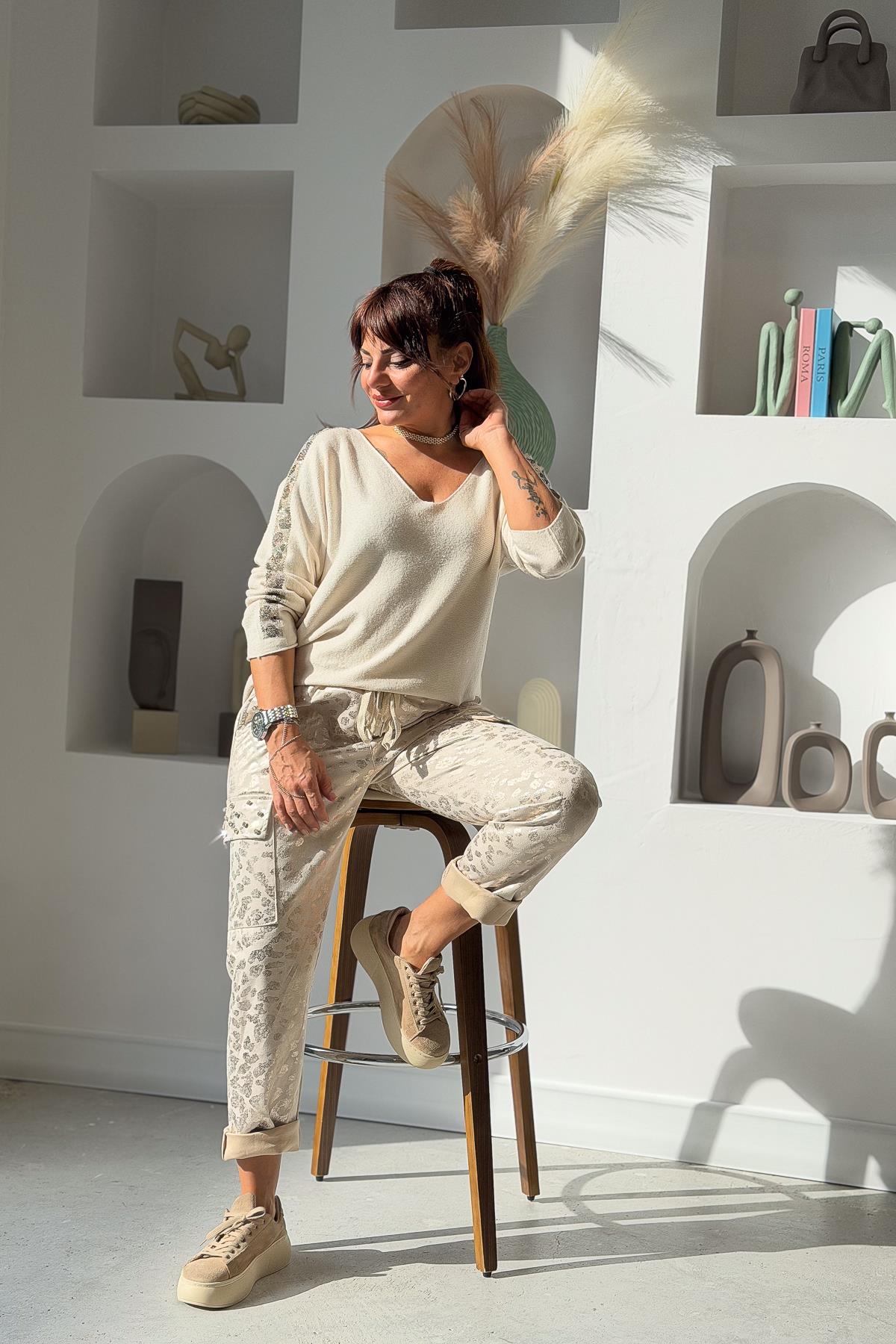 Leopar Desen Zımba Taşlı Kargo Cepli Pantolon Bej Renk