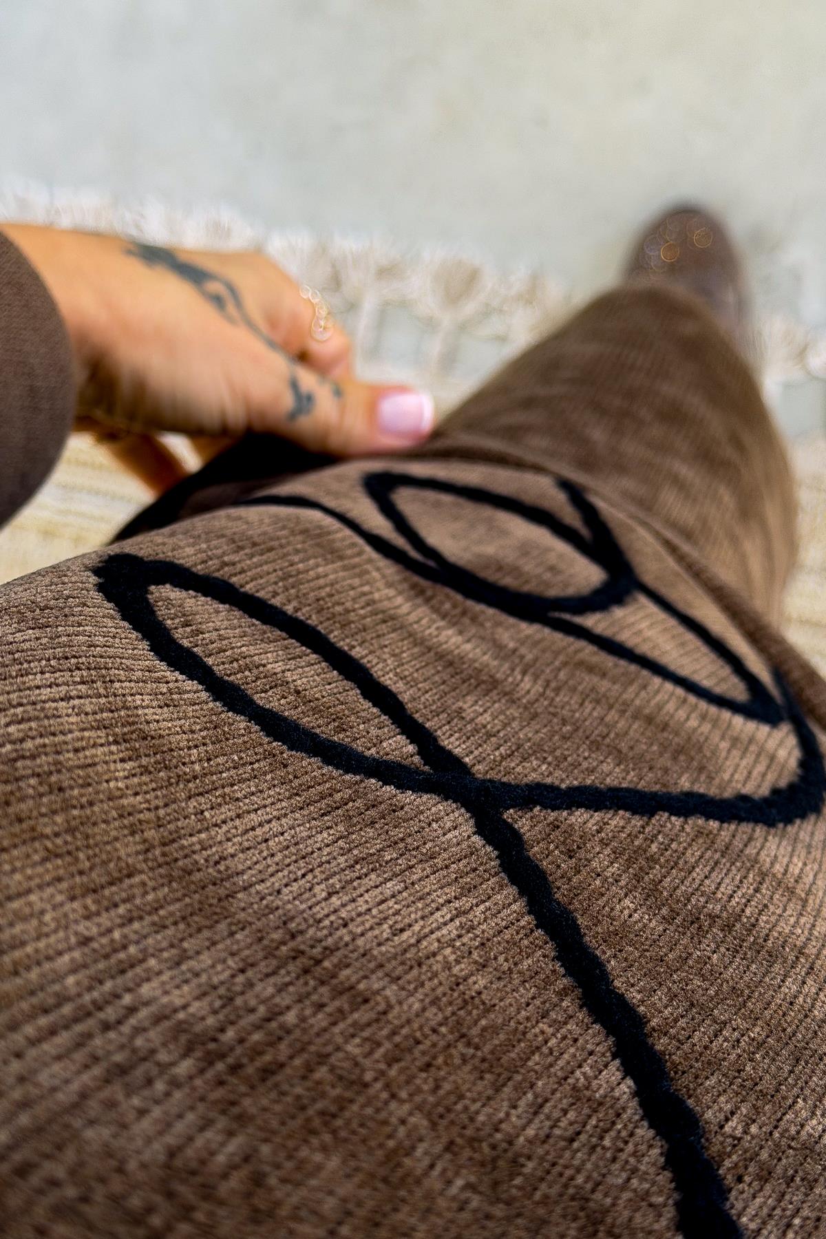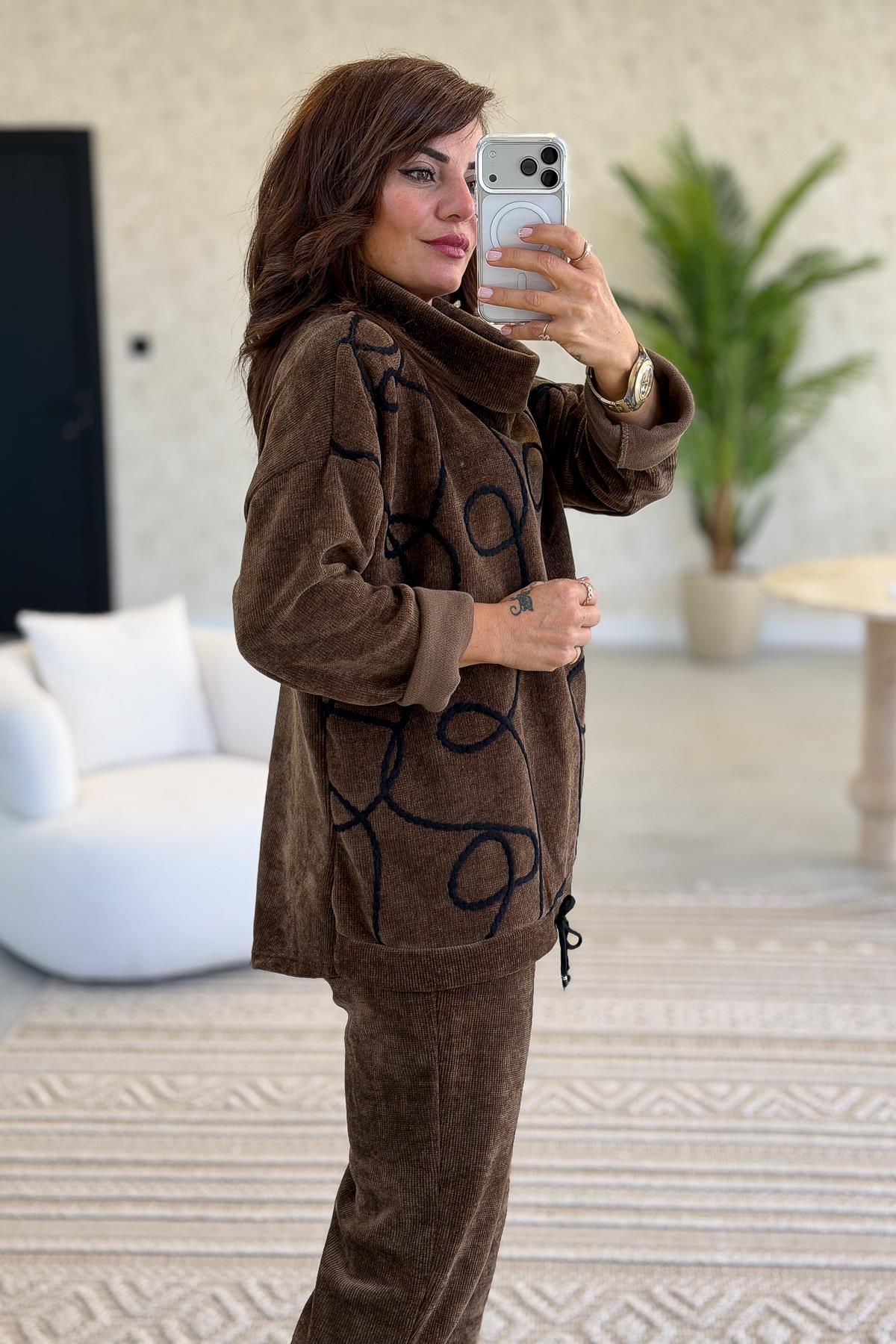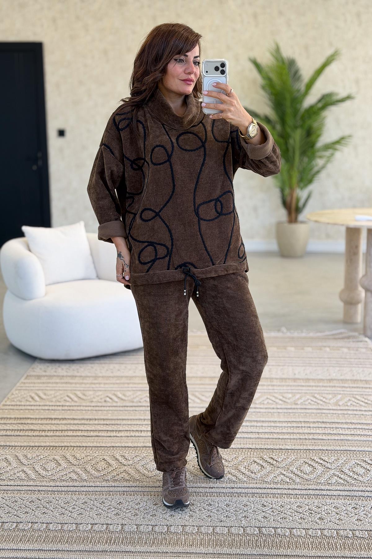 Örgü Halat Desenli Alt Üst Kadife Takım Kahverengi Renk