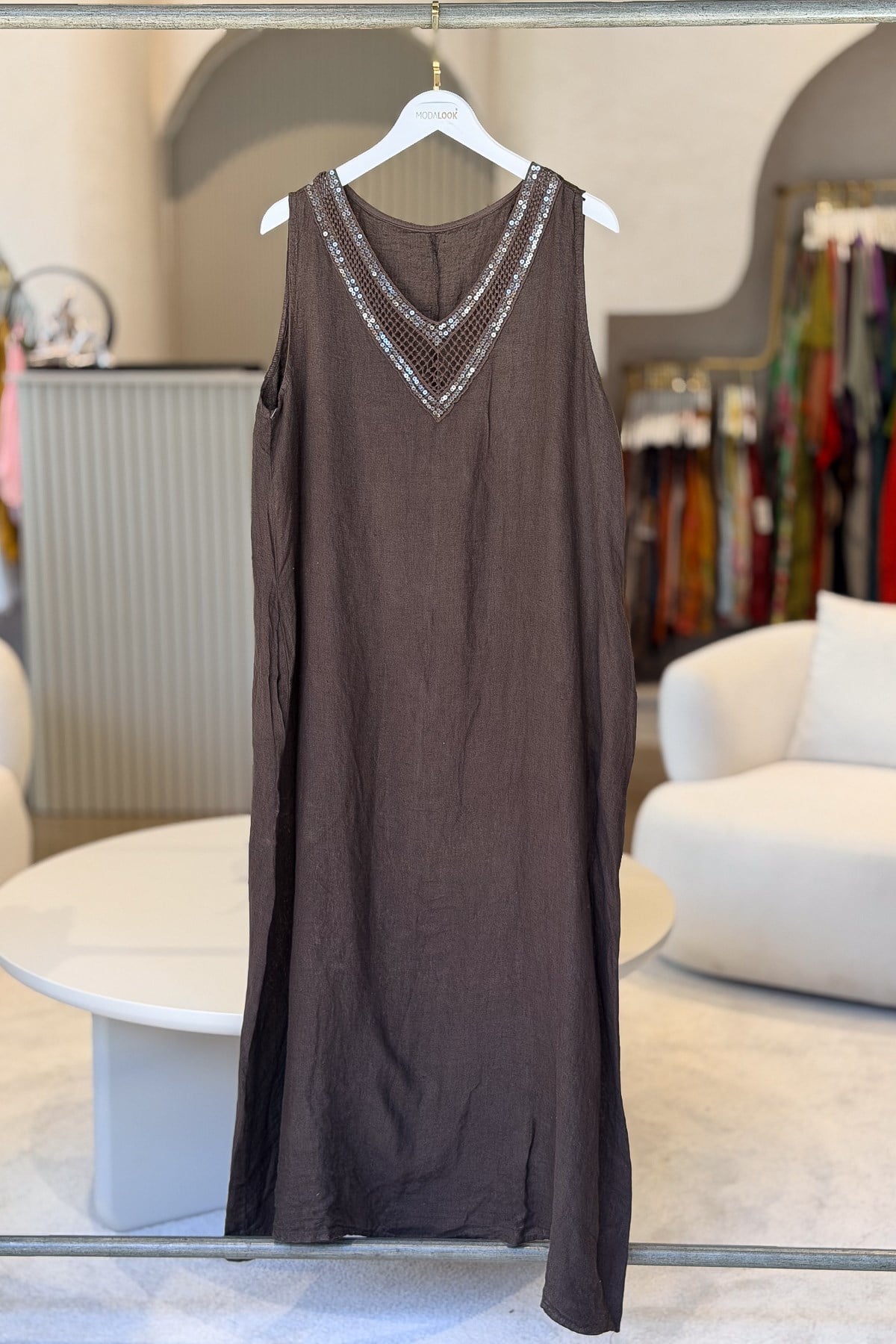 Pullu V Yaka Kolsuz Keten Elbise Acı Kahve Renk