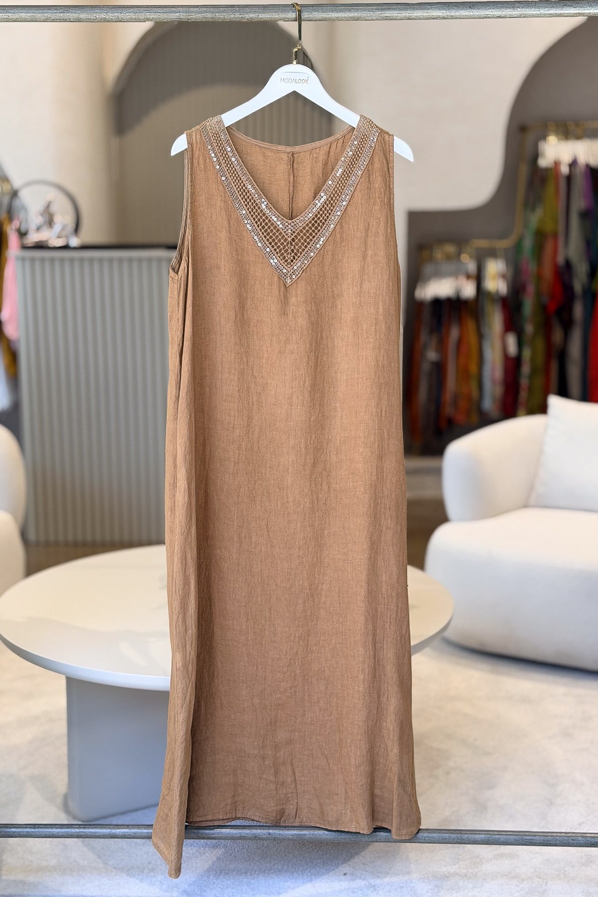 Pullu V Yaka Kolsuz Keten Elbise Camel Renk