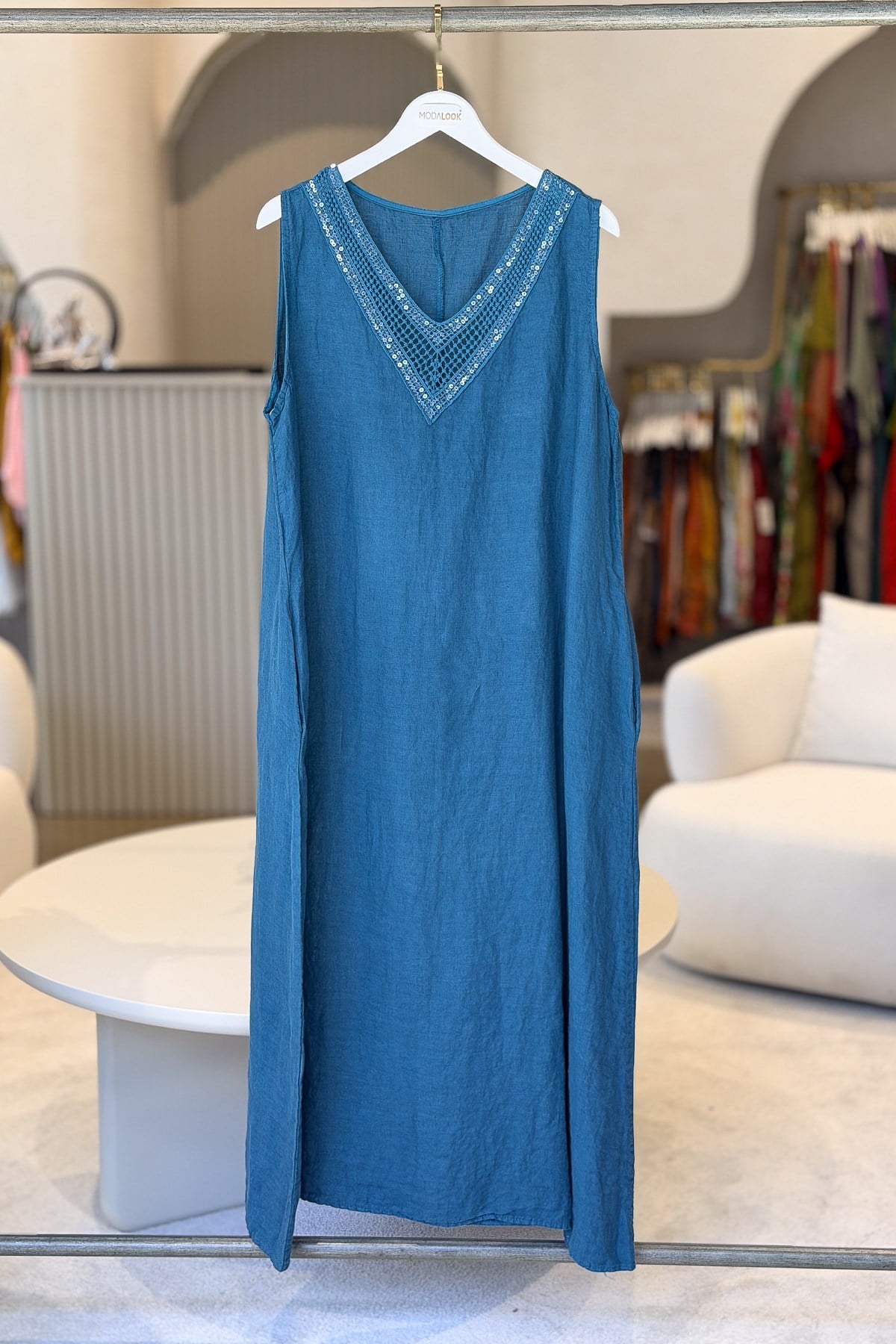 Pullu V Yaka Kolsuz Keten Elbise Petrol Mavisi Renk