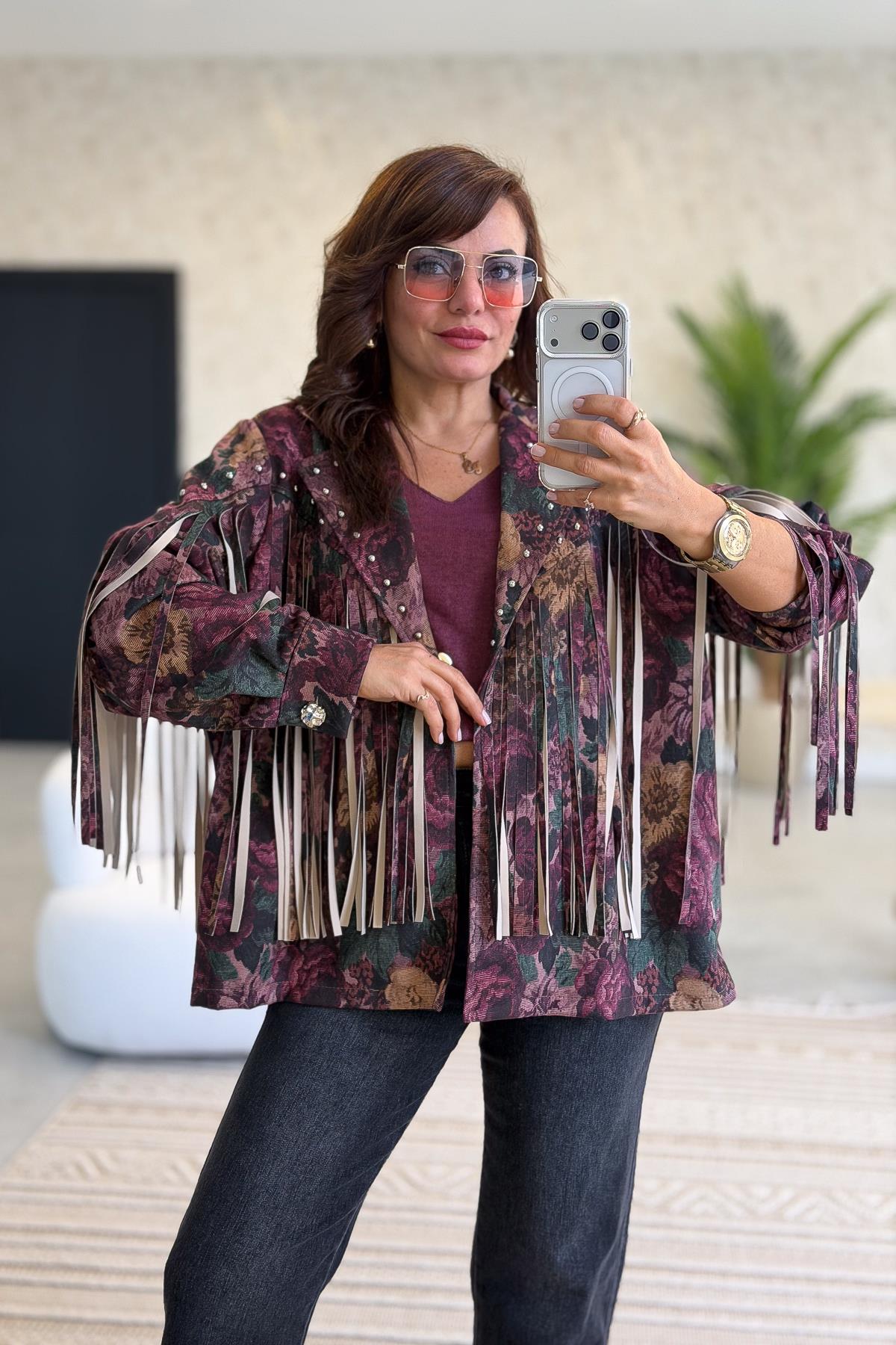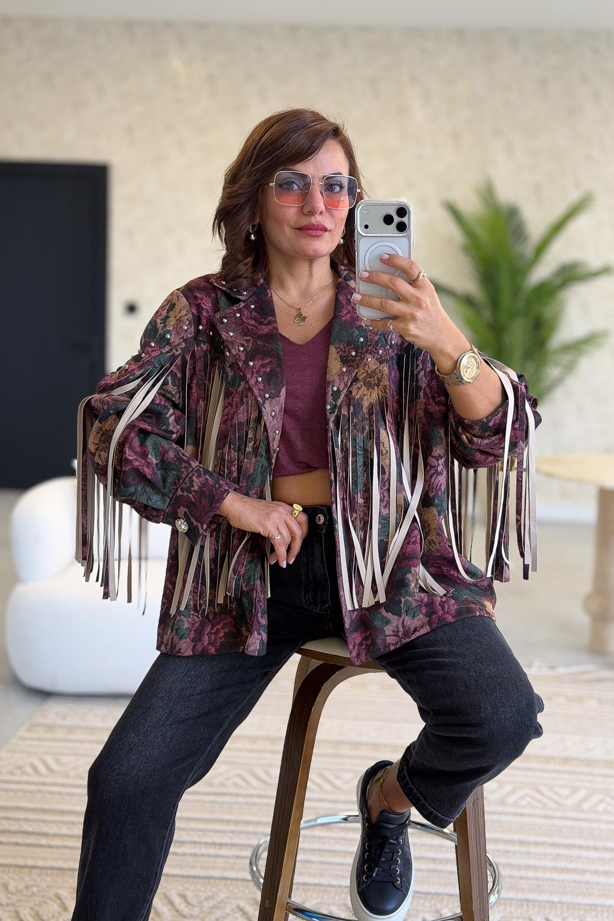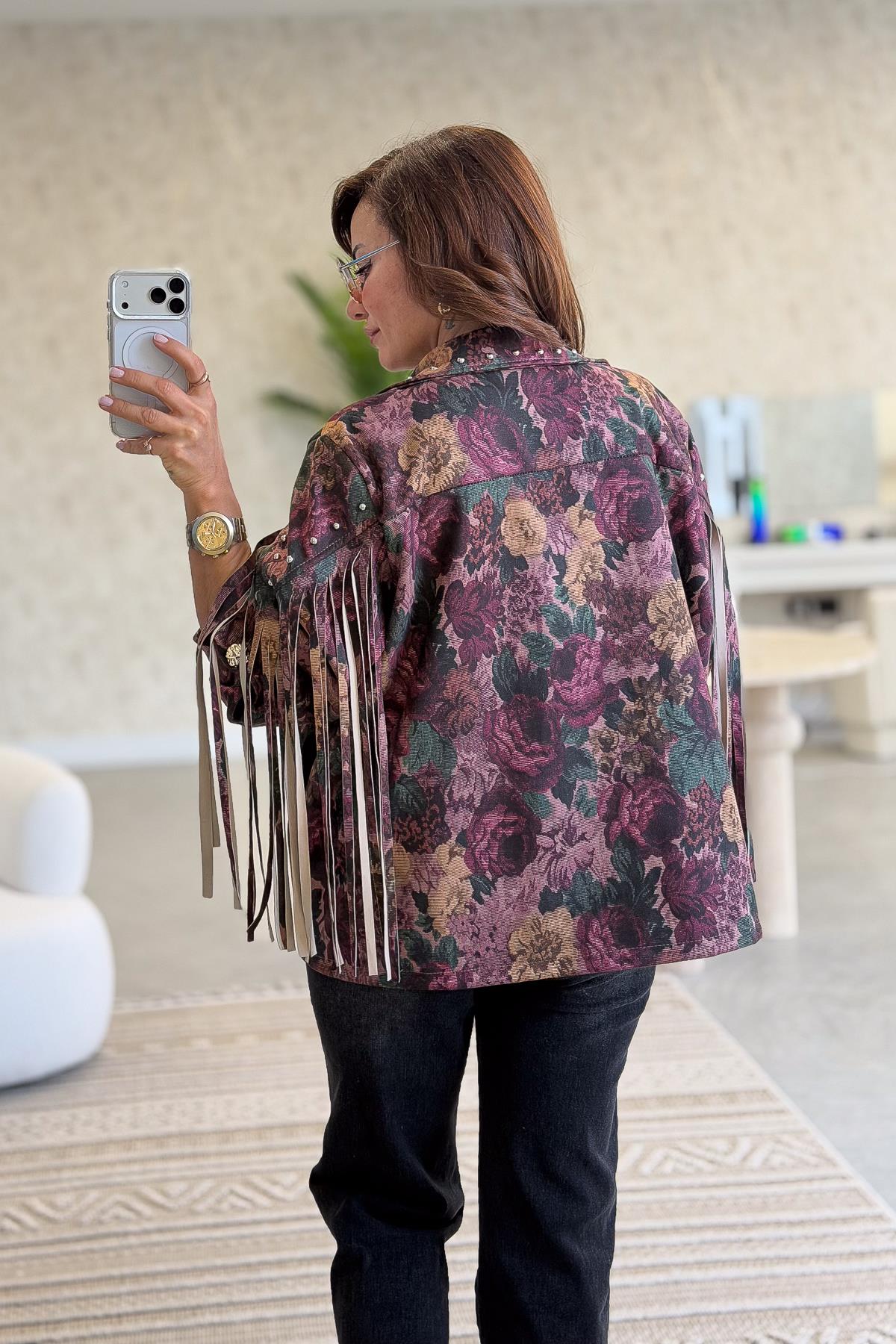 Püskül Ve Zımba Detaylı Gül Desenli Güderi Ceket Mürdüm Renk