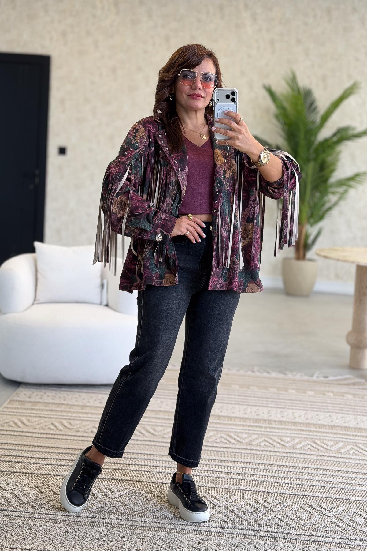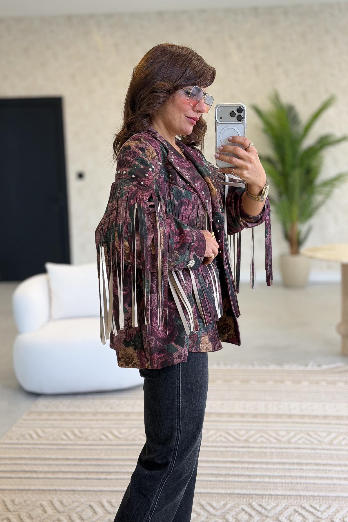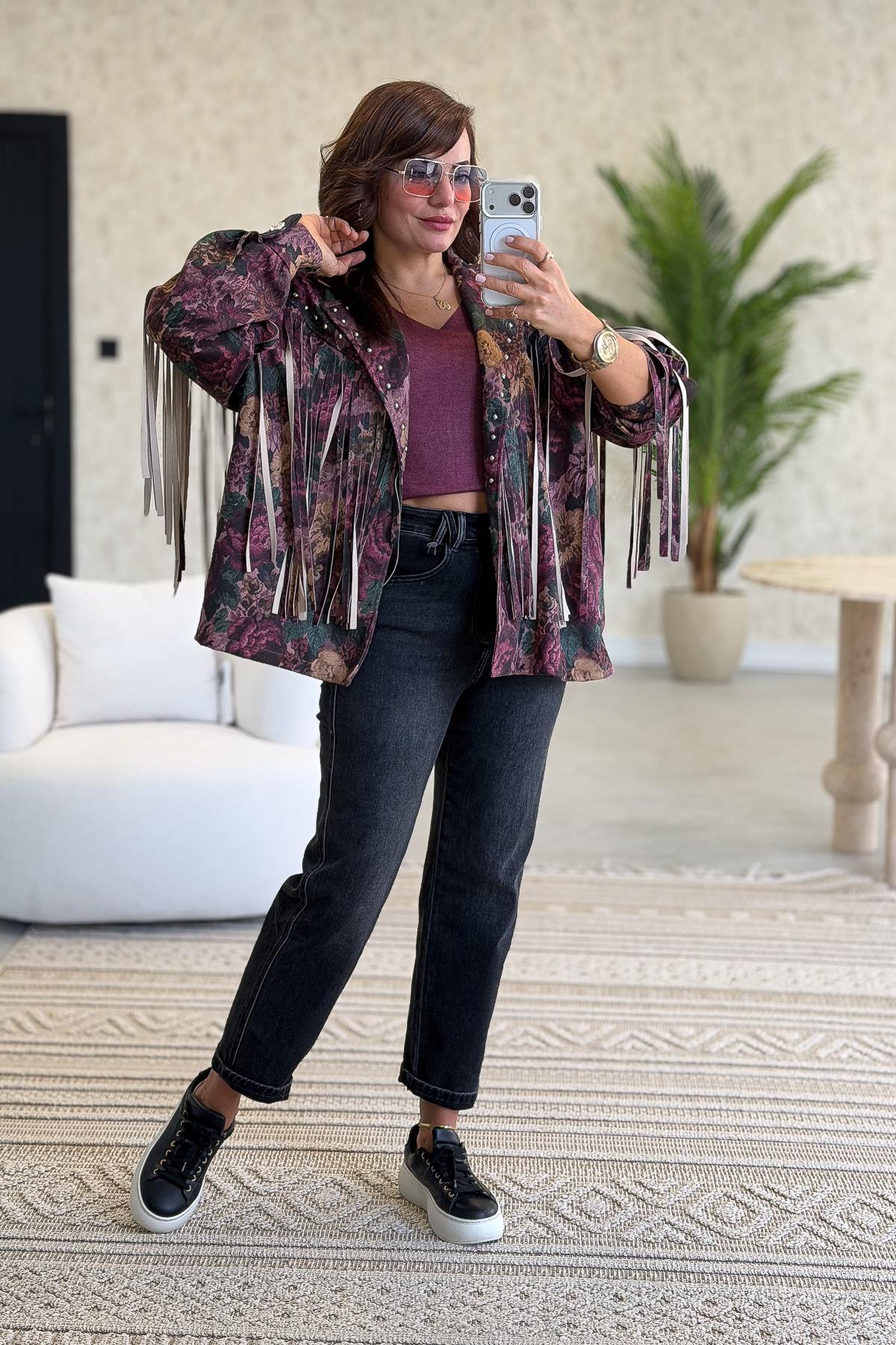 Püskül Ve Zımba Detaylı Gül Desenli Güderi Ceket Mürdüm Renk