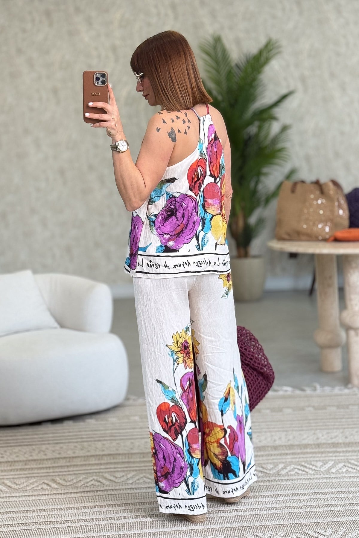 Renkli Çiçekli Askılı Bluz Pantolonlu Viskon Alt Üst Takım Krem Renk